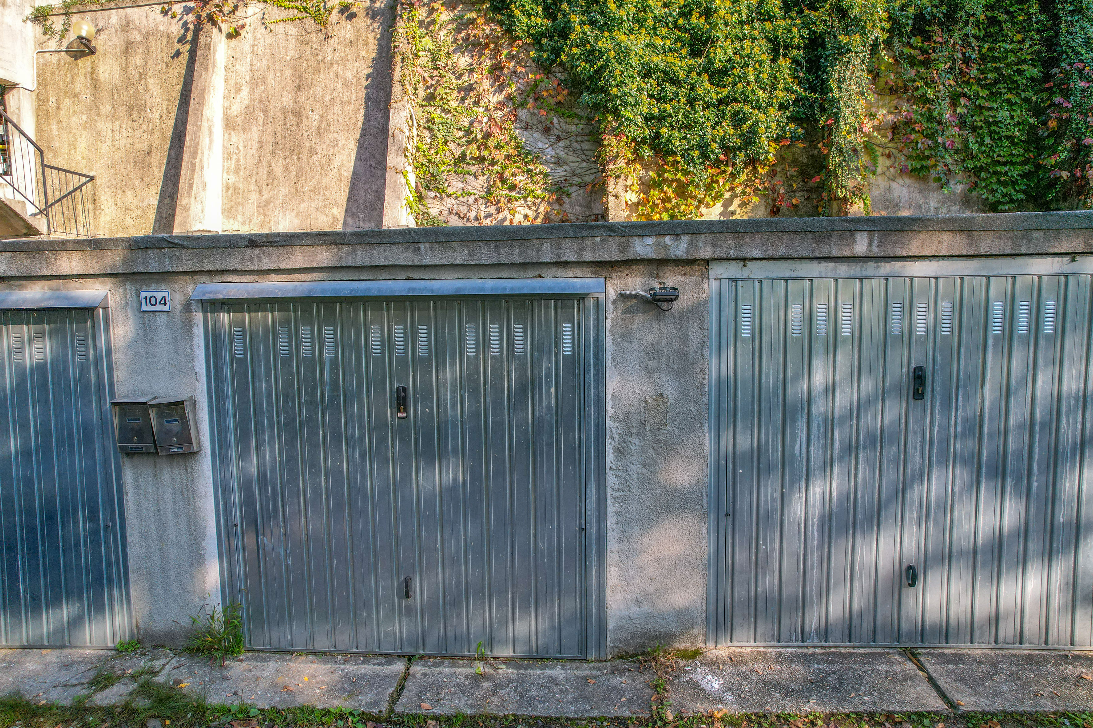 Depuis la rue, on accède à un garage simple ; l'entrée de l'appartement se fait en montant 75 marches.