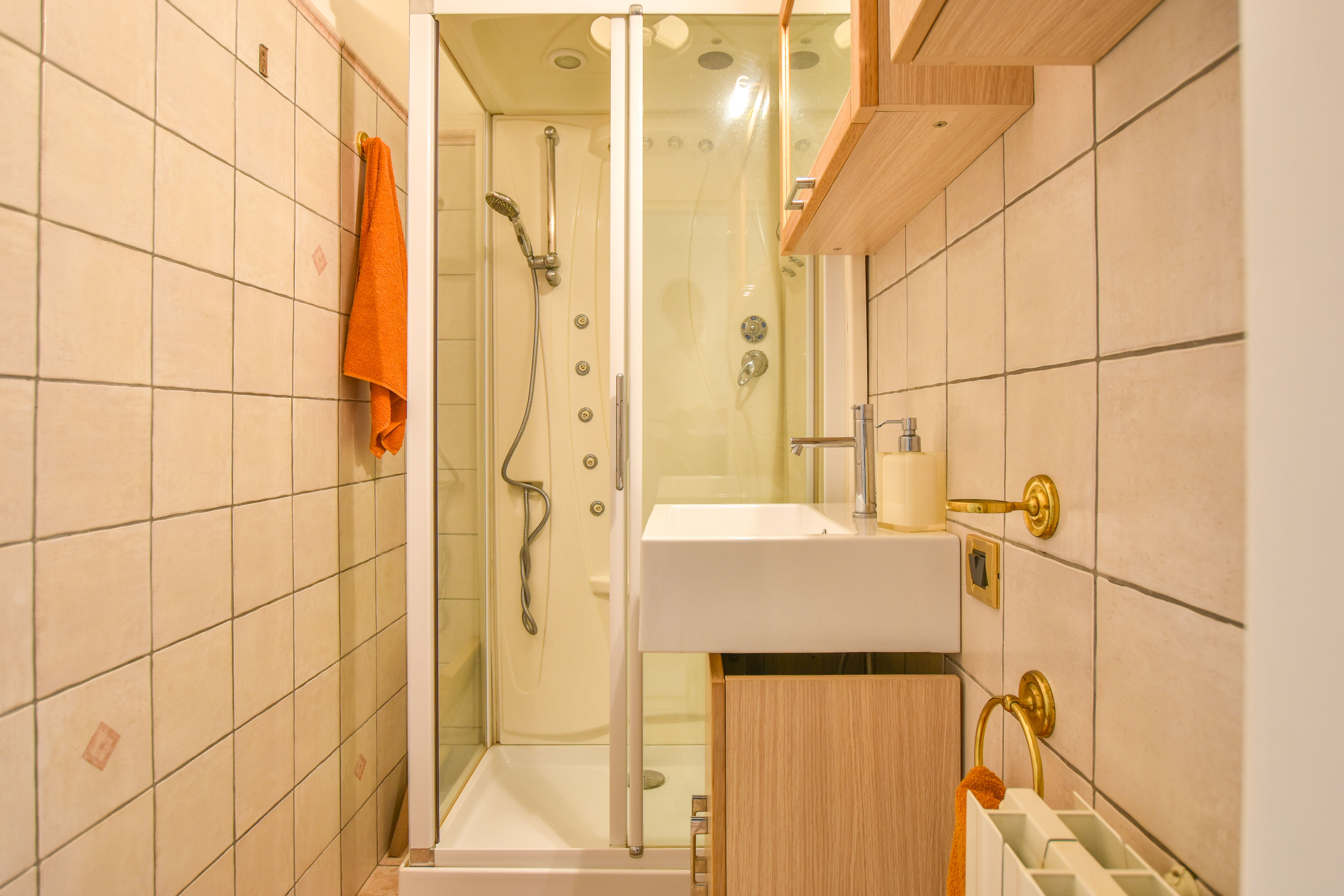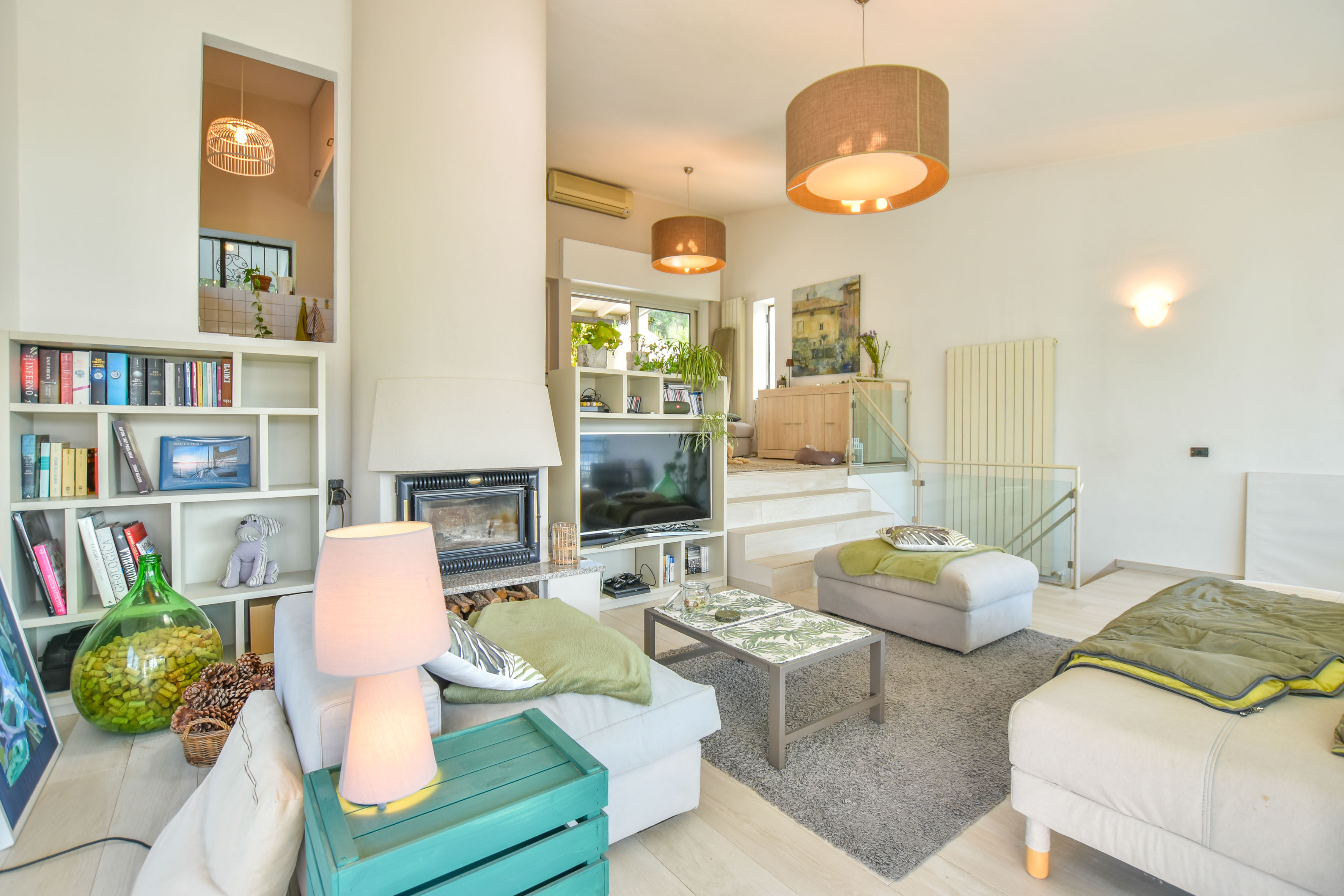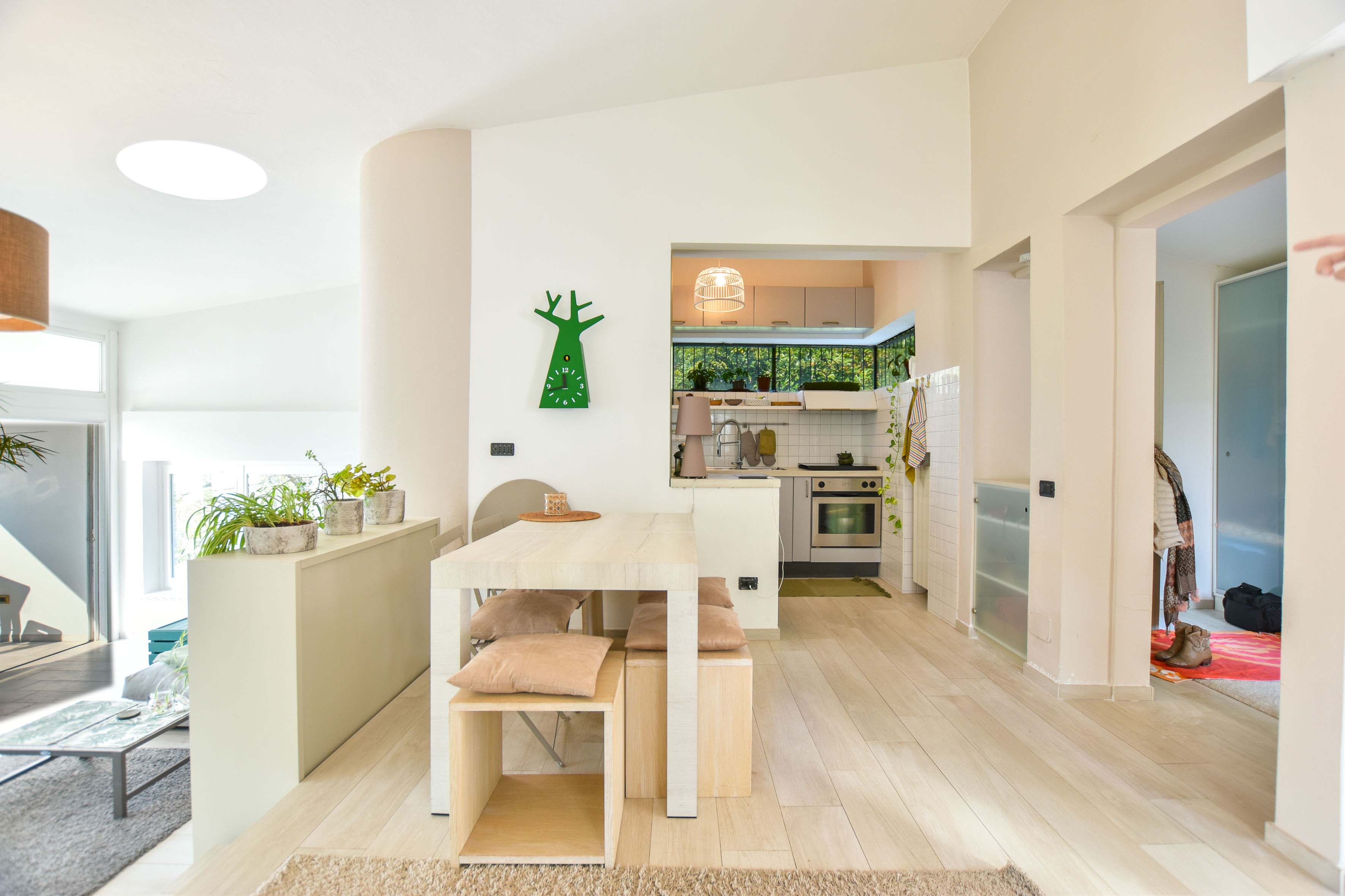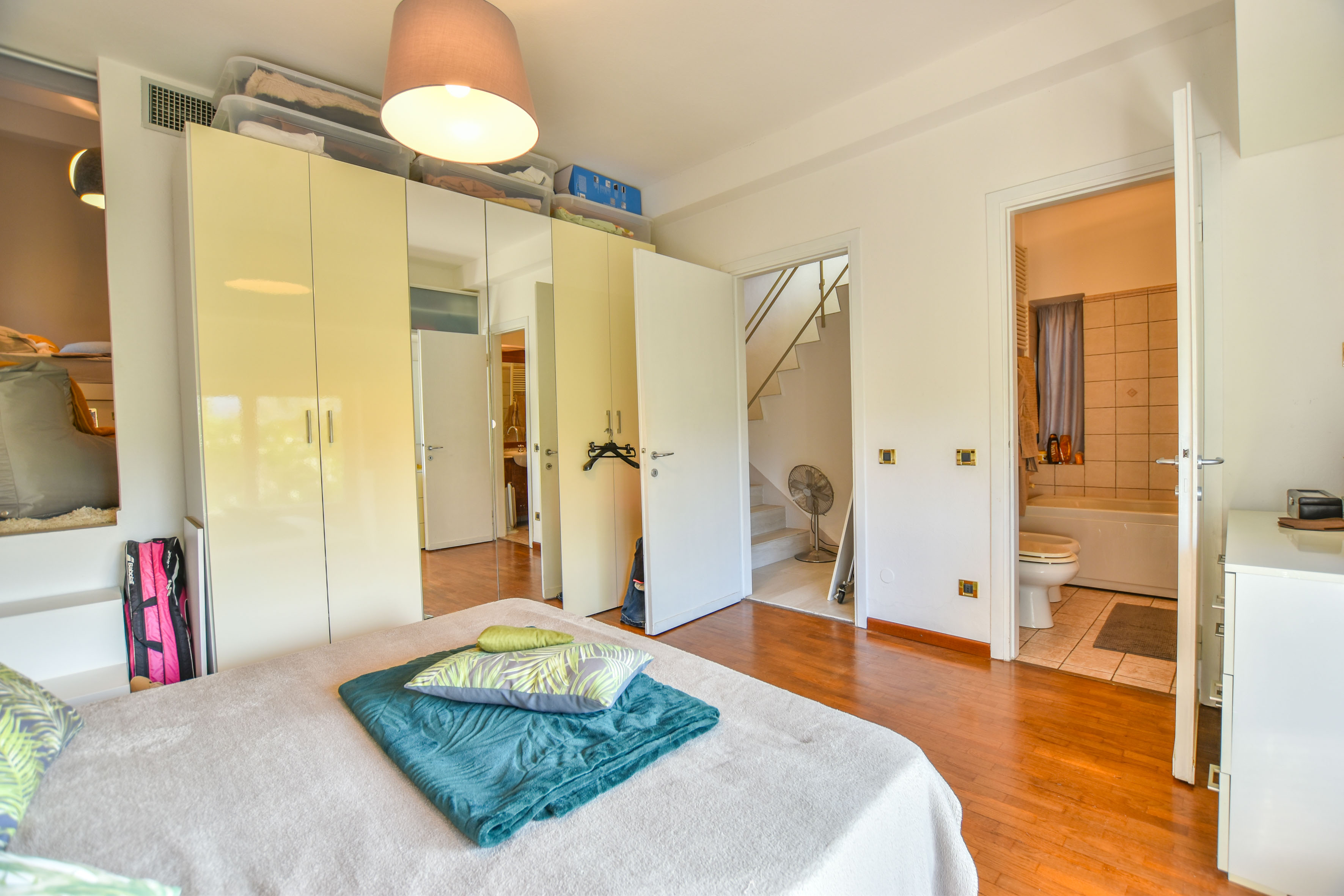L'appartement, d'une superficie totale d'environ 90 mètres carrés, est réparti sur deux niveaux et se compose comme suit : l'entrée donne sur un couloir avec un vestiaire sur mesure, suivi de l'espace de vie ouvert, qui comprend une salle à manger, une cuisine ouverte, équipée d'appareils électroménagers et d'un lave-linge, et un salon avec une cheminée en verre.