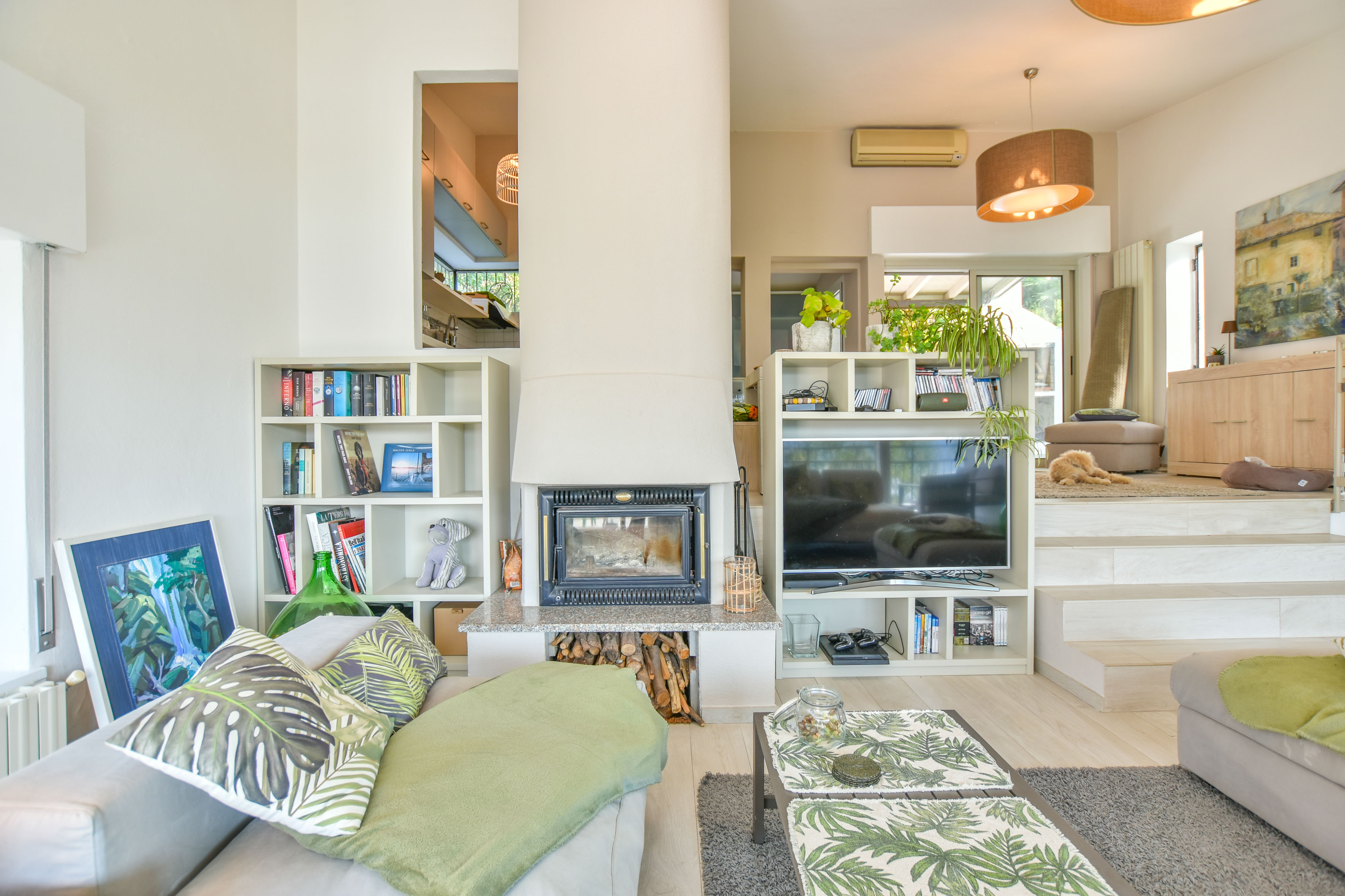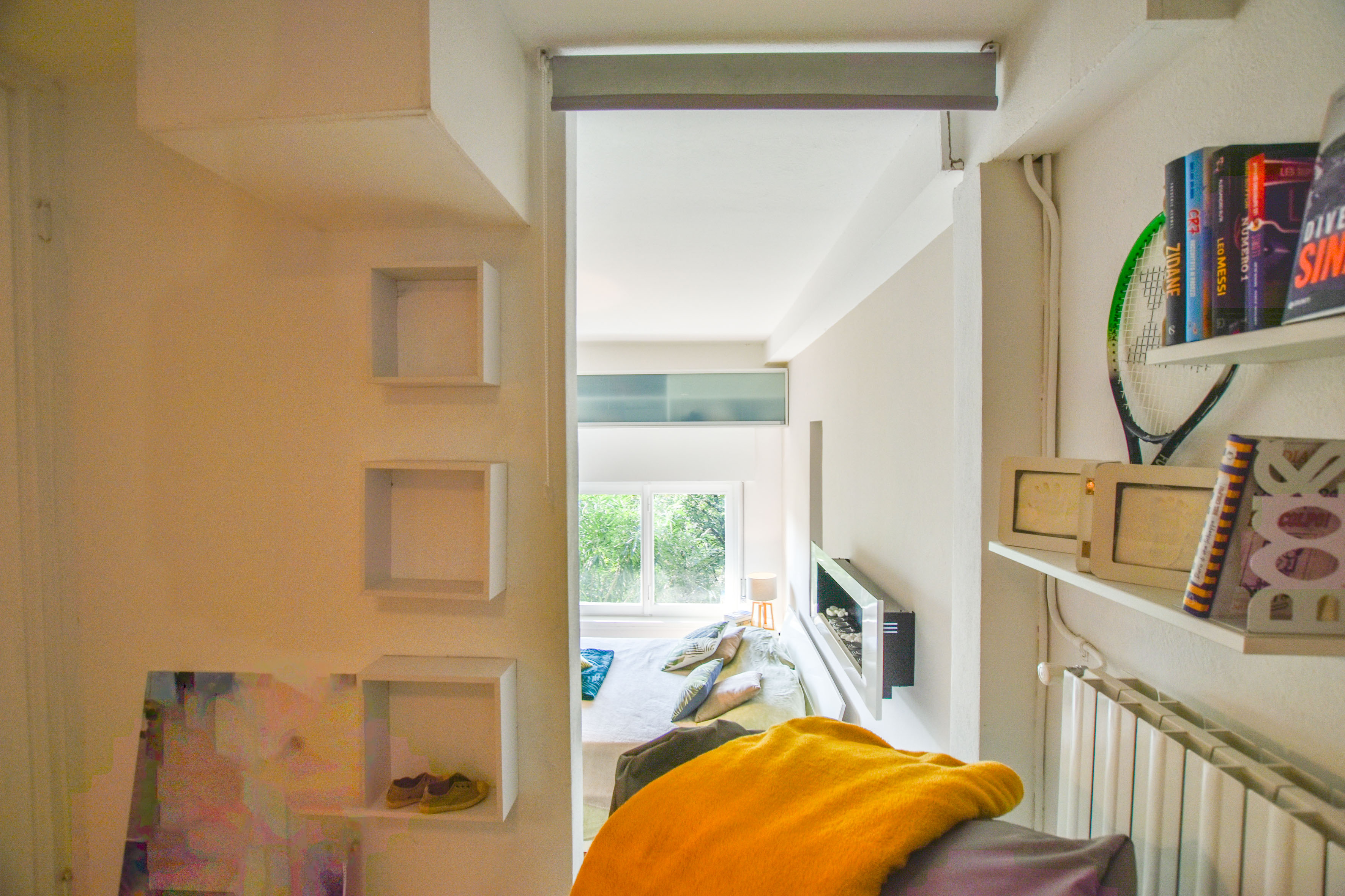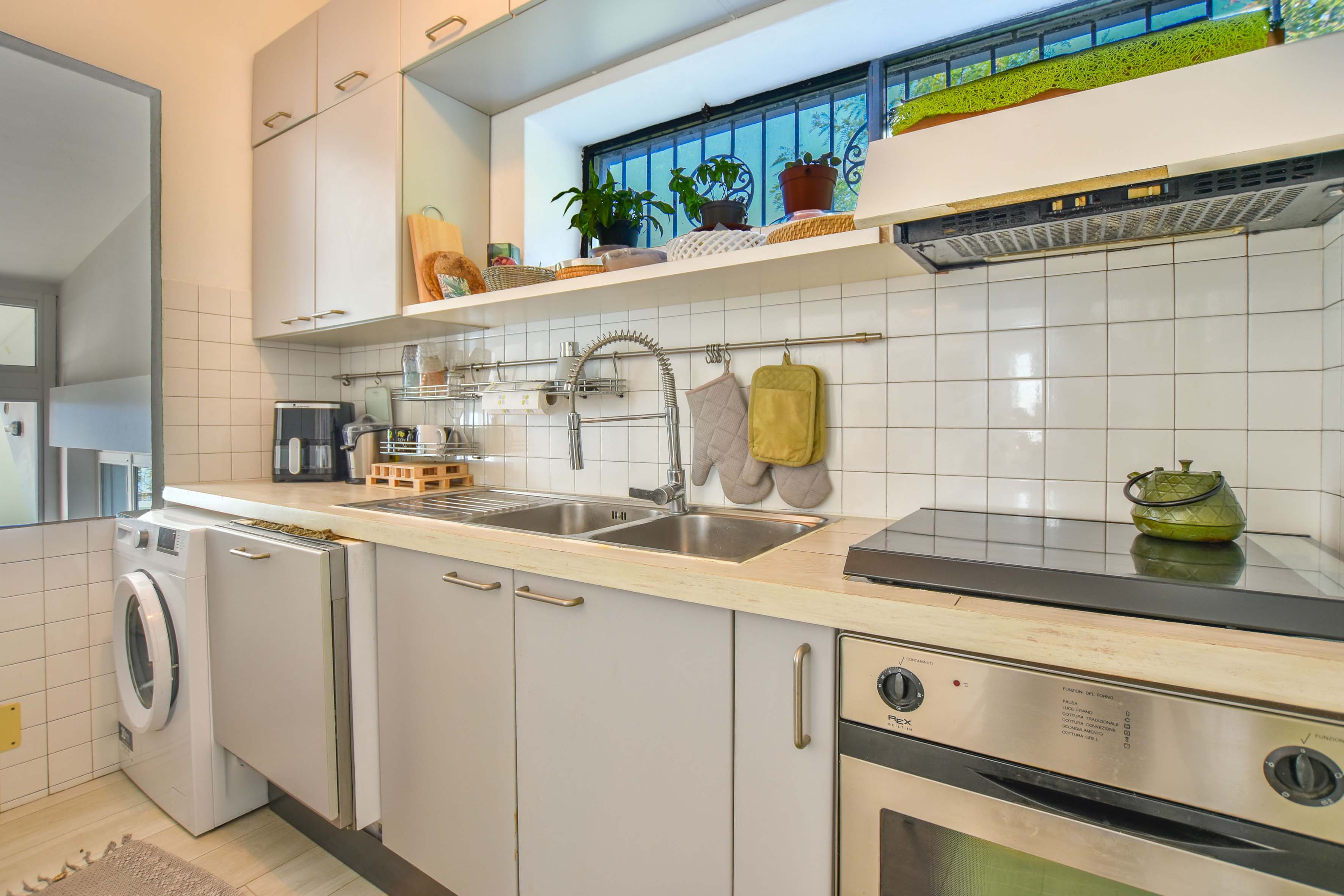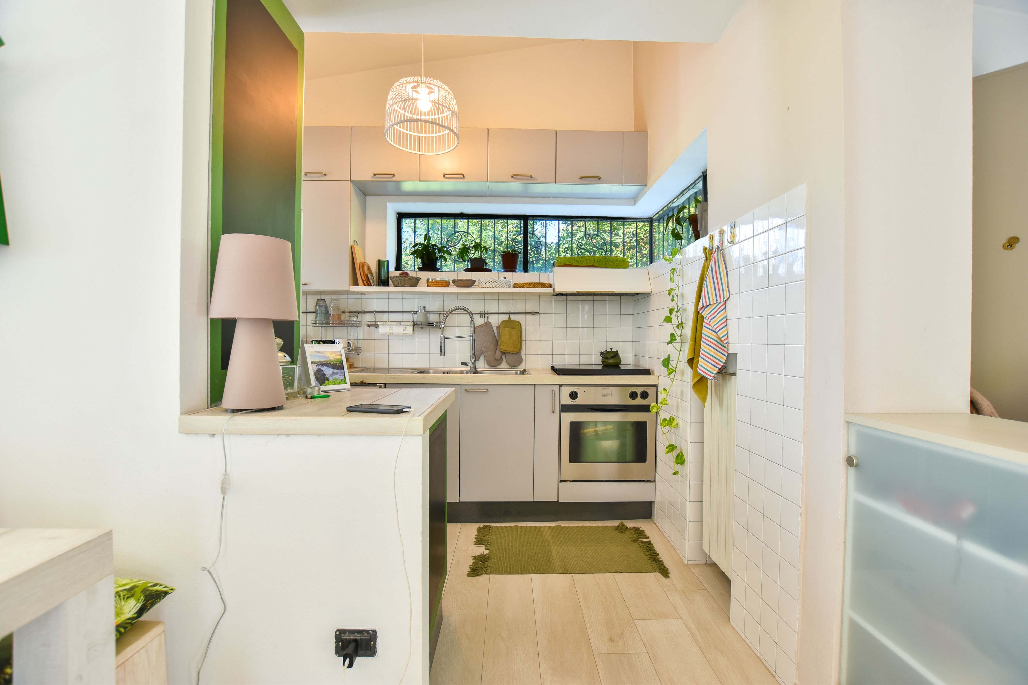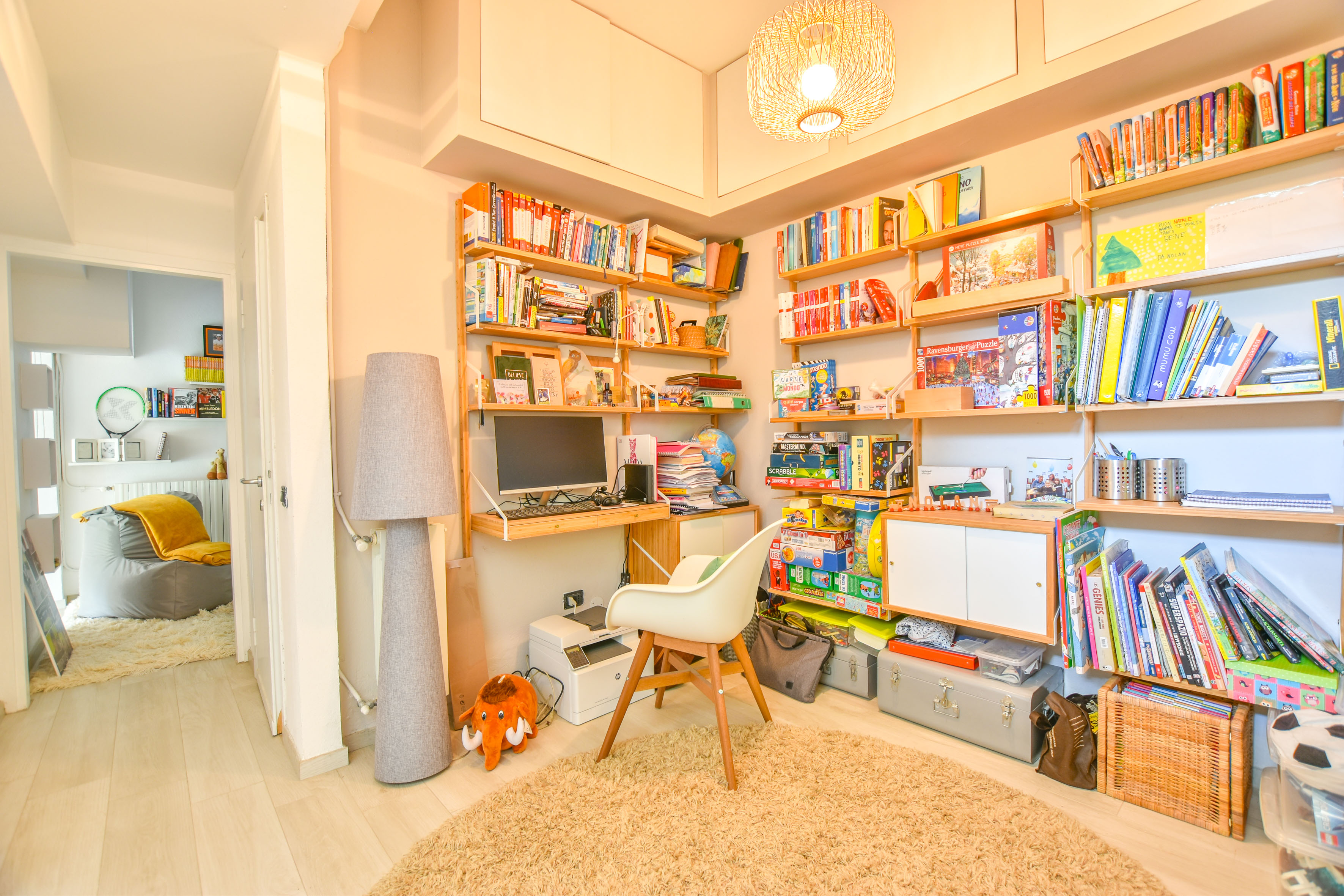L'appartement, d'une superficie totale d'environ 90 mètres carrés, est réparti sur deux niveaux et se compose comme suit : l'entrée donne sur un couloir avec un vestiaire sur mesure, suivi de l'espace de vie ouvert, qui comprend une salle à manger, une cuisine ouverte, équipée d'appareils électroménagers et d'un lave-linge, et un salon avec une cheminée en verre.