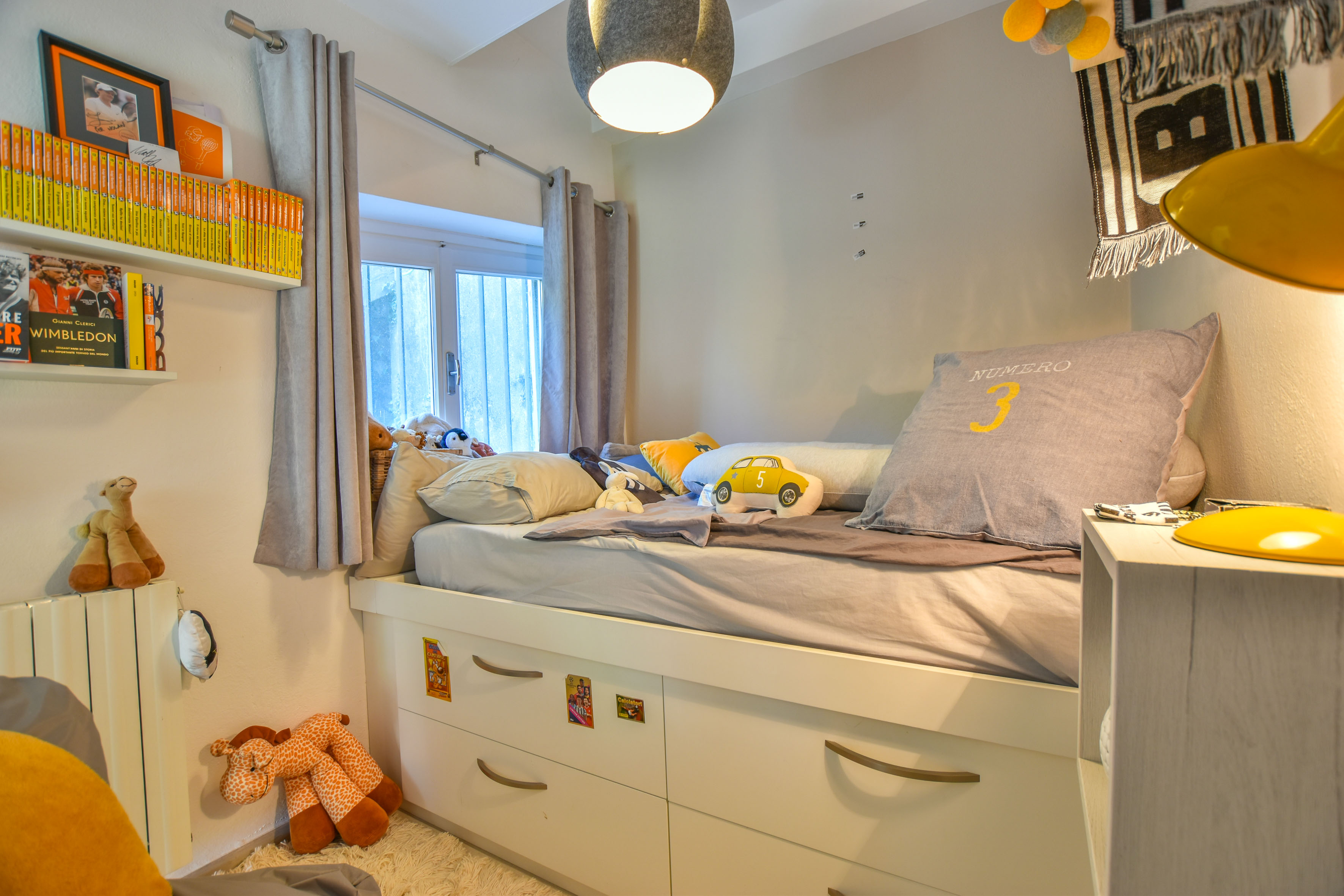 À l'étage inférieur, on trouve une salle de bains avec douche, une chambre simple et la chambre principale avec parquet et salle de bains en suite avec douche. L'étage permet la création d'une troisième chambre simple/bureau. L'étage est complété par une pièce de rangement sous l'escalier avec un local technique.