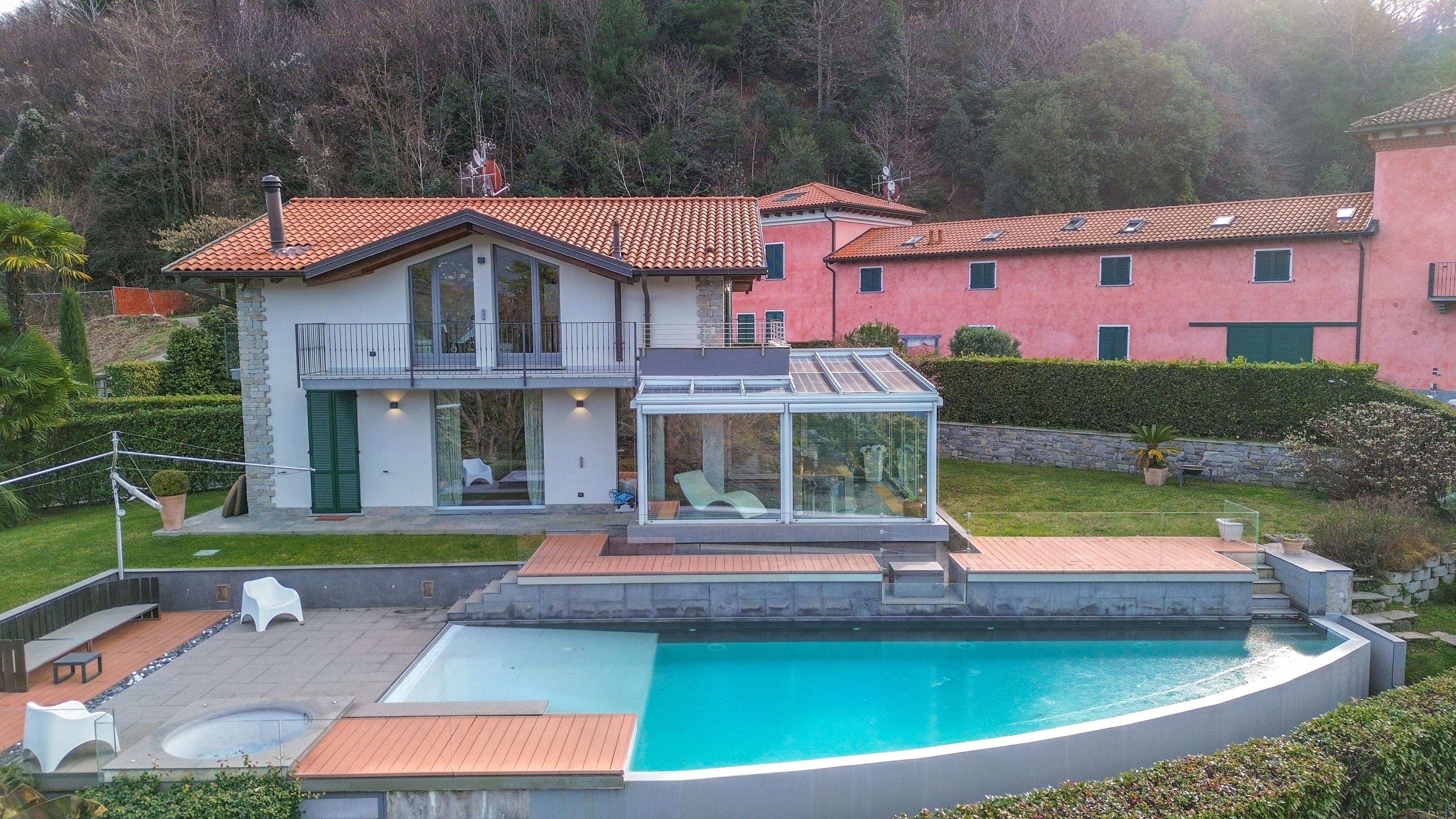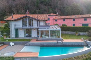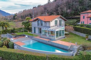 Nous proposons à la vente une villa panoramique de style moderne située à Brezzo di Bedero, en position dominante et réservée, avec une vue large et ouverte sur le lac Majeur.