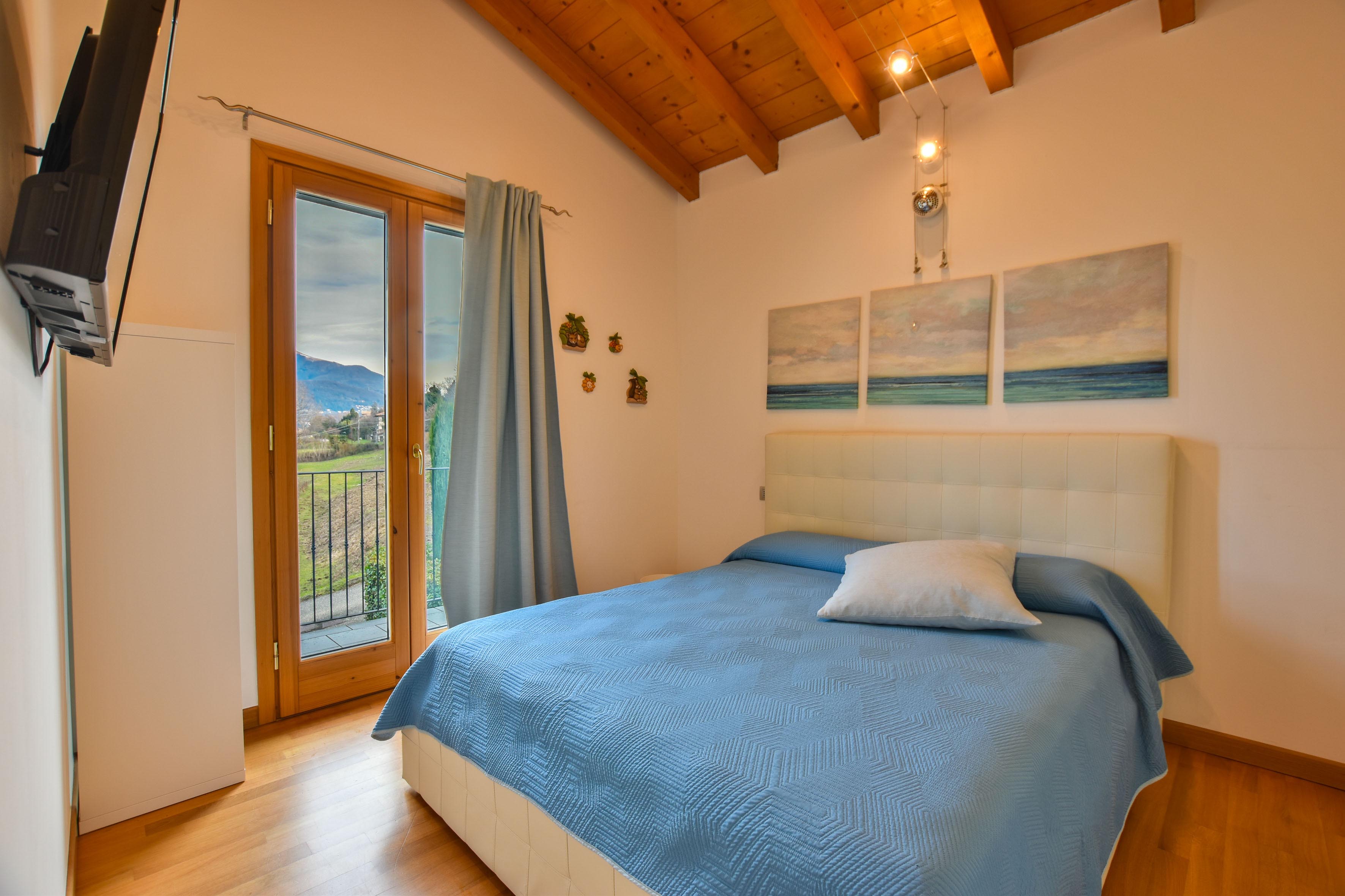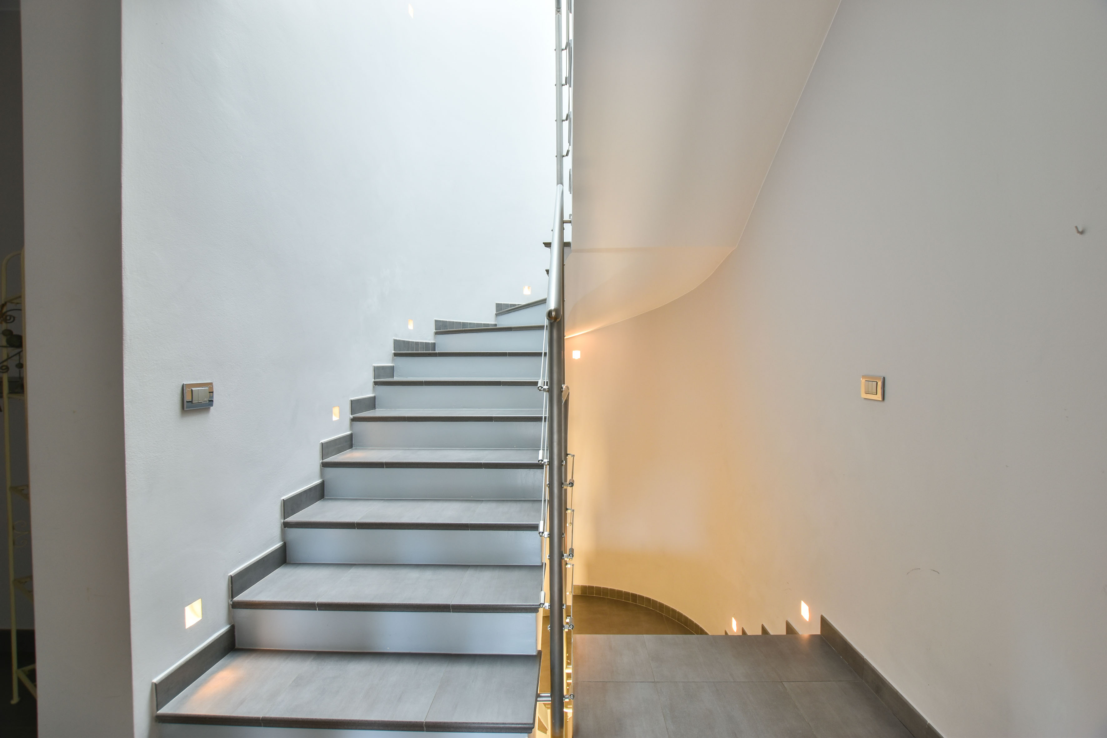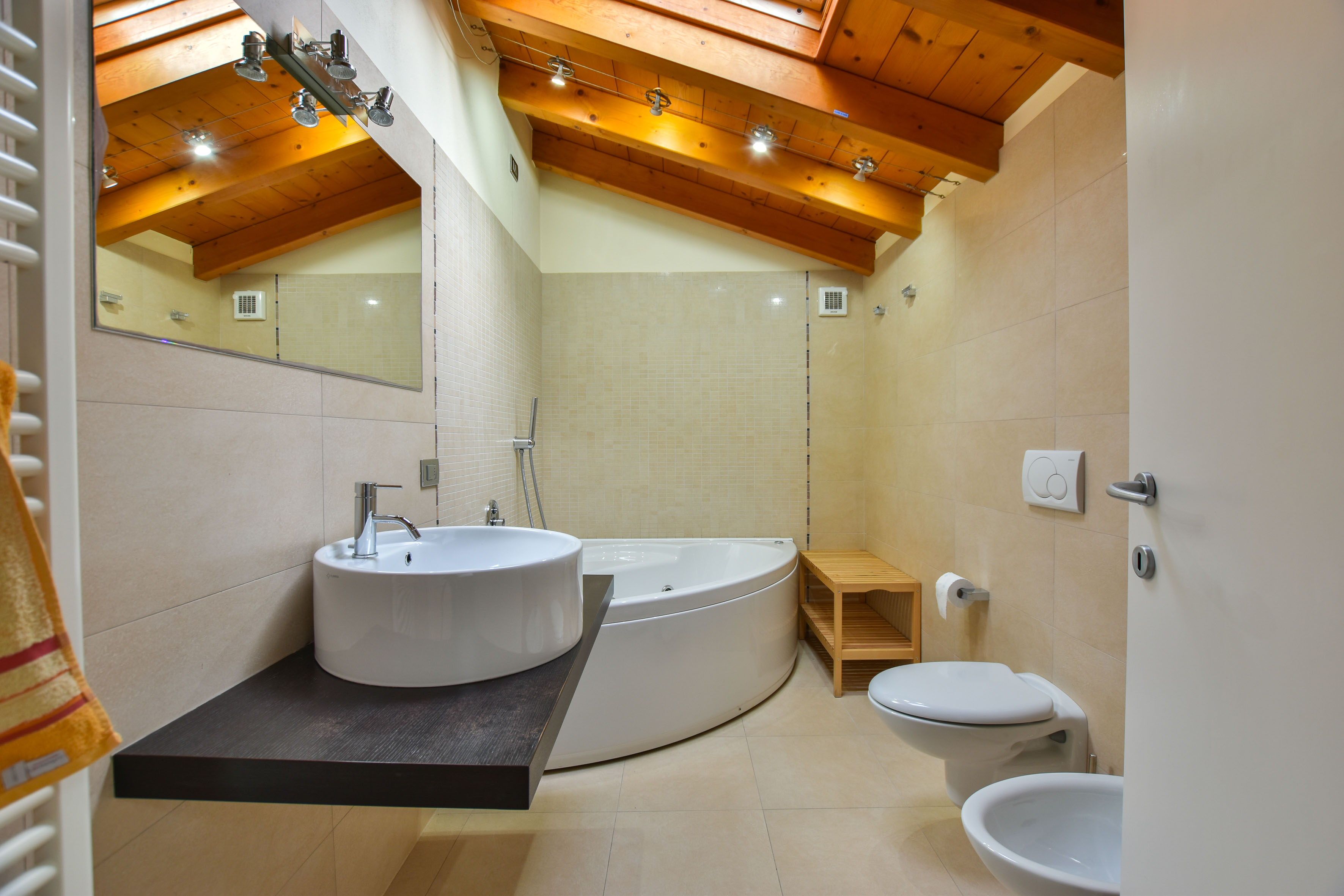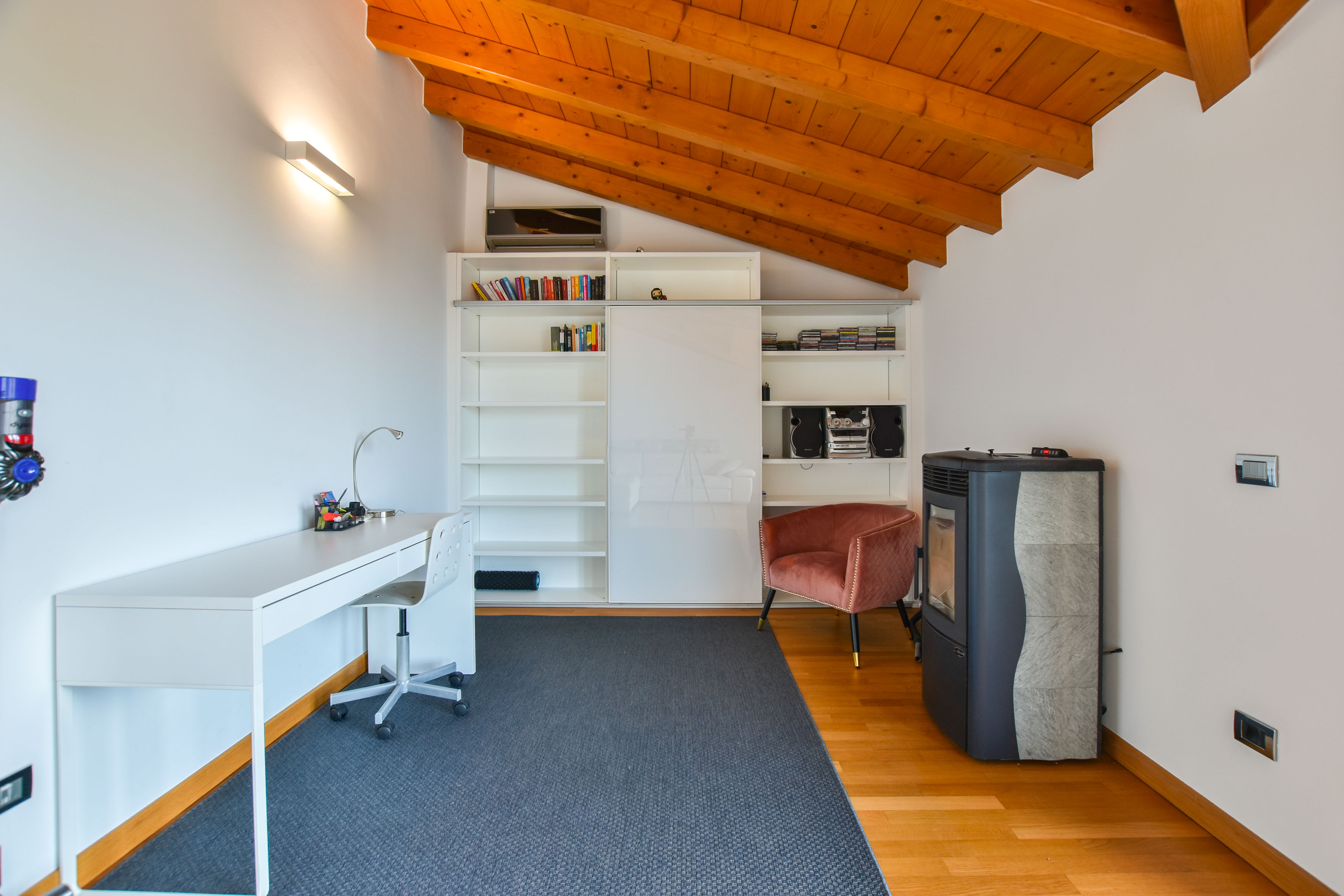 Le premier étage abrite le coin nuit, caractérisé par de hauts plafonds et un toit aux poutres apparentes. On y trouve un salon spacieux avec poêle à pellets et accès à un balcon panoramique qui entoure la maison, une chambre double avec salle de bain attenante avec douche, une chambre avec vestiaire, une quatrième chambre et une salle de bain avec jacuzzi.