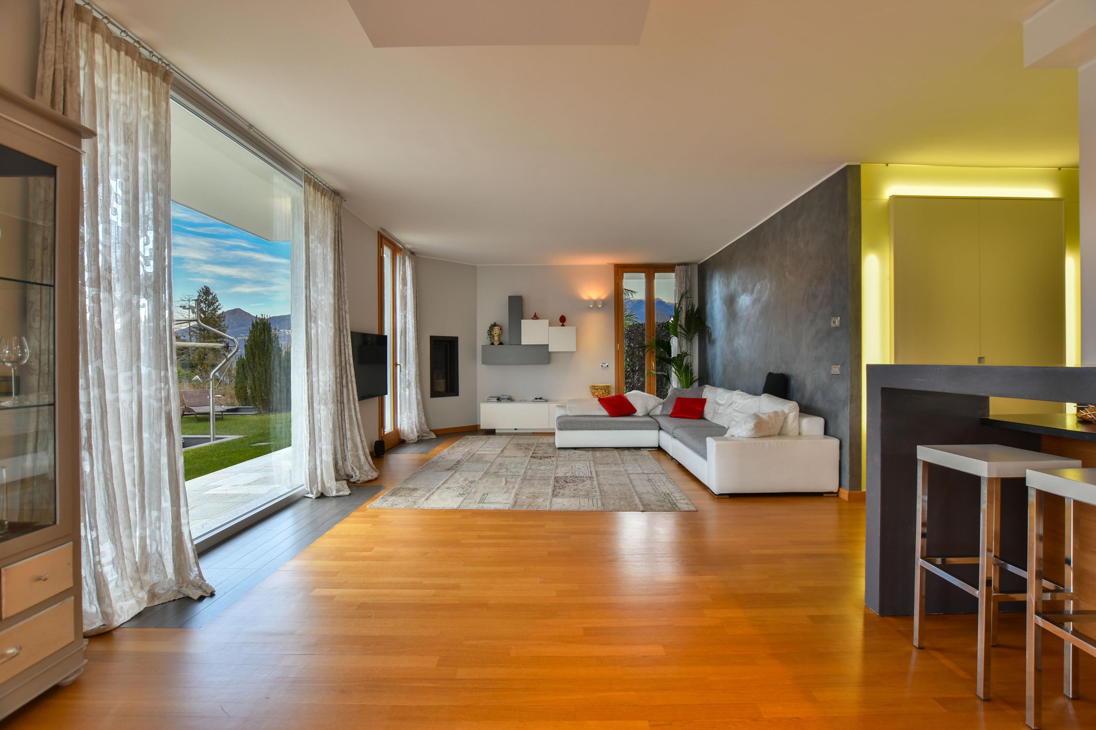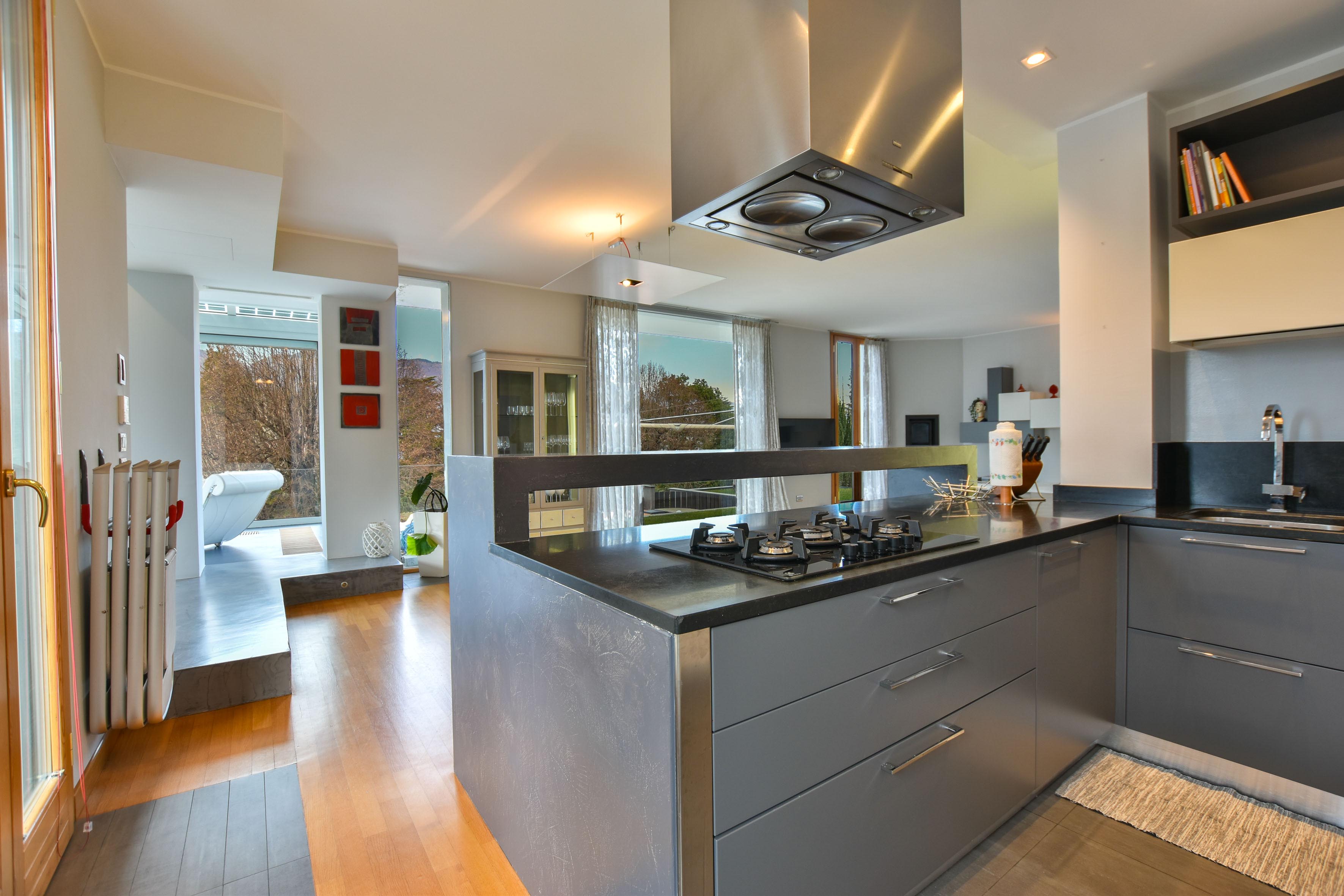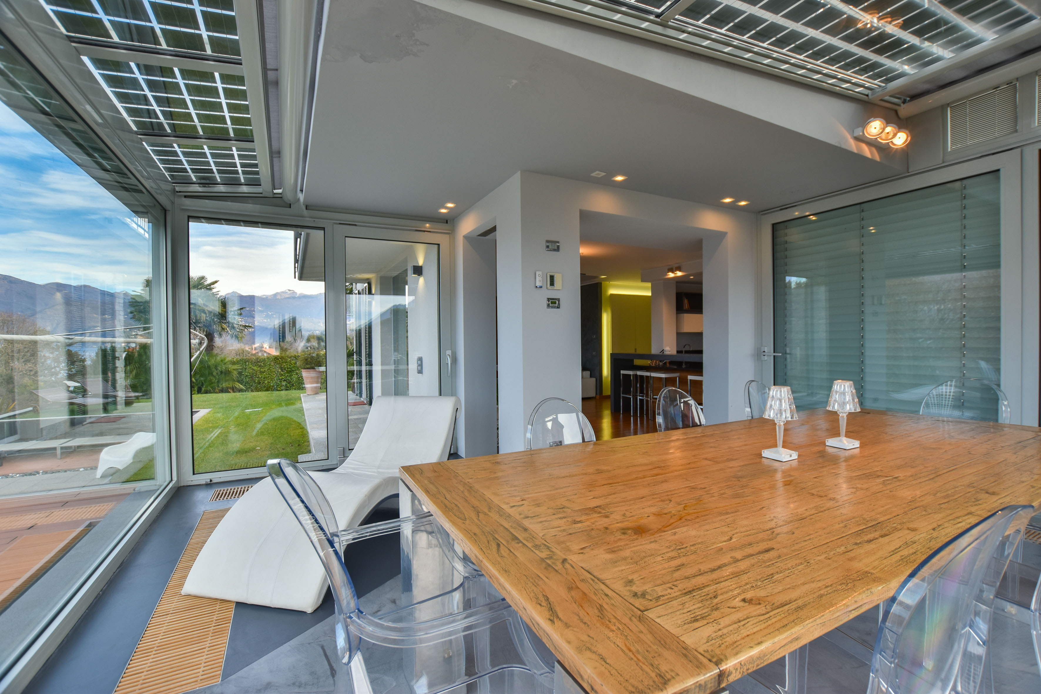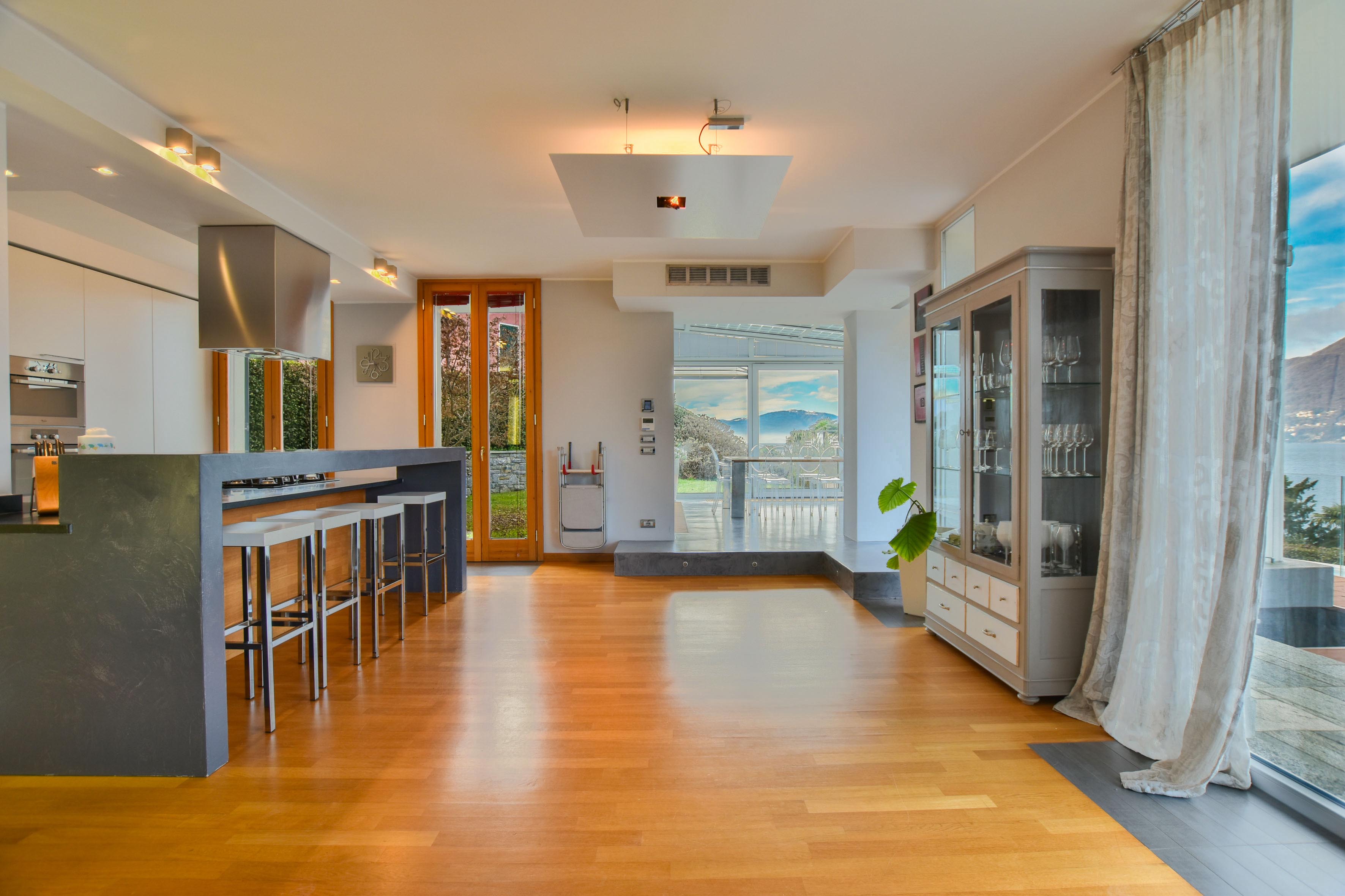 La surface totale est d'environ 280 m². Au rez-de-chaussée, avec l'entrée piétonne principale, se trouve la zone de vie, composée d'un grand salon, avec une cheminée à bois et un accès direct aux espaces extérieurs, d'une cuisine ouverte et d'une véranda entièrement vitrée avec salle à manger, conçue pour profiter au maximum de la vue sur le lac.