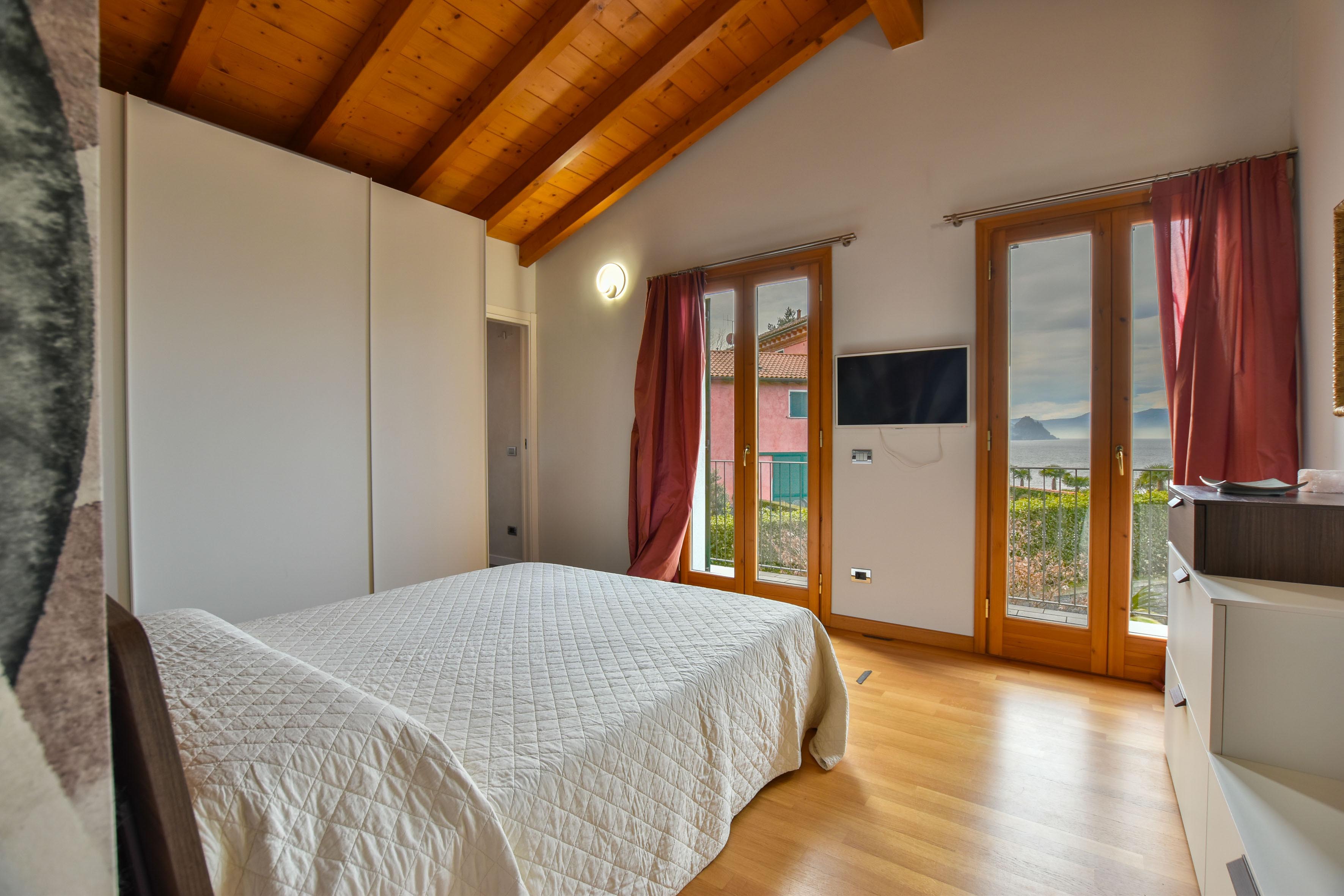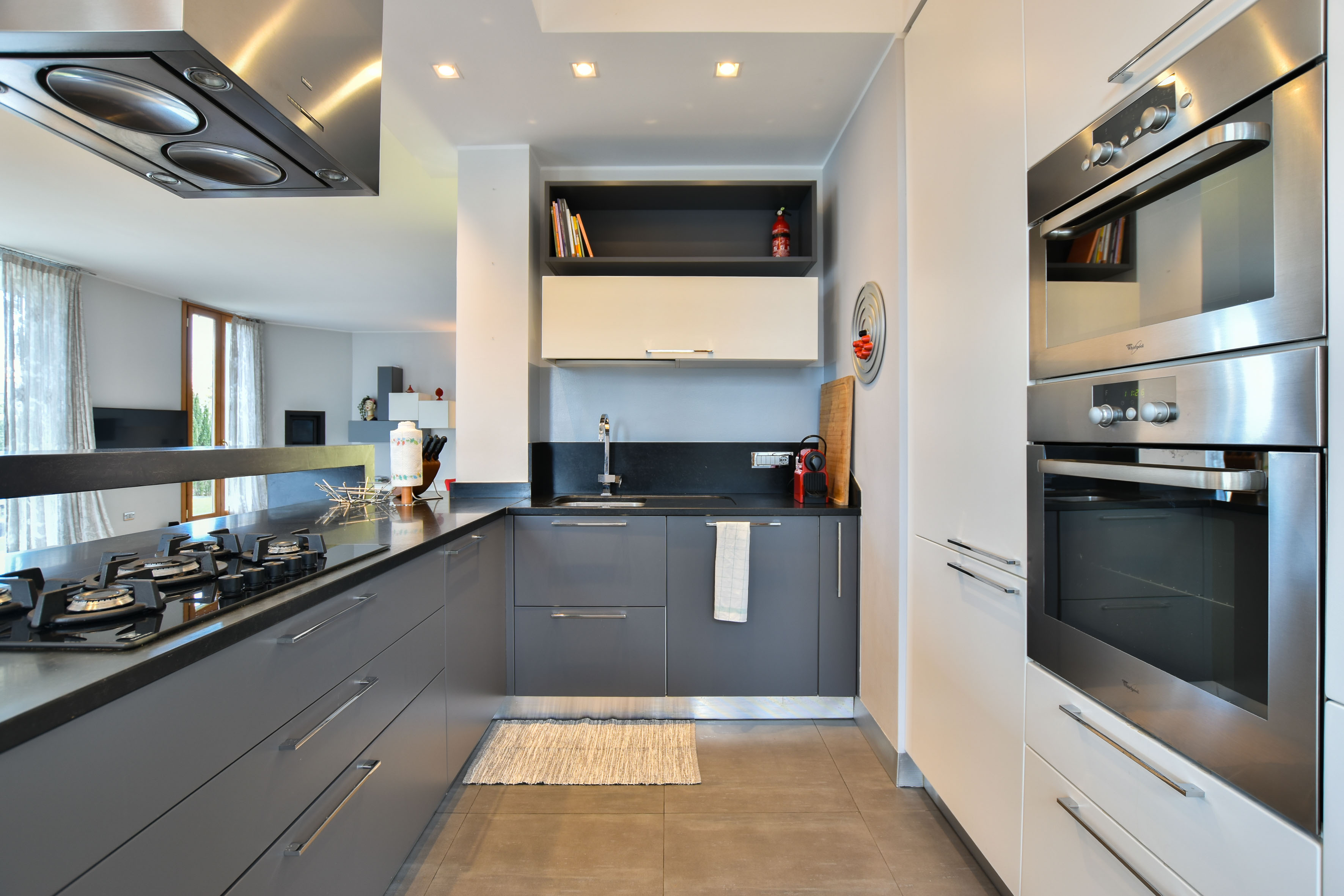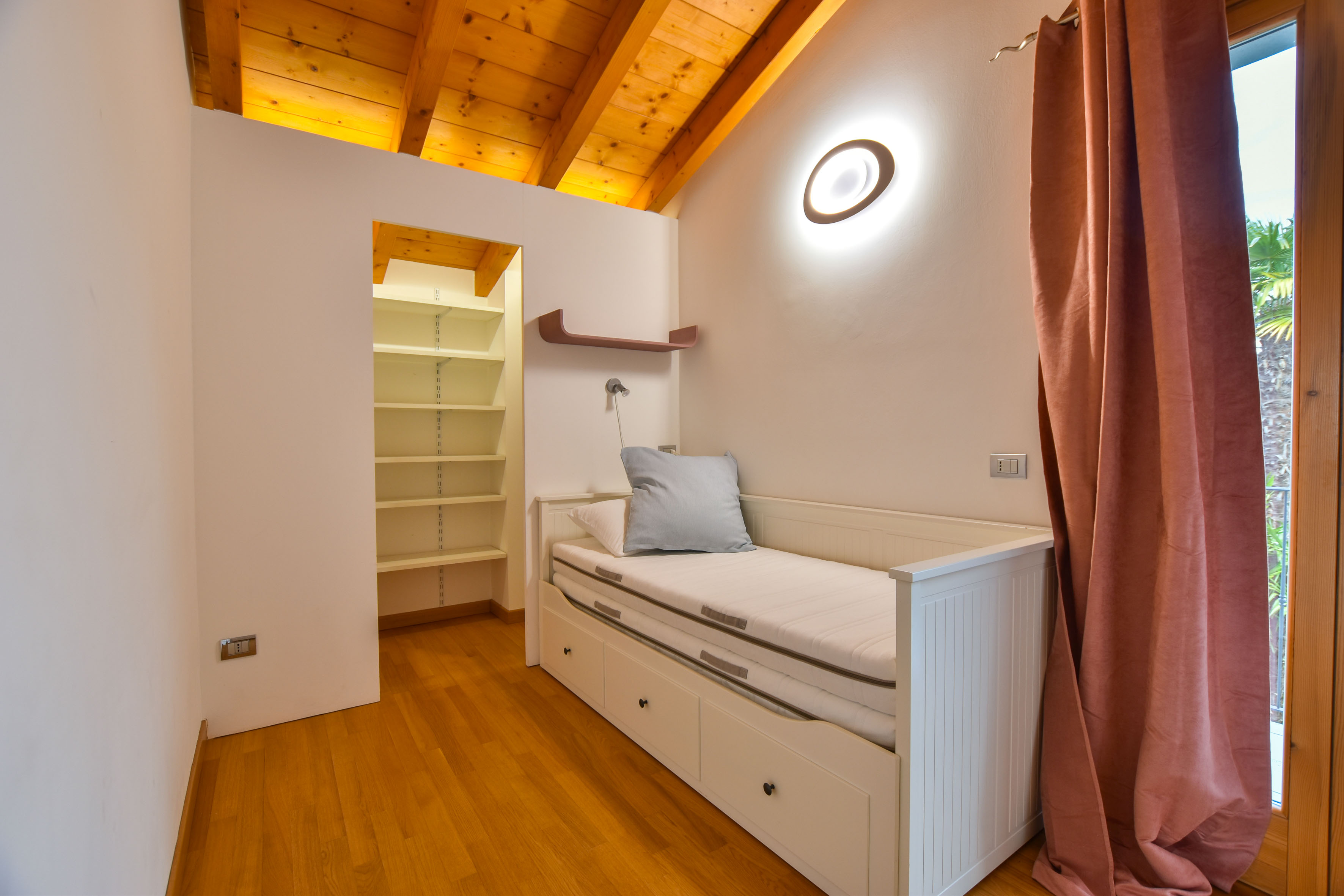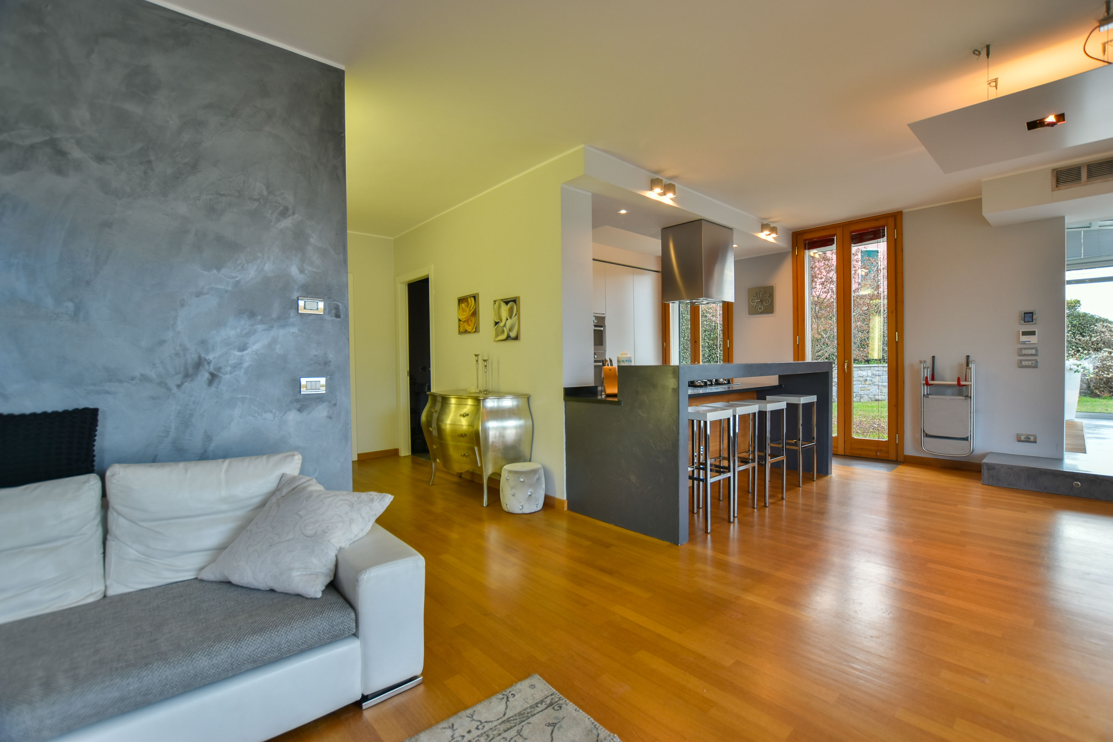 La surface totale est d'environ 280 m². Au rez-de-chaussée, avec l'entrée piétonne principale, se trouve la zone de vie, composée d'un grand salon, avec une cheminée à bois et un accès direct aux espaces extérieurs, d'une cuisine ouverte et d'une véranda entièrement vitrée avec salle à manger, conçue pour profiter au maximum de la vue sur le lac.