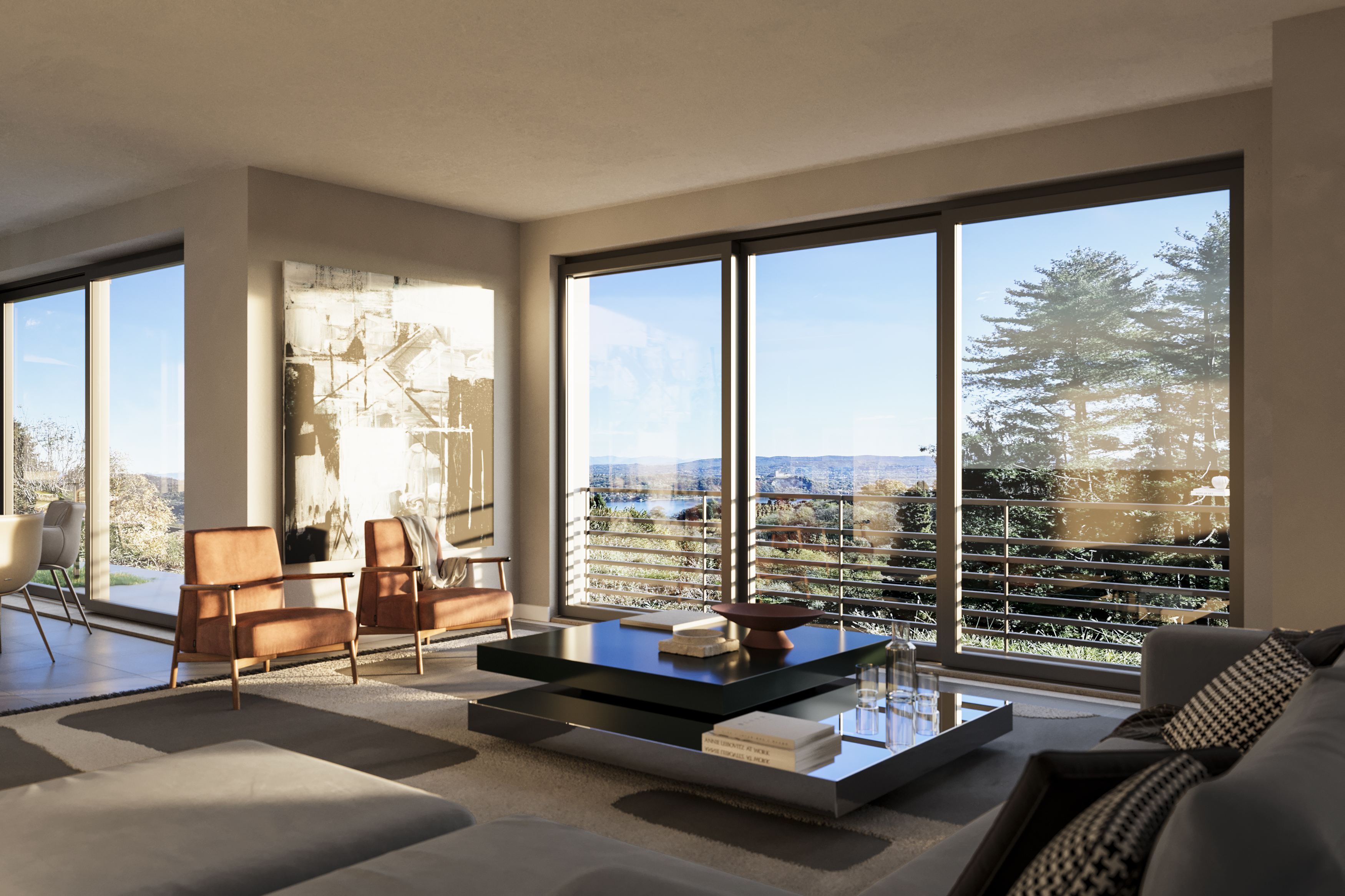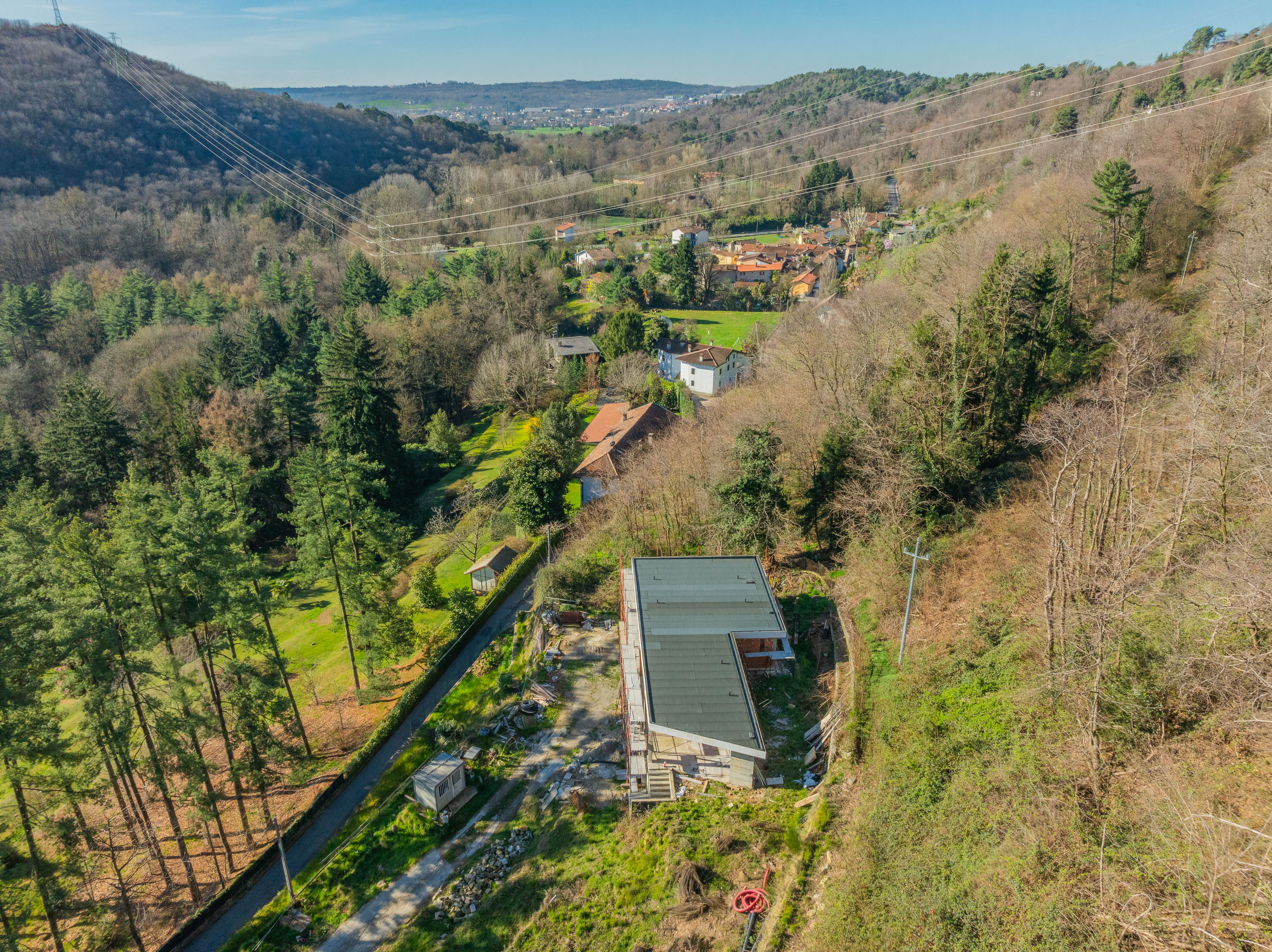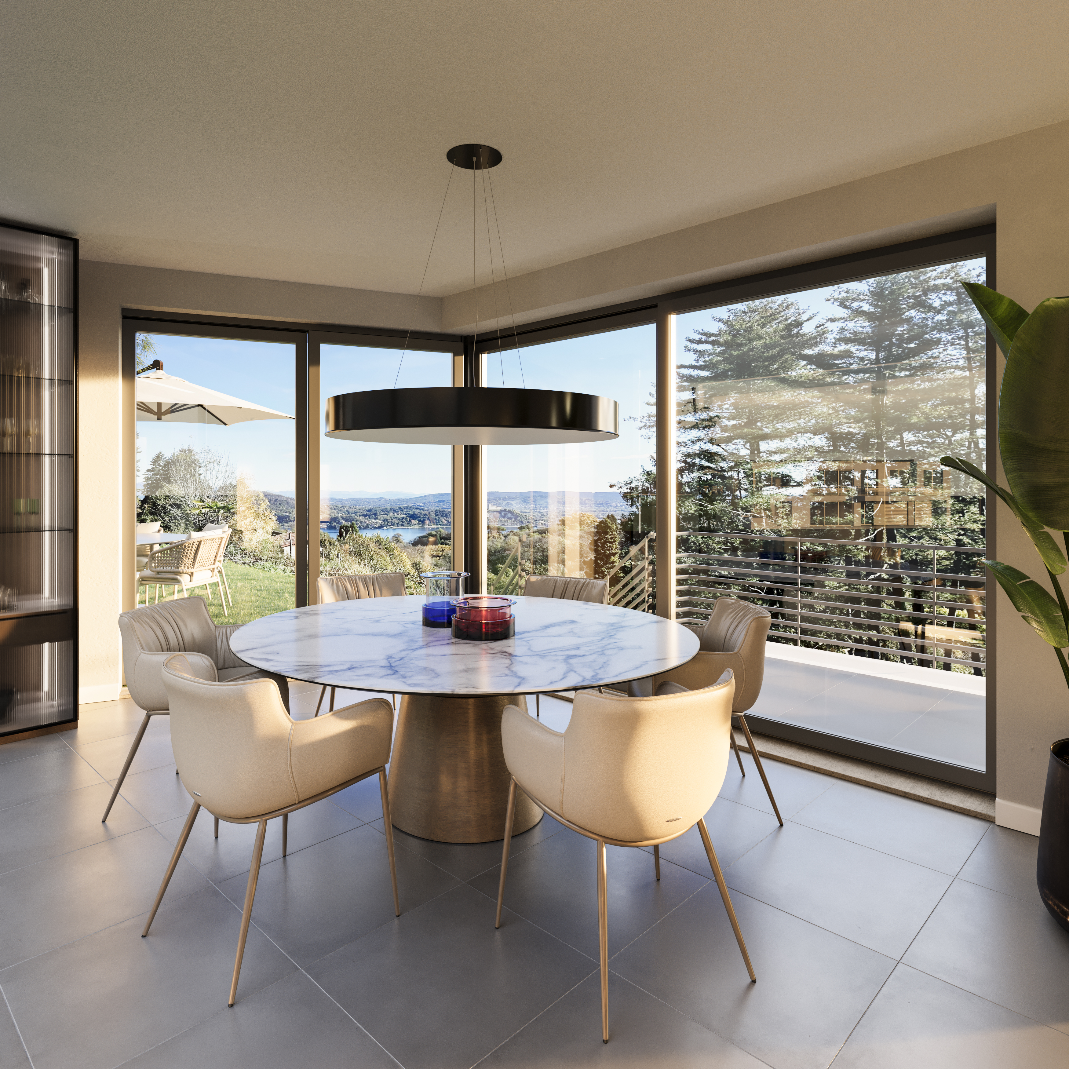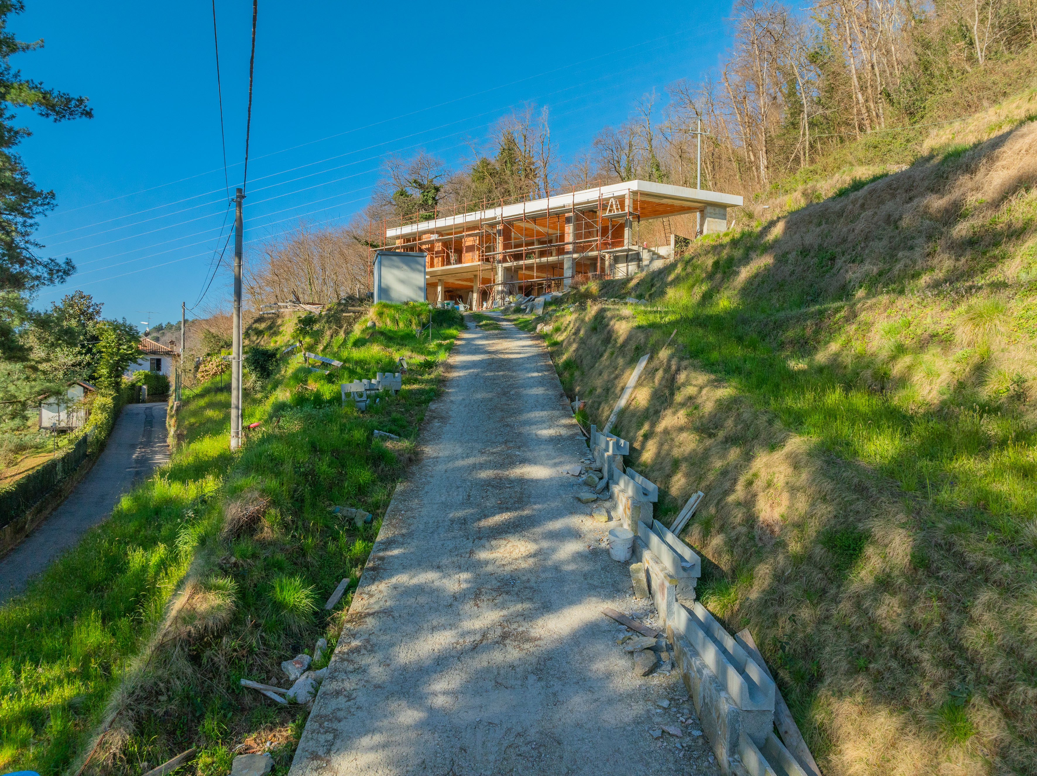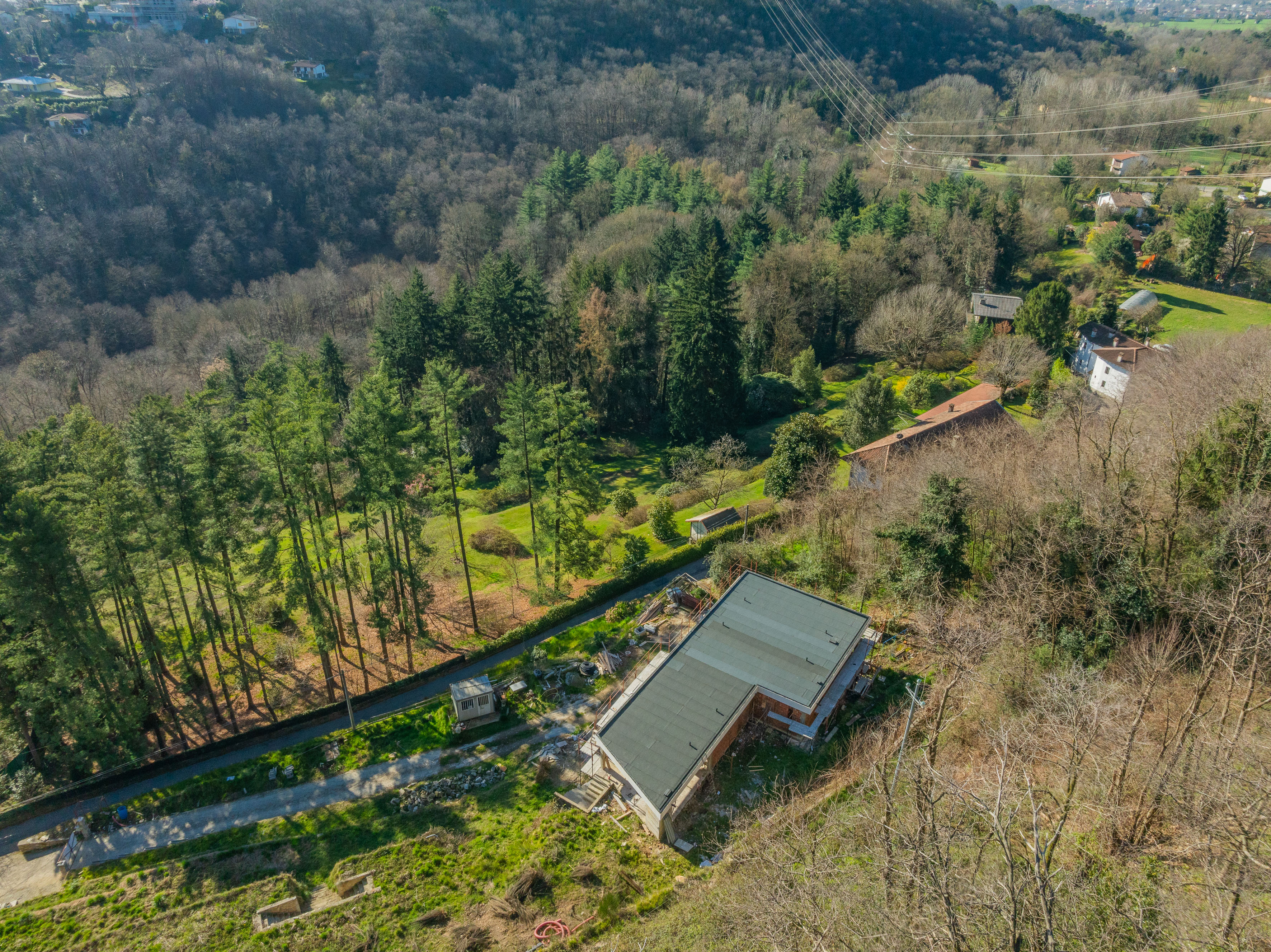 Le premier étage est consacré à la zone de vie, conçue comme un grand espace ouvert comprenant le salon, la salle à manger et la cuisine, tous dotés de portes-fenêtres donnant sur le lac, qui garantissent une luminosité extraordinaire et une continuité naturelle avec les espaces extérieurs. L'étage est complété par une salle de bains de service, la chambre principale avec salle de bains en suite et dressing, et deux autres chambres.