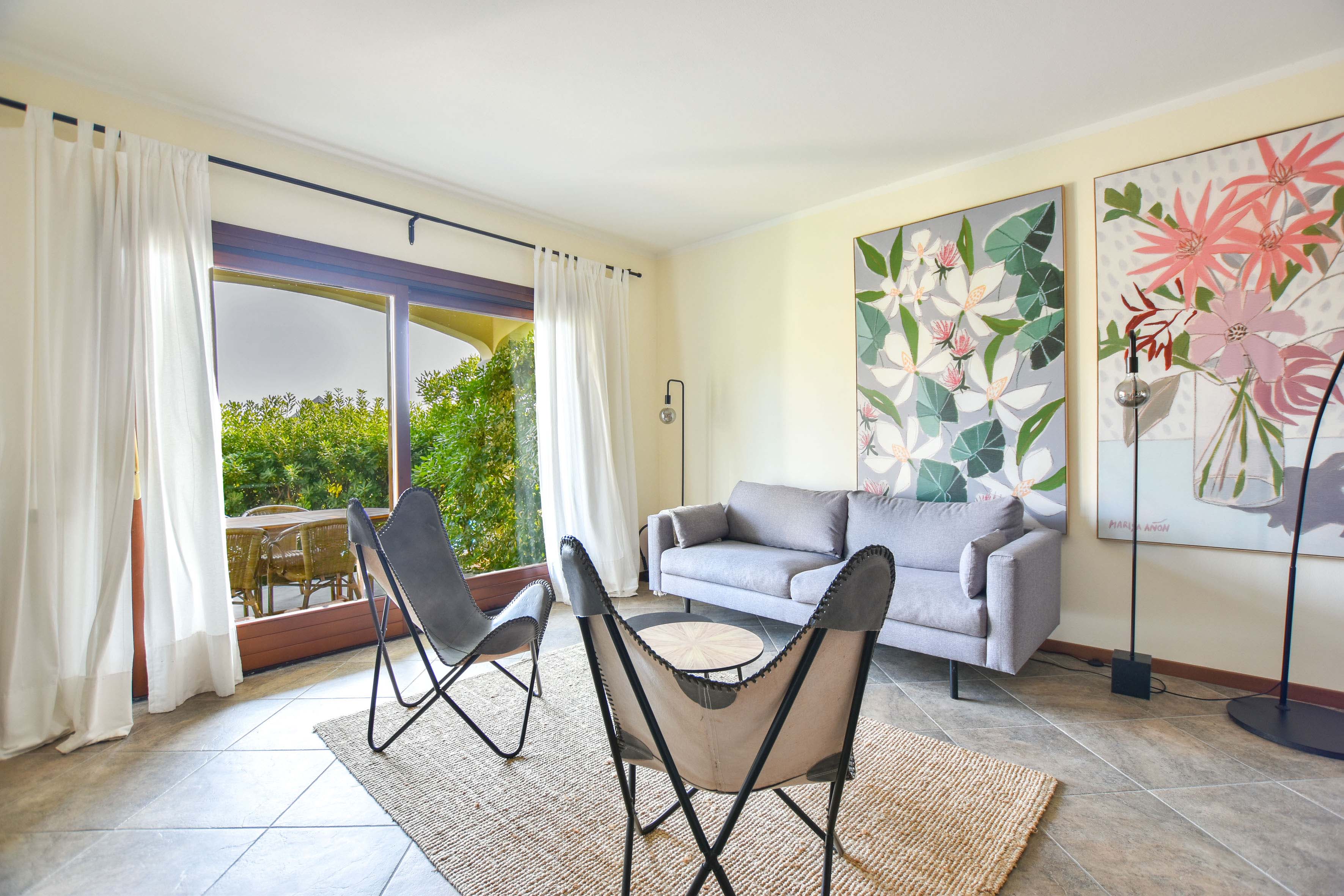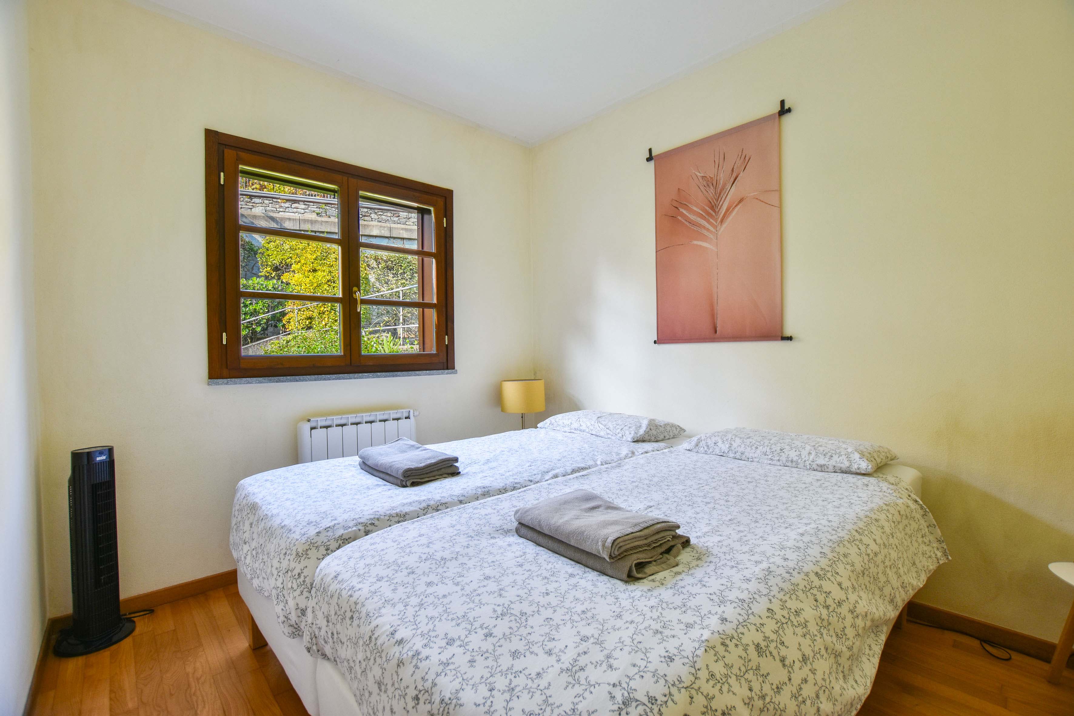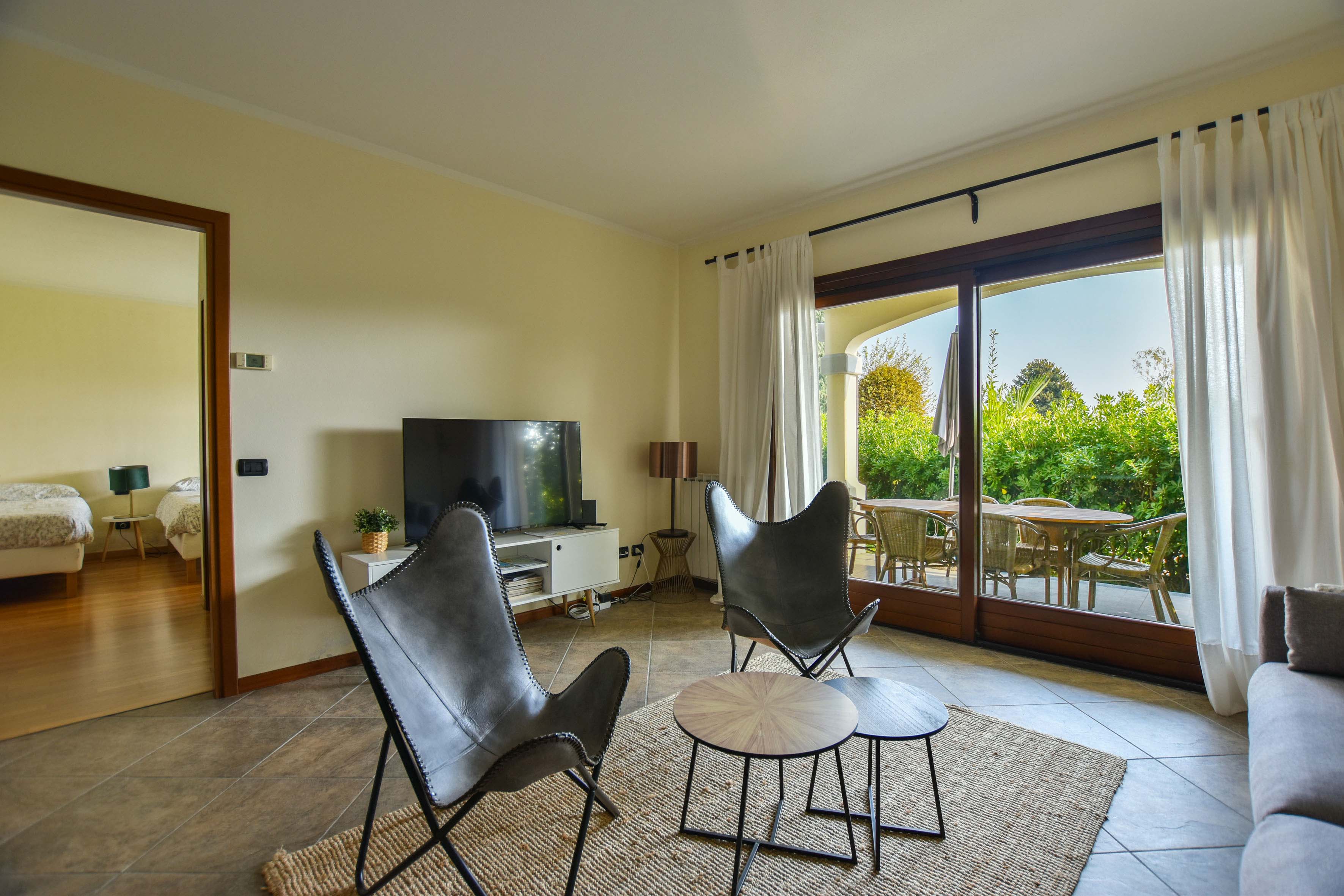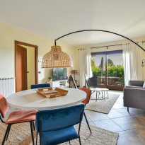 L'appartement est élégamment et confortablement meublé et dispose d'une terrasse ensoleillée et d'un petit jardin privé d'où vous pourrez profiter d'une vue magnifique sur les collines environnantes et sur la piscine. À l'intérieur, il y a un salon moderne avec une cuisine ouverte, entièrement équipée avec des appareils modernes. Il y a deux chambres confortables, chacune avec sa propre salle de bains : la première chambre a trois lits simples et une salle de bains privée avec baignoire. La deuxième chambre dispose d'un lit double et d'une salle de bains privée avec douche.