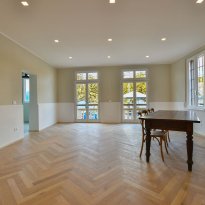 Au rez-de-chaussée, il y a un grand salon et une salle à manger, avec une double vue sur le lac, suivi d'une cuisine partiellement ouverte. Un bureau et une salle de bains avec douche complètent ce niveau.