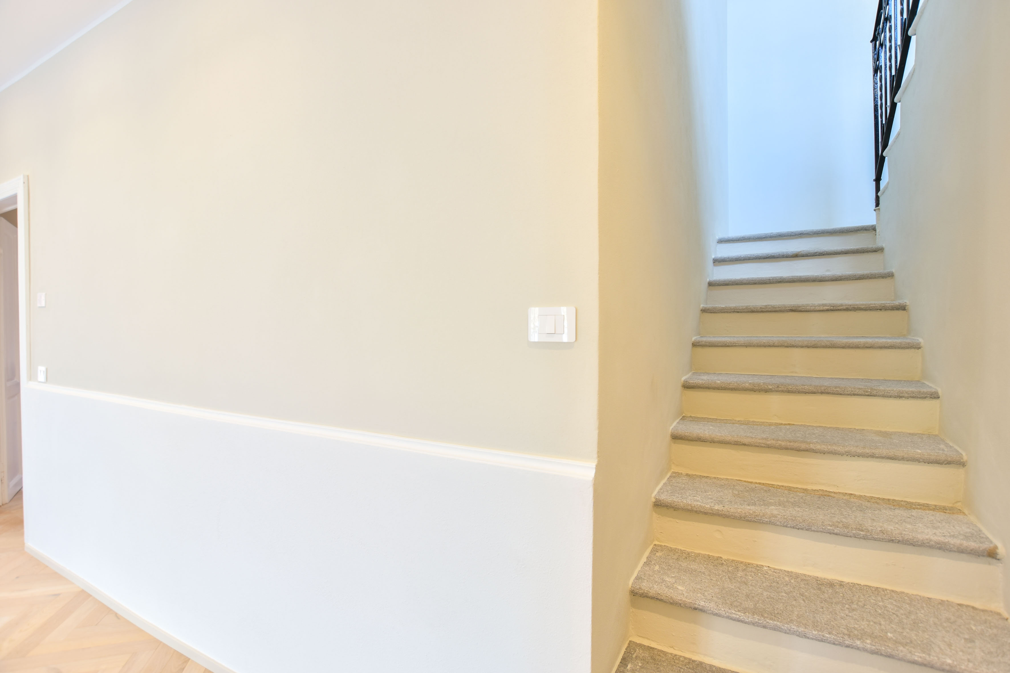 Un escalier en pierre mène à l'étage supérieur, où se trouvent la chambre principale avec balcon donnant sur le lac, une deuxième chambre et une grande salle de bains.