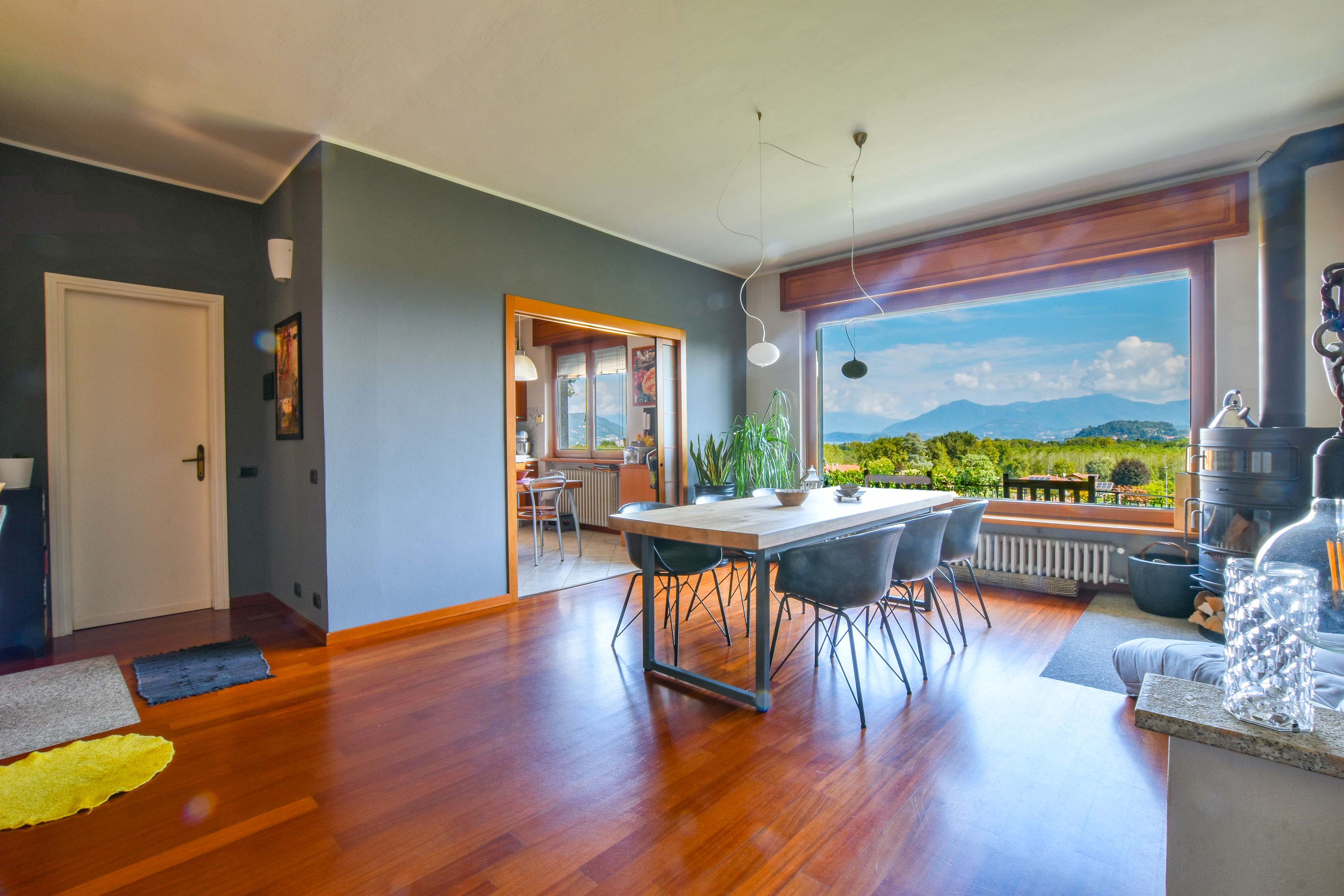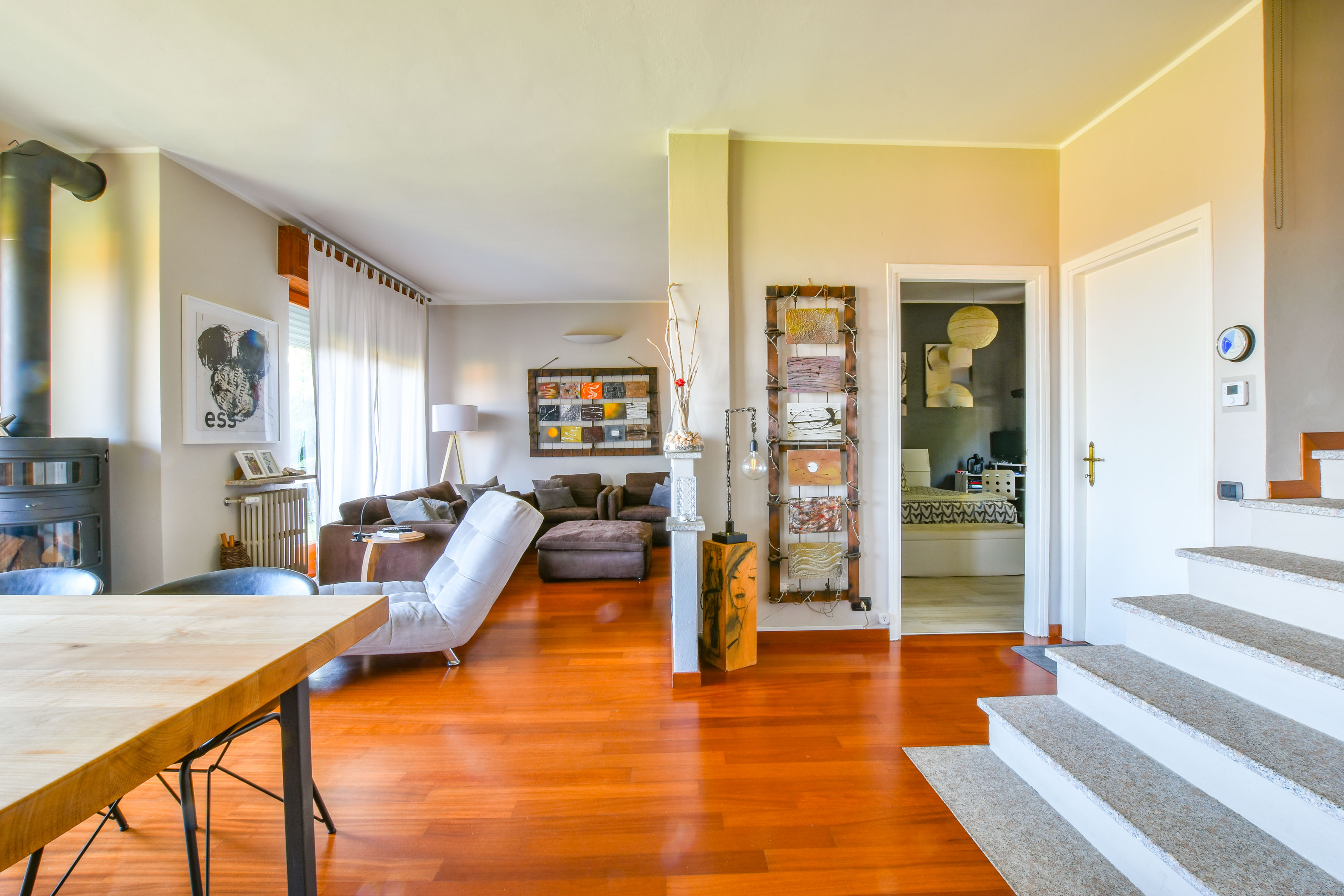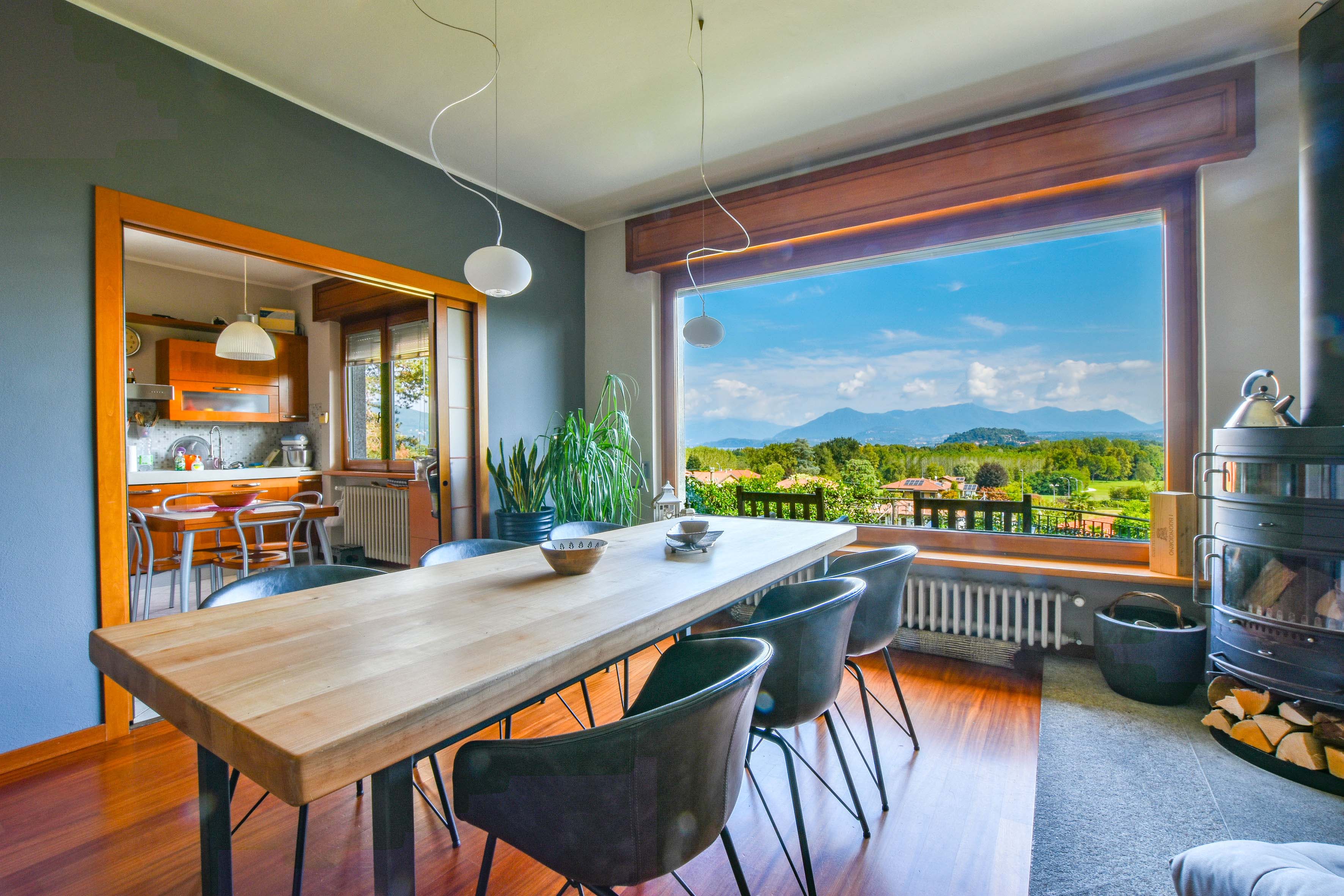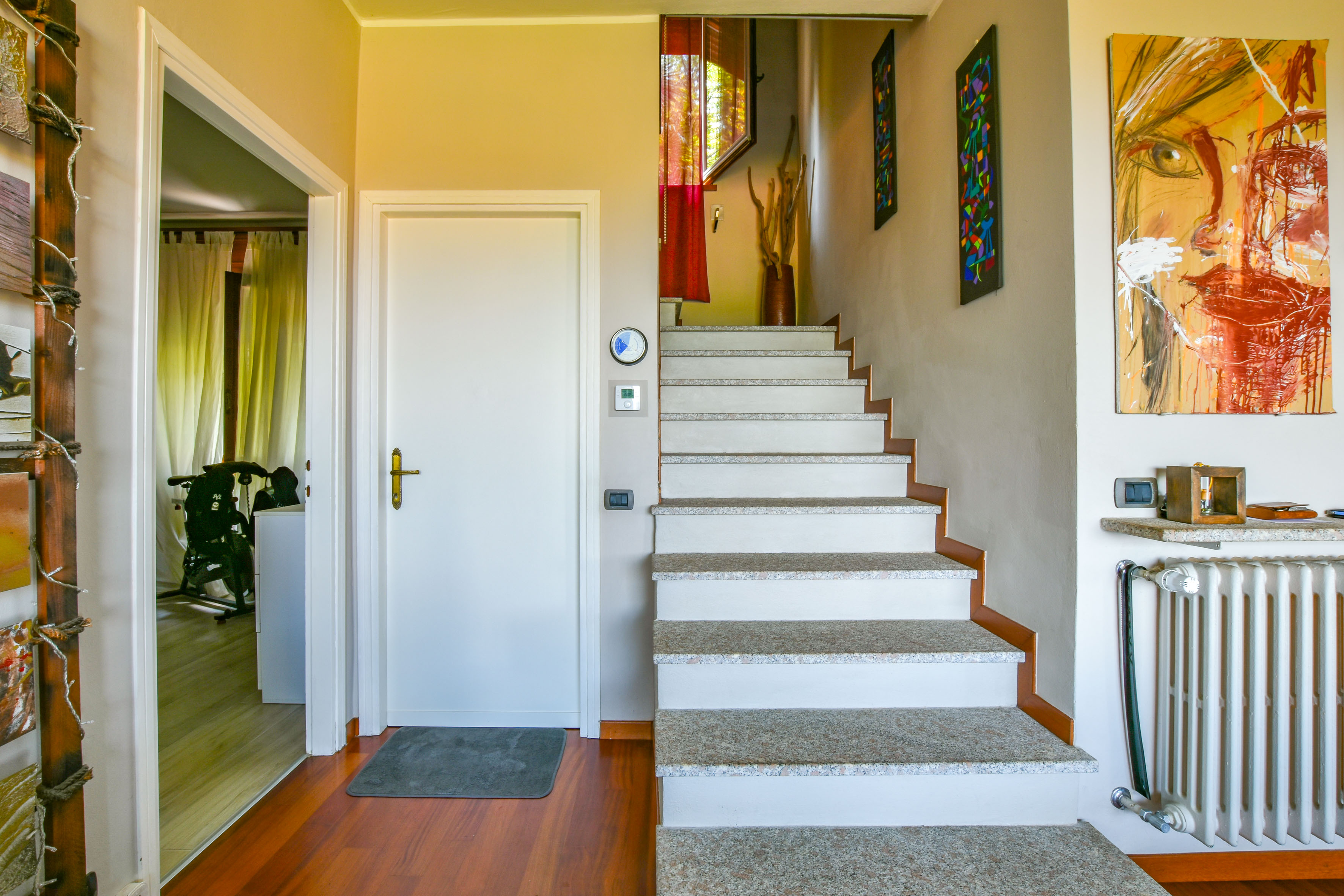 Au rez-de-chaussée, l'habitation dispose d'une cuisine équipée séparée par d'élégantes portes coulissantes, d'un grand séjour avec salle à manger et d'un salon enrichi d'un poêle à bois, lieu de rencontre et de partage éclairé par la lumière naturelle qui filtre à travers les grandes fenêtres donnant sur le panorama pittoresque et le balcon qui offre une vue spectaculaire sur le lac Majeur et les paysages environnants. L'étage est complété par une chambre double, donnant sur le jardin arrière et desservie par une salle de bains.