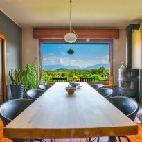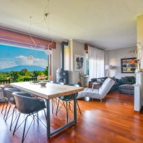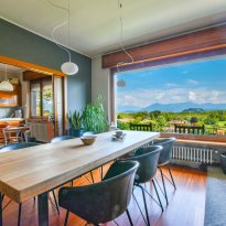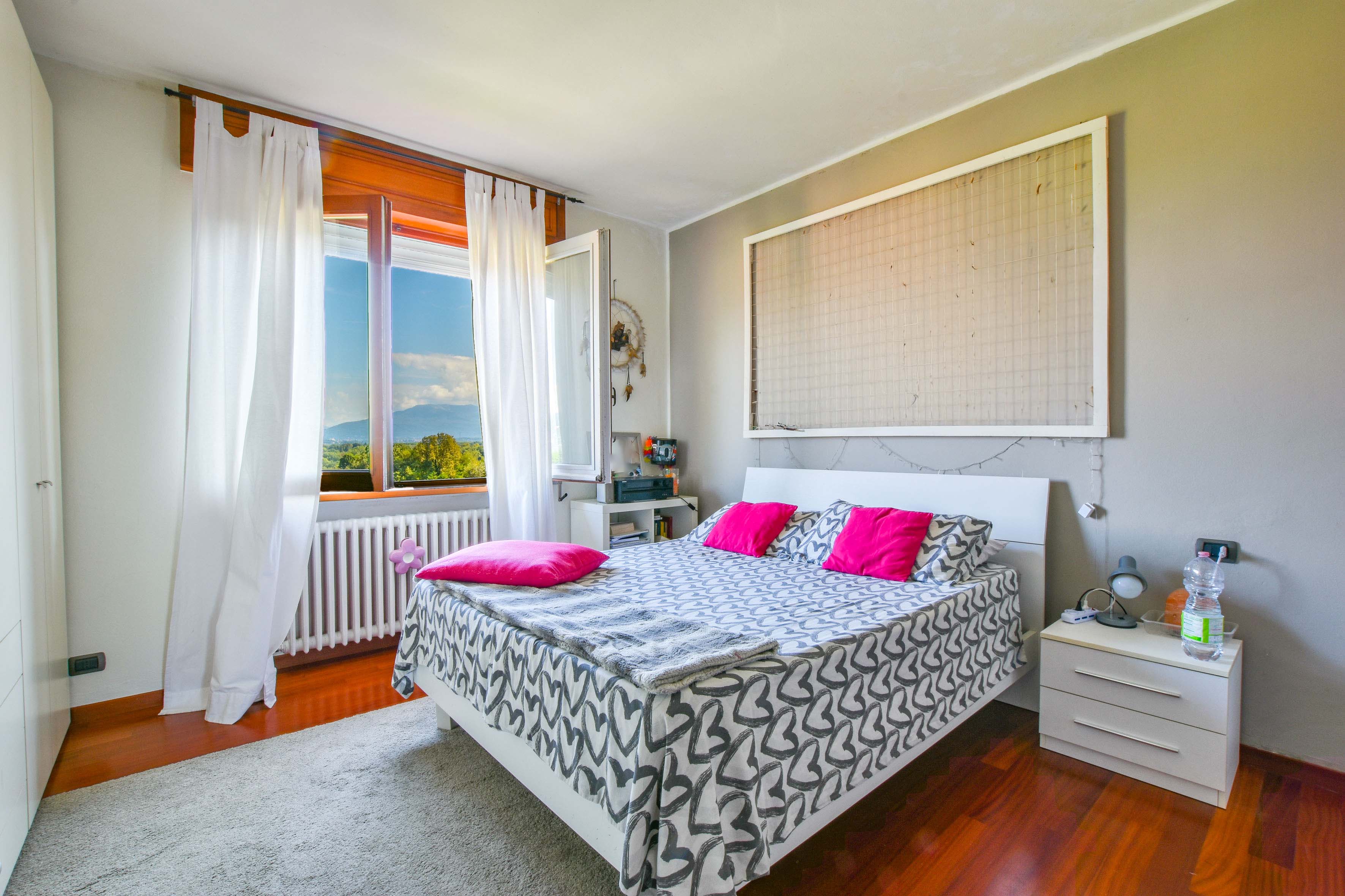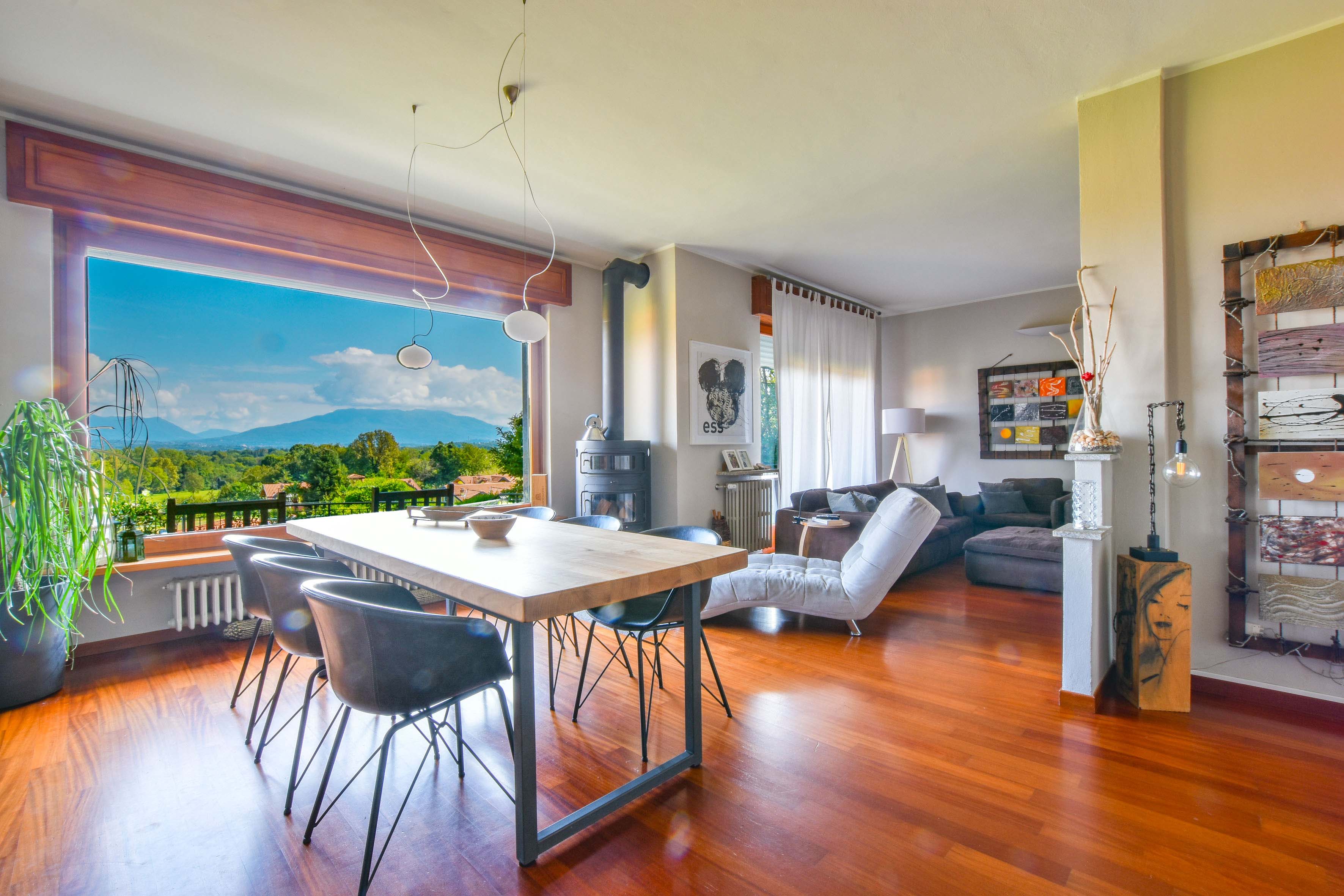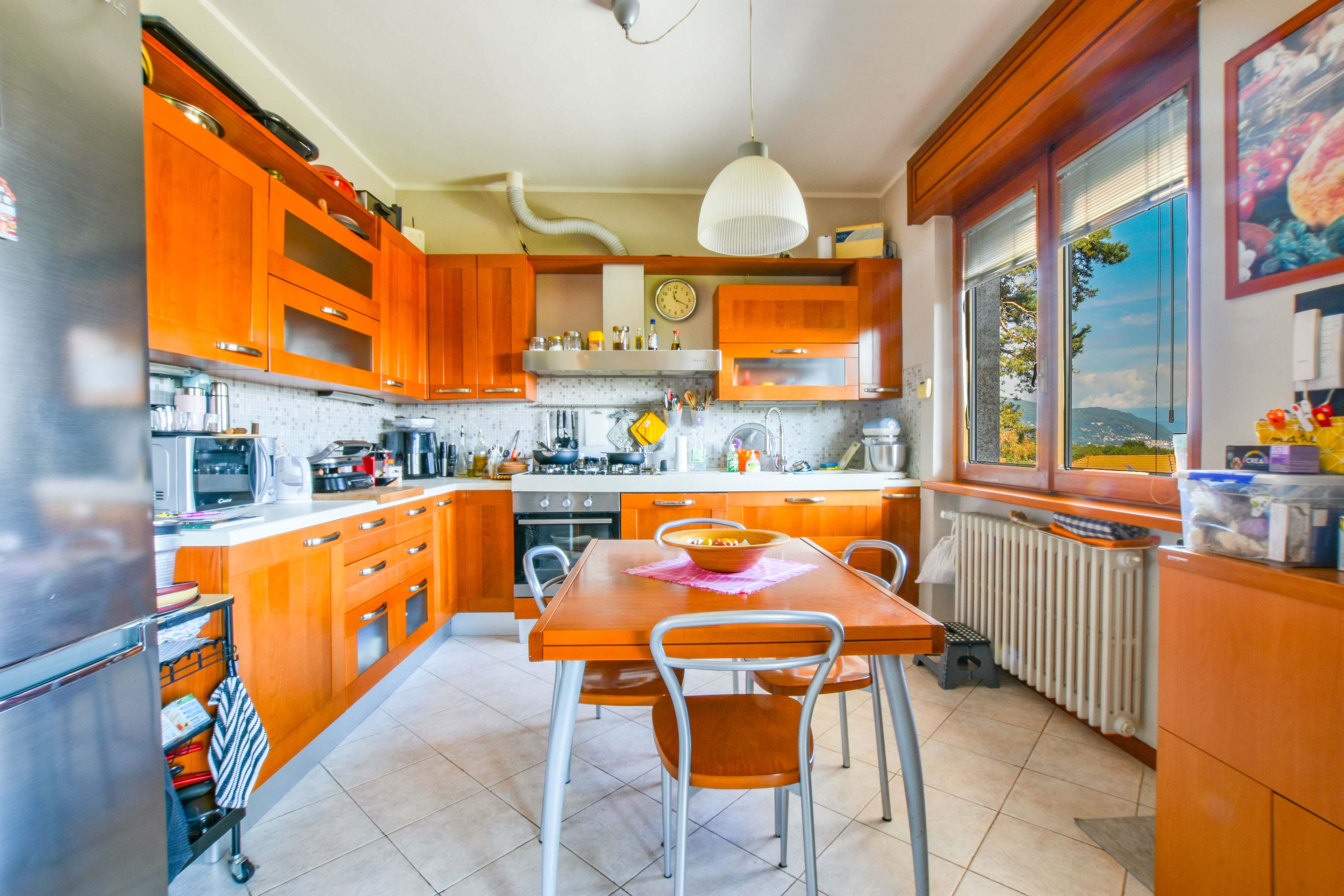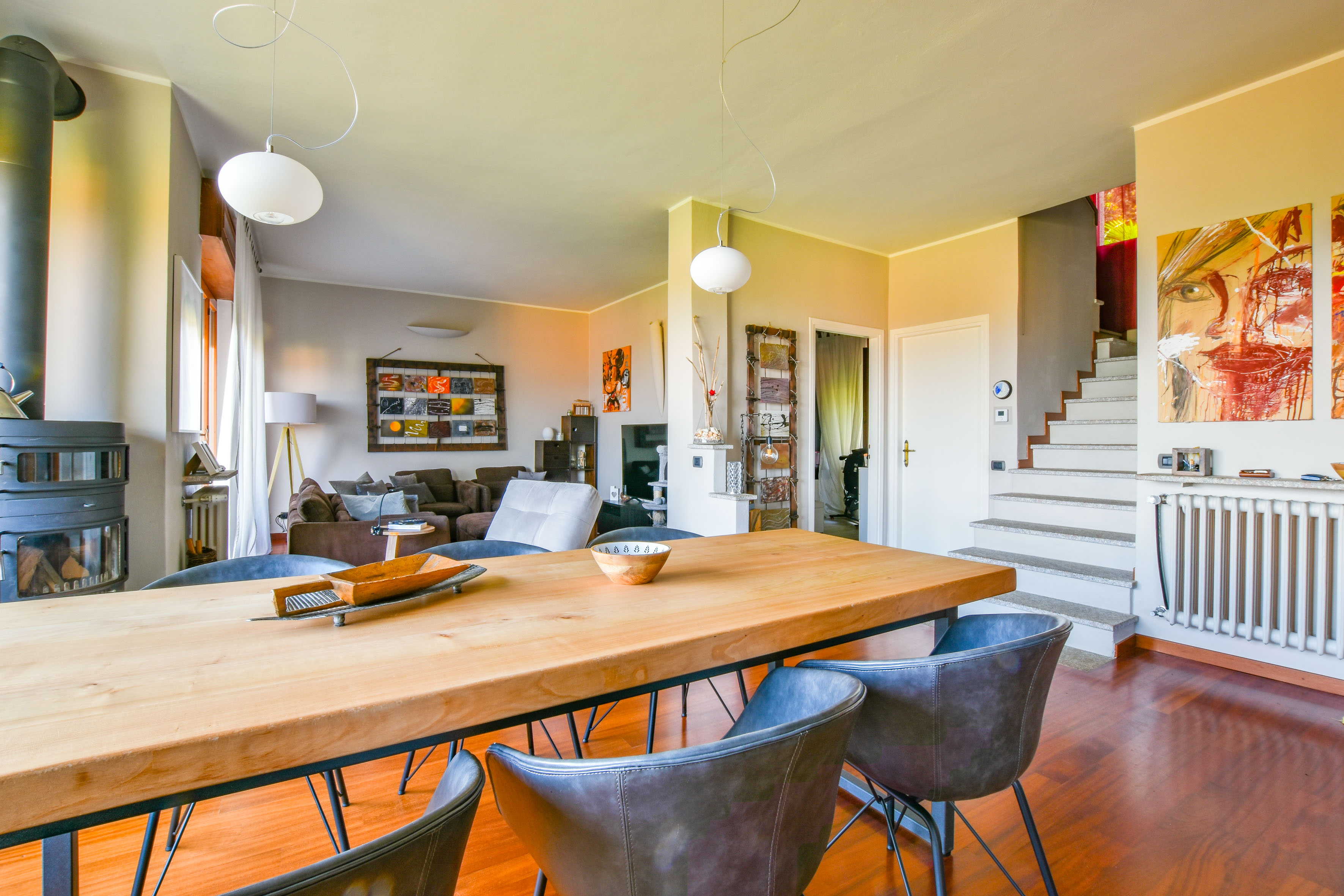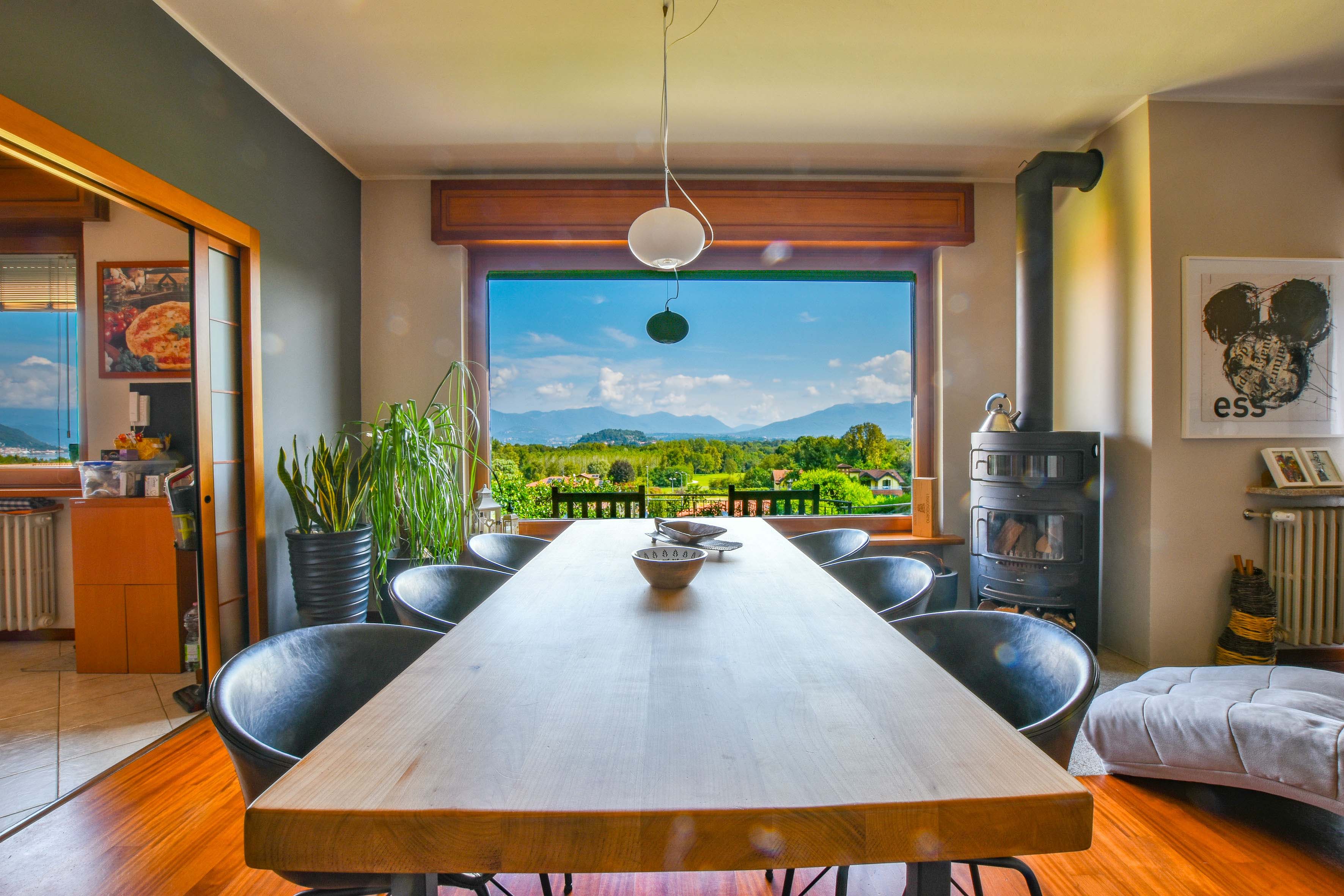 Au rez-de-chaussée, l'habitation dispose d'une cuisine équipée séparée par d'élégantes portes coulissantes, d'un grand séjour avec salle à manger et d'un salon enrichi d'un poêle à bois, lieu de rencontre et de partage éclairé par la lumière naturelle qui filtre à travers les grandes fenêtres donnant sur le panorama pittoresque et le balcon qui offre une vue spectaculaire sur le lac Majeur et les paysages environnants. L'étage est complété par une chambre double, donnant sur le jardin arrière et desservie par une salle de bains.