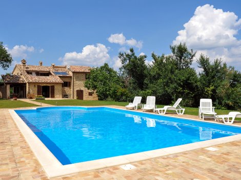 Villa Barbara is a beautifully restored stone farmhouse set in the rolling countryside of Le Marche, with panoramic views of the Sibillini Mountains and located on the edge of the Parco Nazionale dei Monti Sibillini, between Sarnano and San Ginesio. The property offers approximately 331 sqm of living space, with 5 bedrooms and 5 bathrooms, a 7 x 12 m swimming pool, a fully fenced garden of around 5,000 sqm with fruit trees, and 15 hectares of woodland, providing peace, privacy and beautiful views.