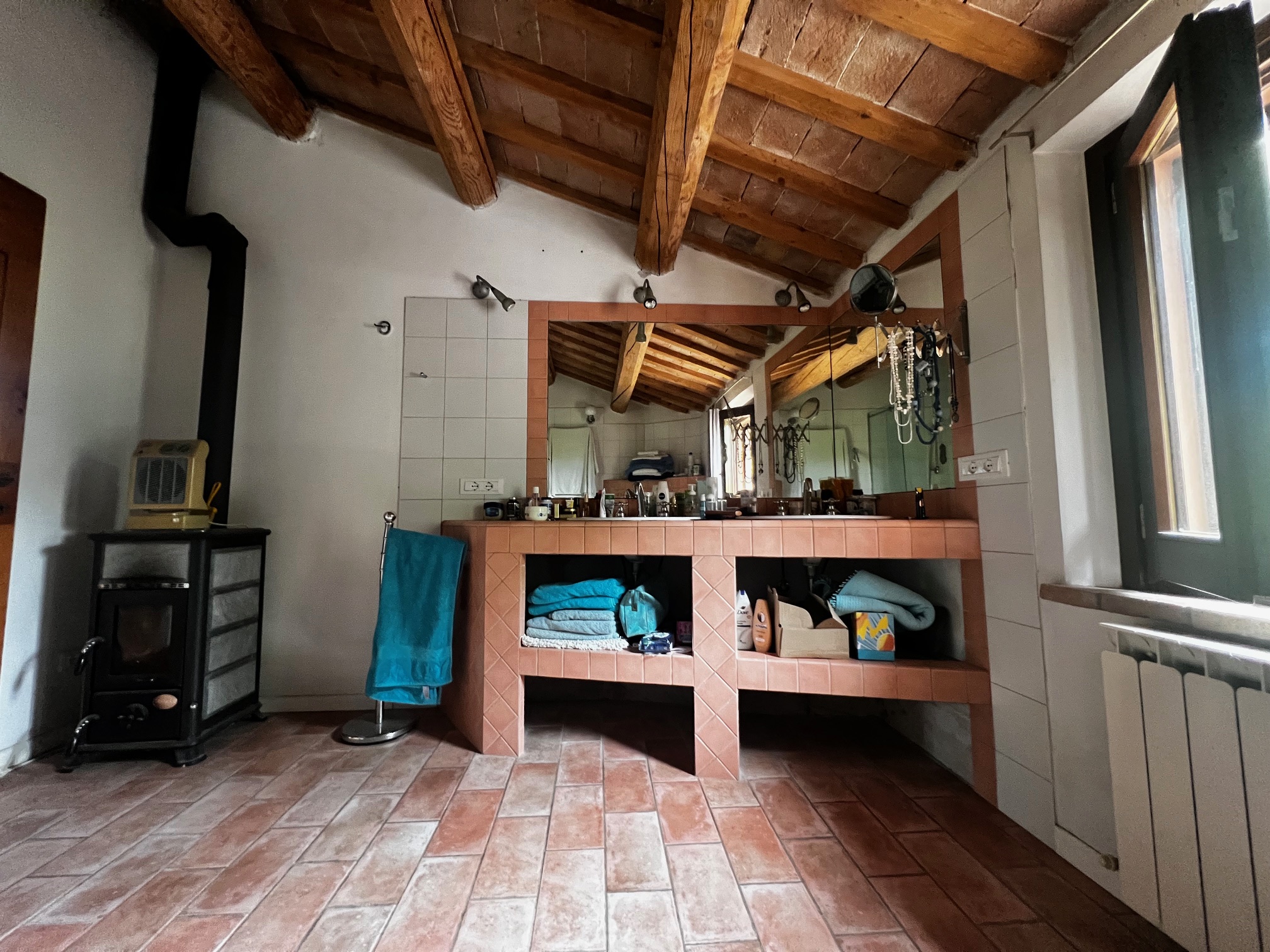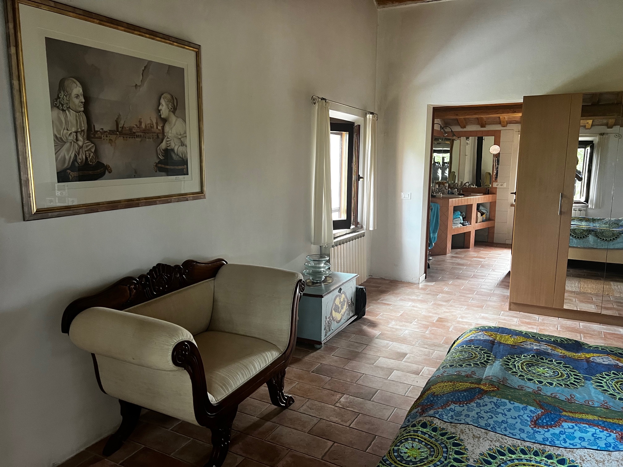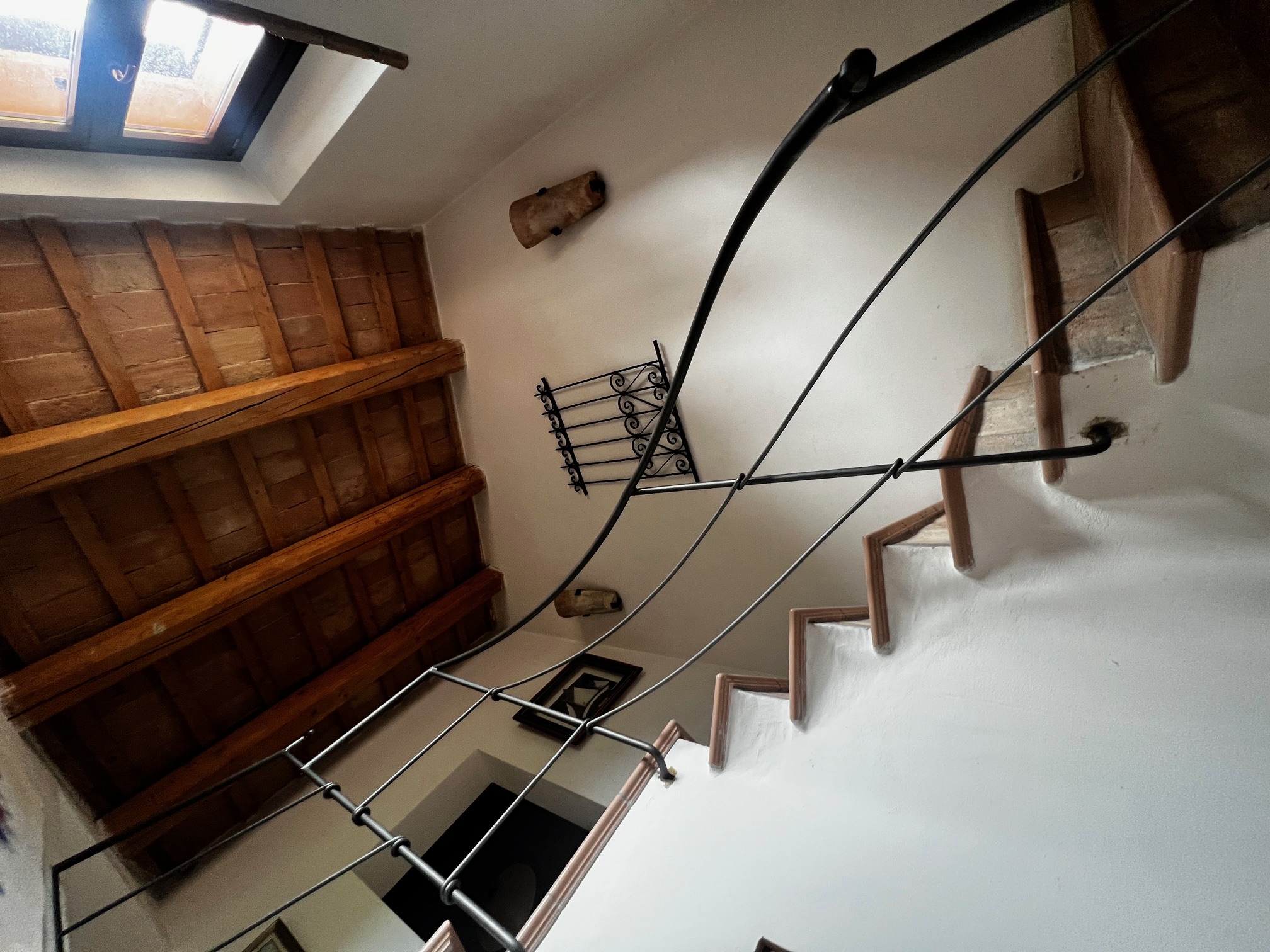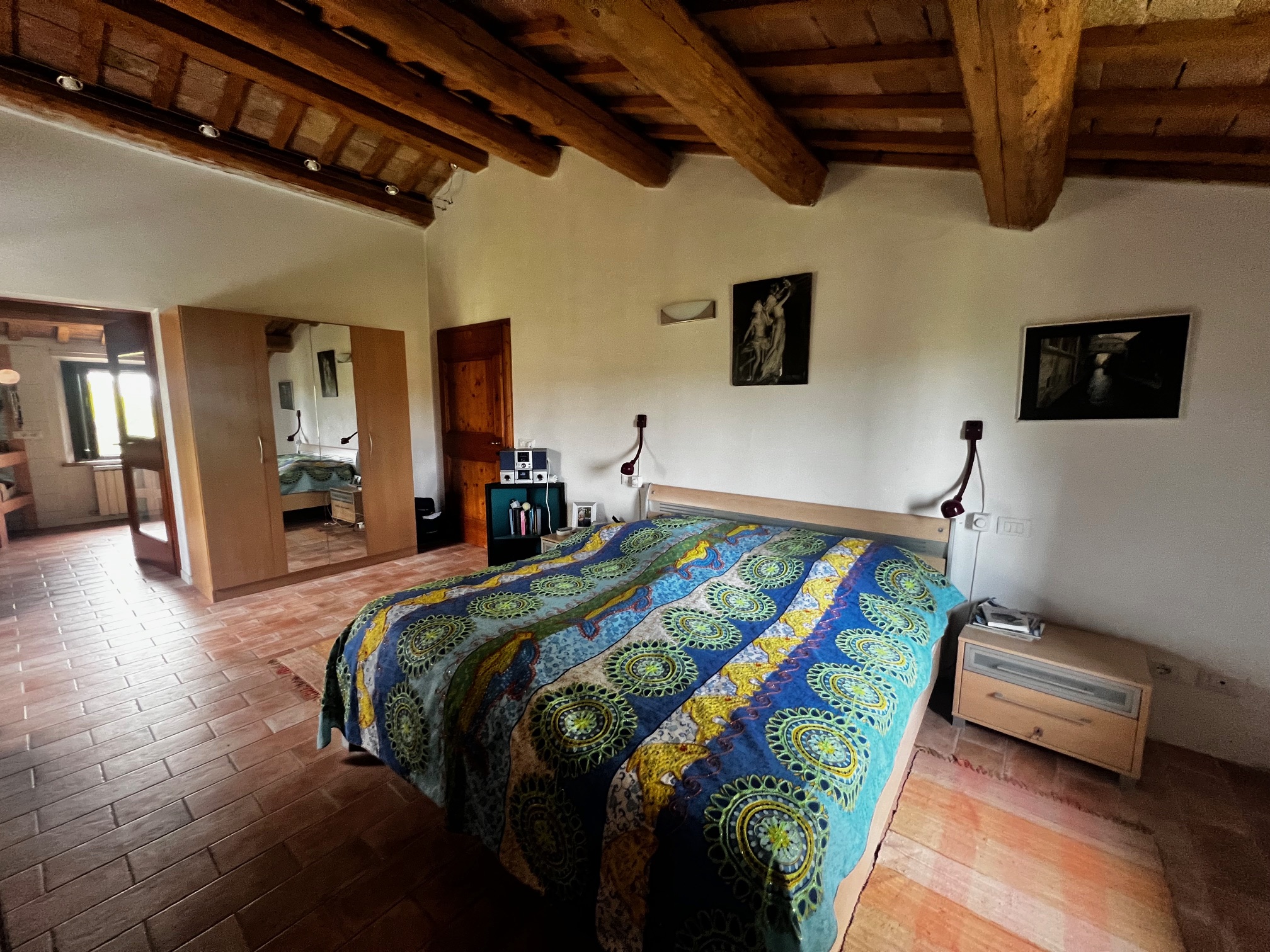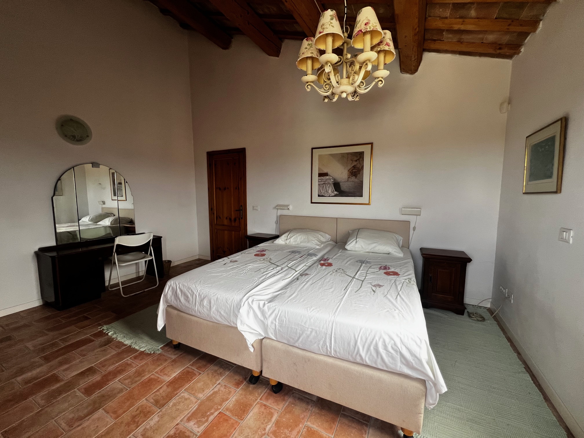 Un élégant escalier mène à la chambre principale avec salle de bains attenante équipée d'une très grande douche, de 2 lavabos, d'un bidet et de toilettes, un dressing (armoire, peut être utilisé comme petite chambre), un salon avec cheminée, 3 chambres et une salle de bains. Le premier étage est également accessible par un escalier extérieur .