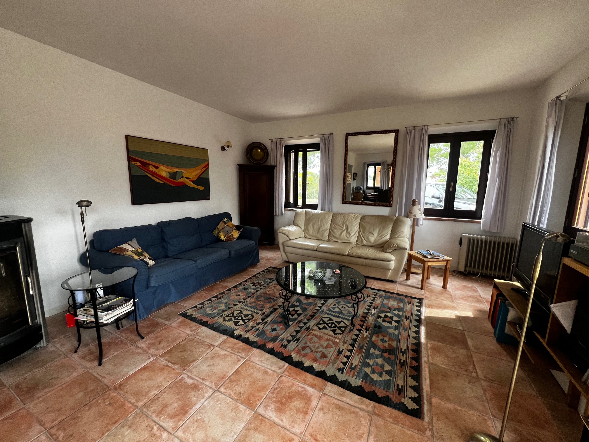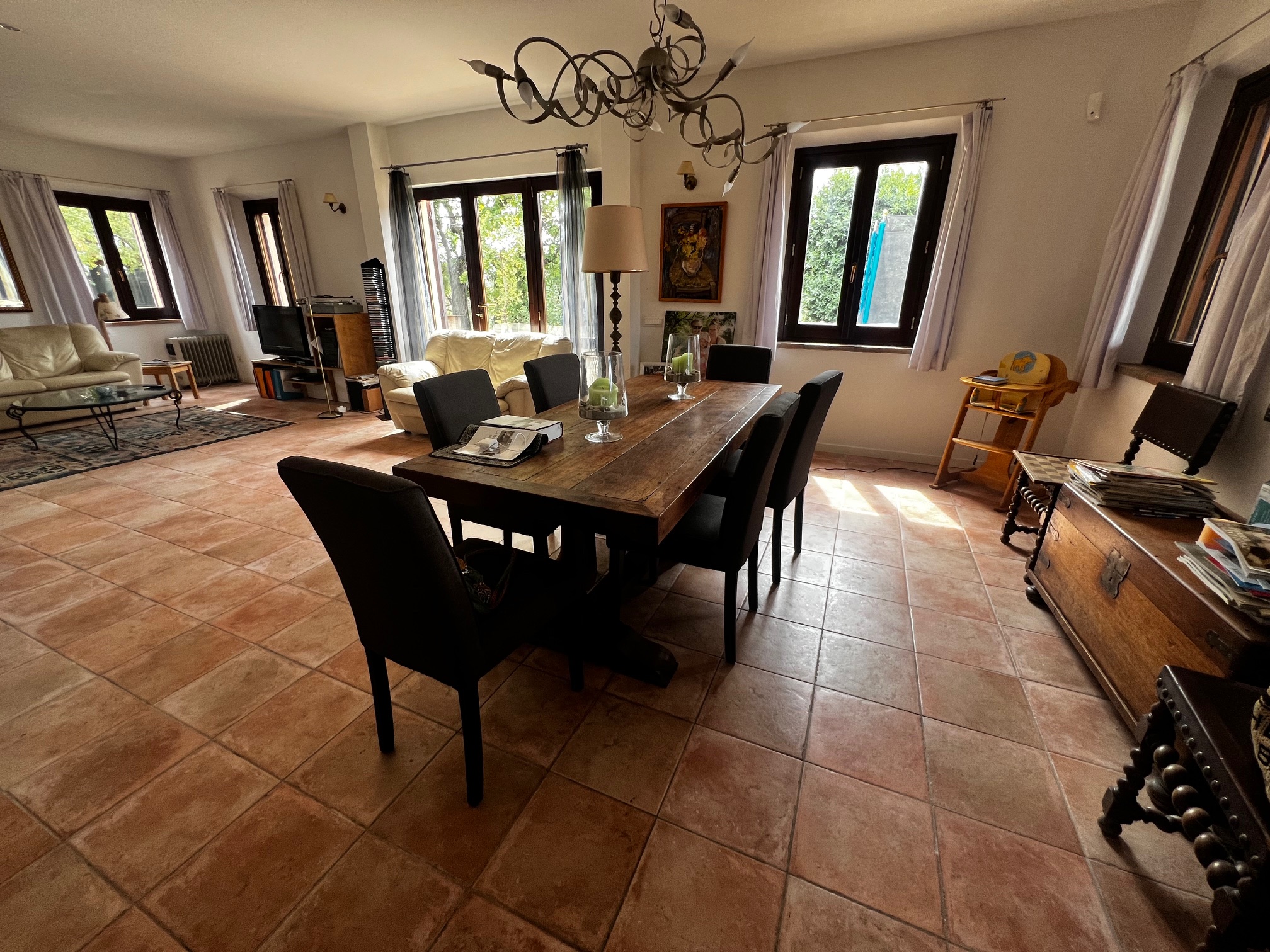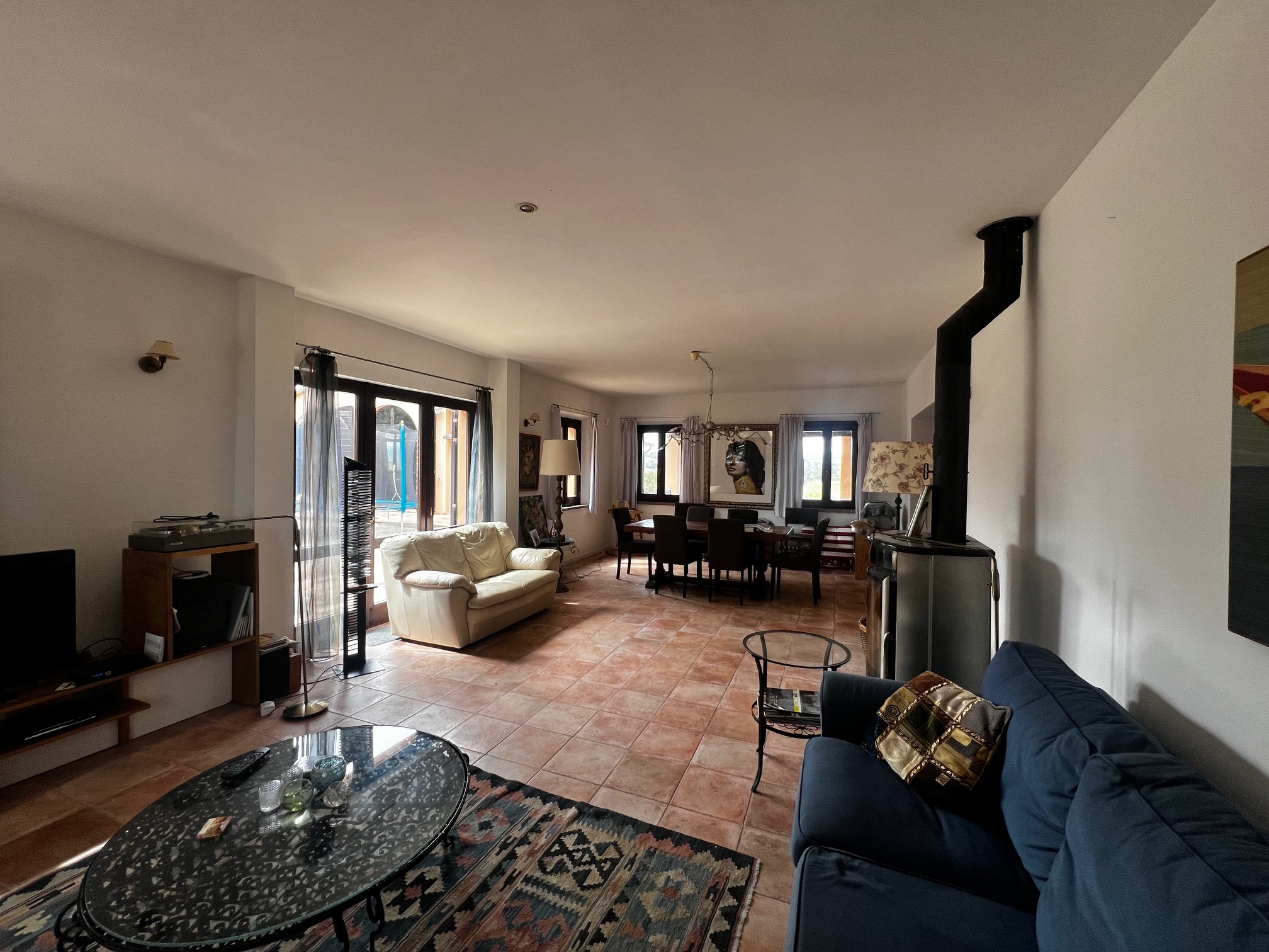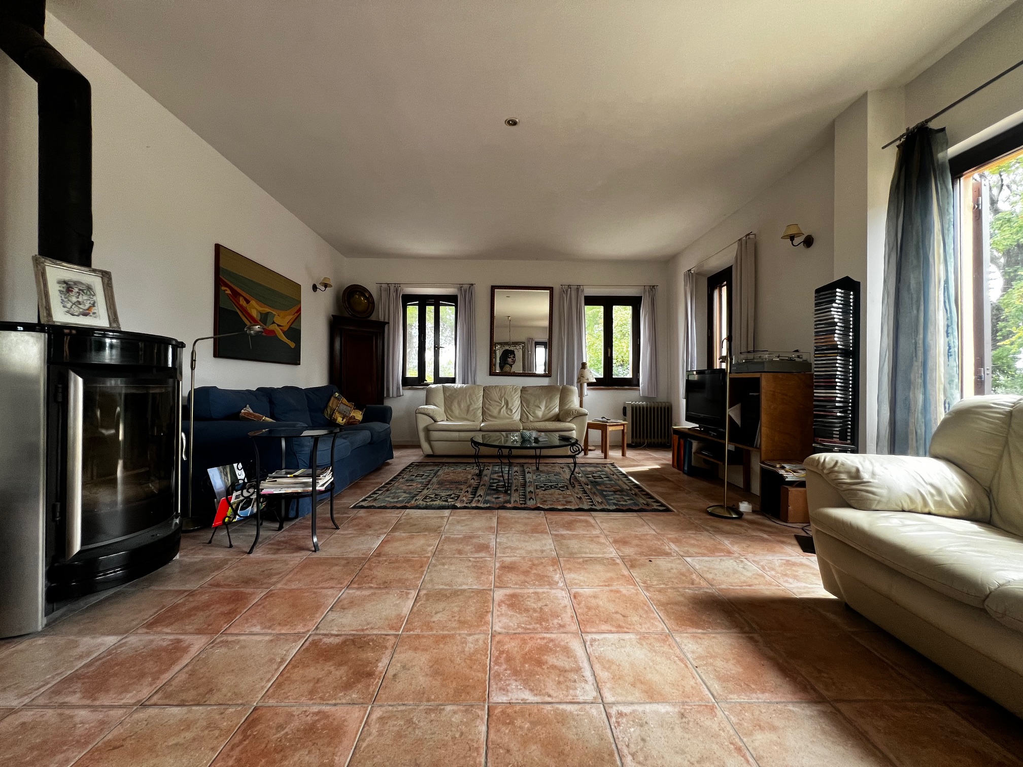 Aménagement : grand hall d'entrée avec accès à une salle de bain, plusieurs pièces de rangement, buanderie, bureau et local technique pour le chauffage central (la chaudière a besoin d'être remplacée). Le couloir mène également à la zone de vie avec une cuisine ouverte, une salle à manger et un salon avec un poêle à bois. Des portes-fenêtres mènent aux terrasses qui entourent la maison : à côté se trouve une belle véranda de 34 m² qui offre une vue magnifique sur la piscine et la campagne environnante.