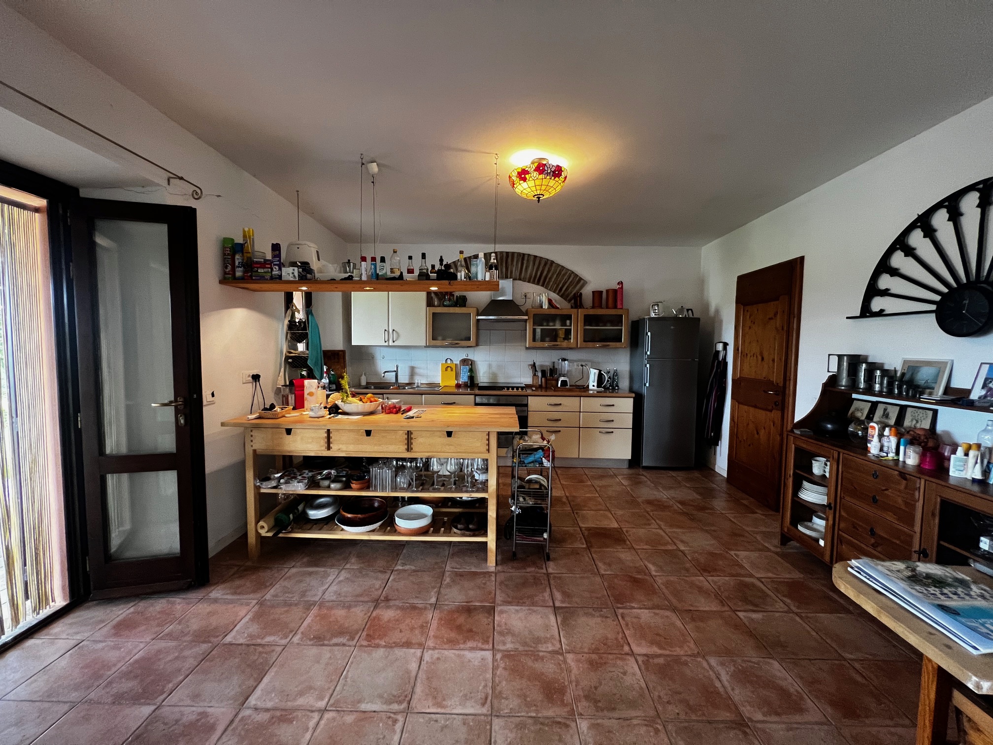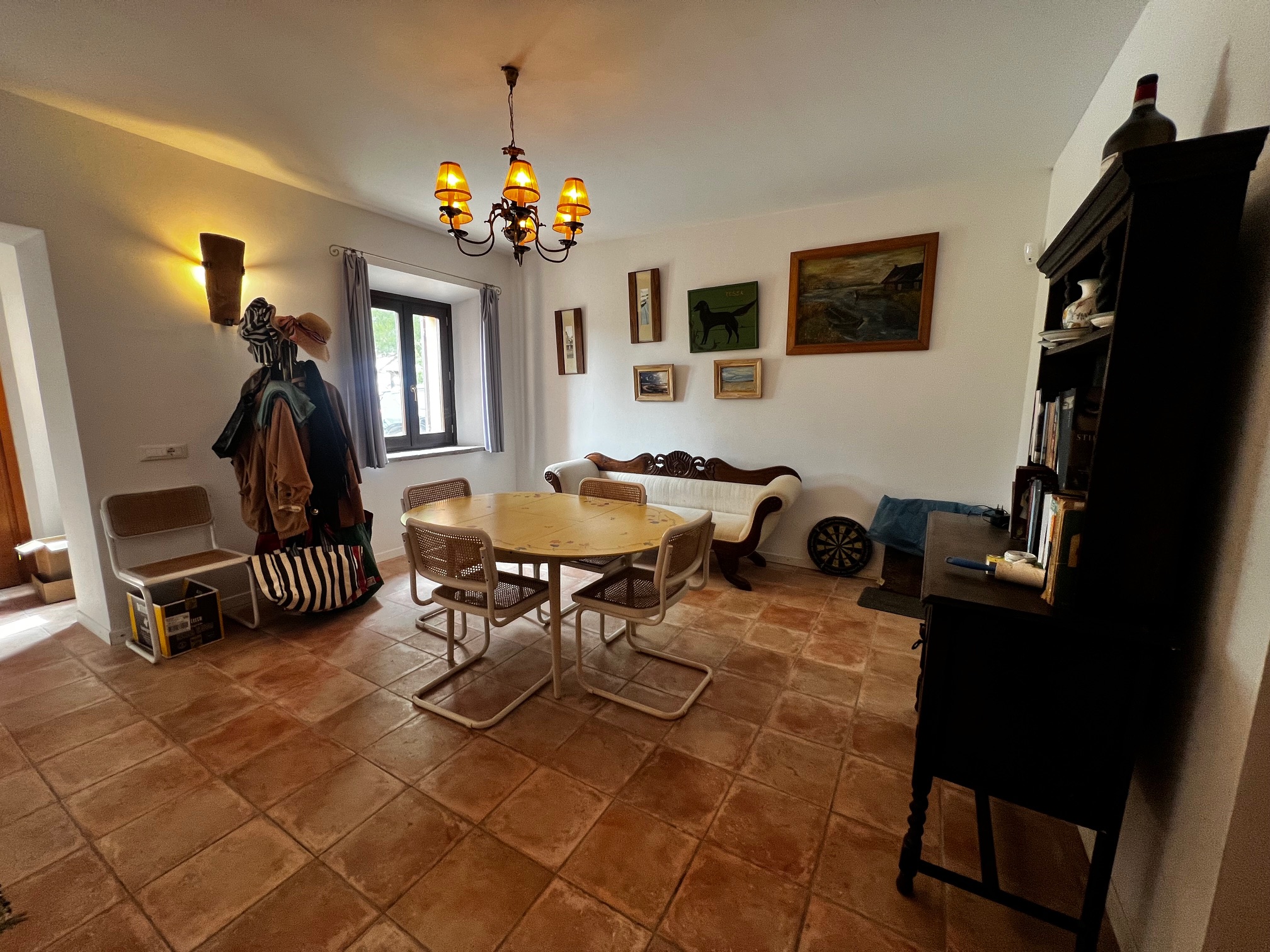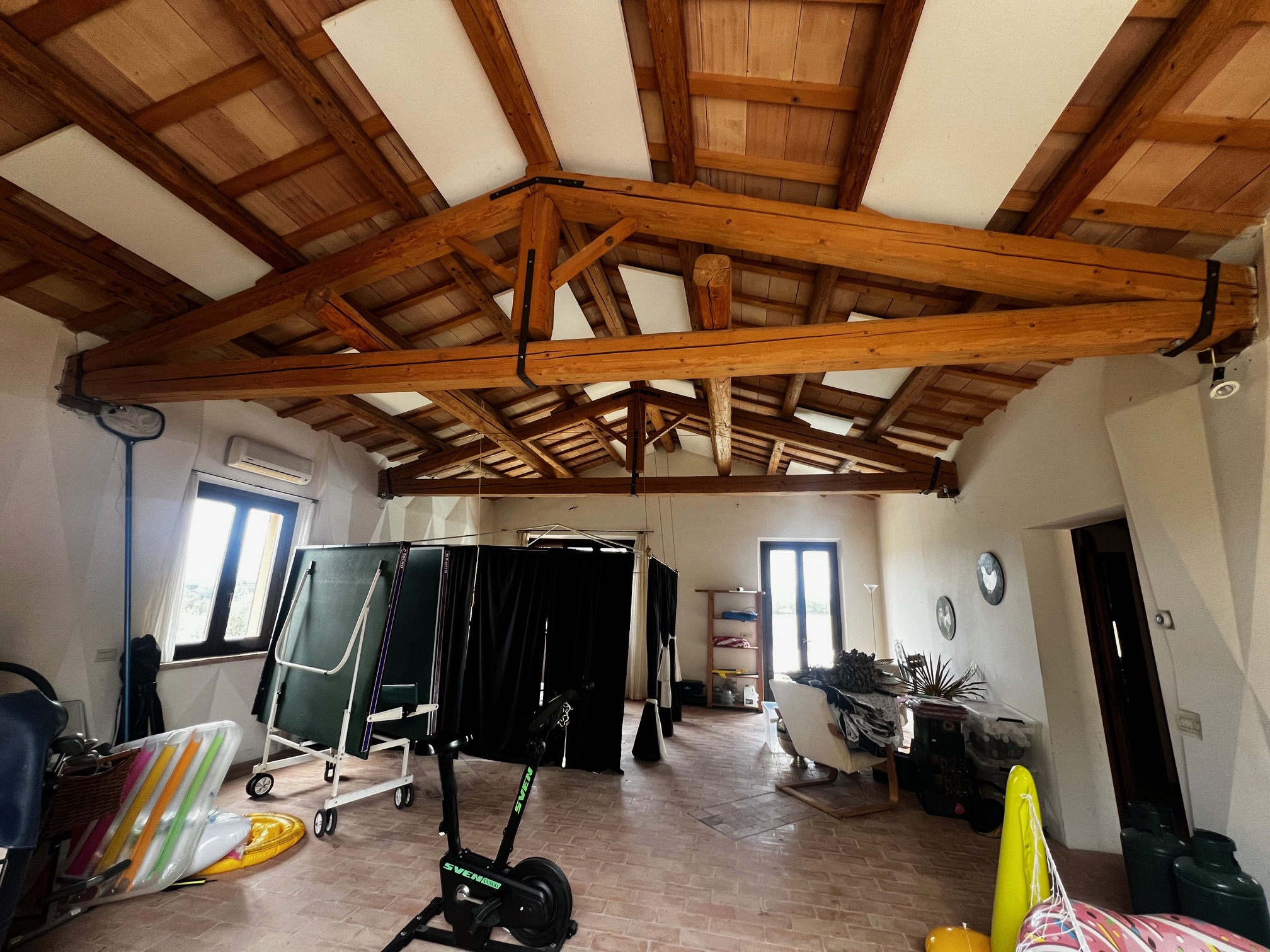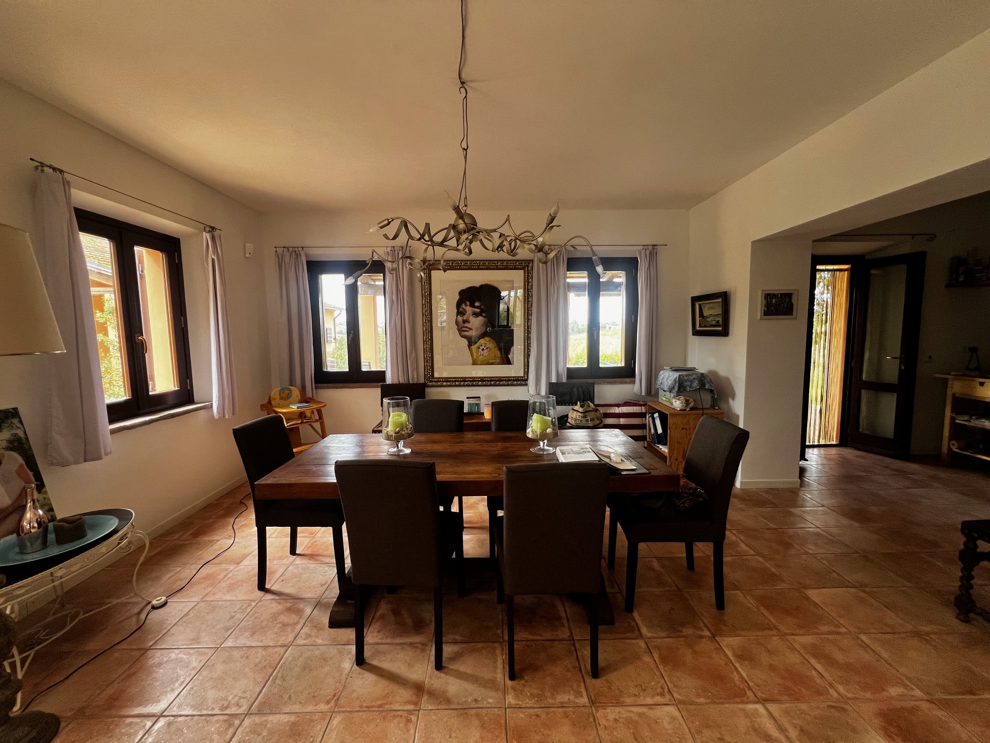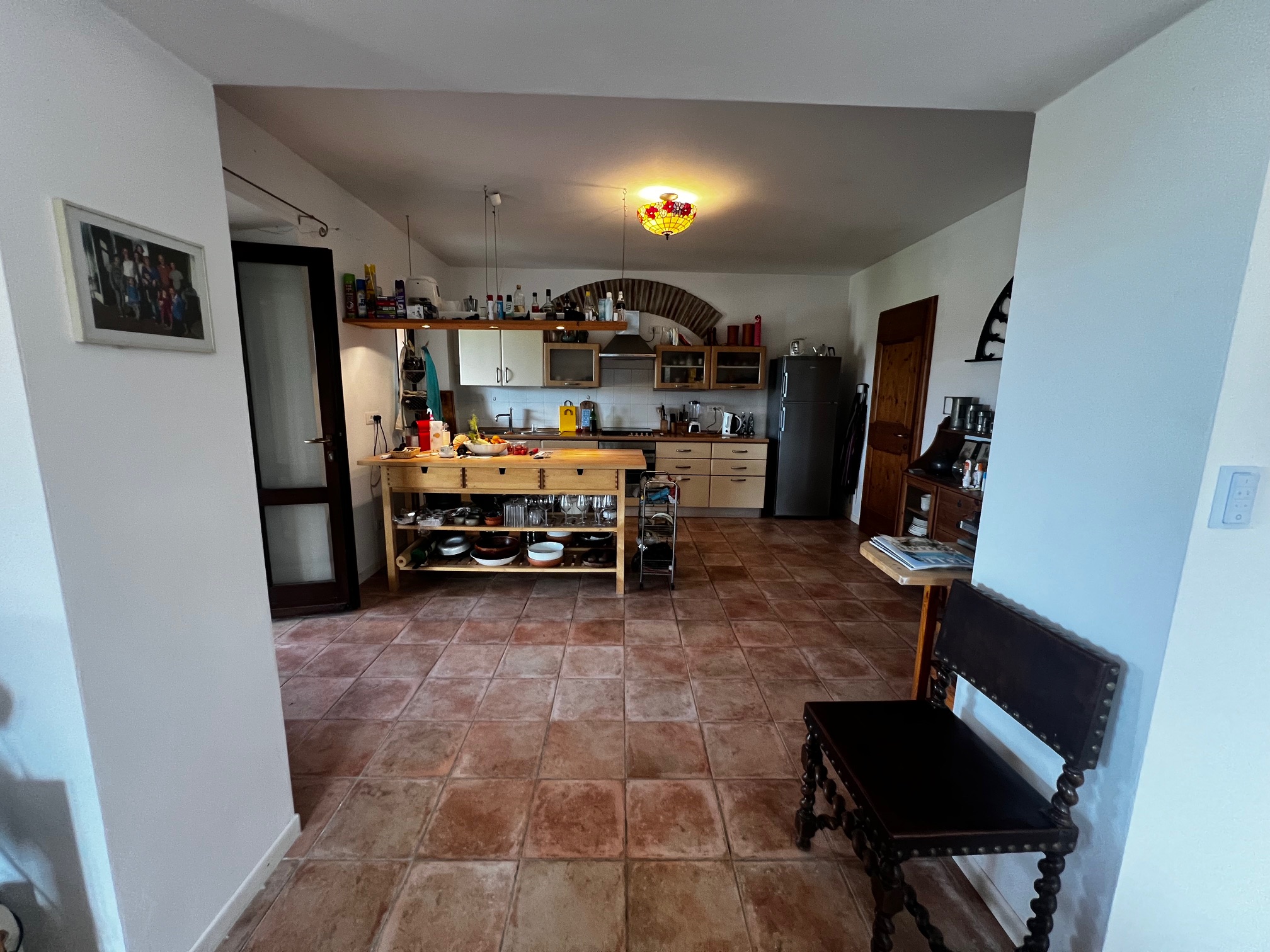 Aménagement : grand hall d'entrée avec accès à une salle de bain, plusieurs pièces de rangement, buanderie, bureau et local technique pour le chauffage central (la chaudière a besoin d'être remplacée). Le couloir mène également à la zone de vie avec une cuisine ouverte, une salle à manger et un salon avec un poêle à bois. Des portes-fenêtres mènent aux terrasses qui entourent la maison : à côté se trouve une belle véranda de 34 m² qui offre une vue magnifique sur la piscine et la campagne environnante.