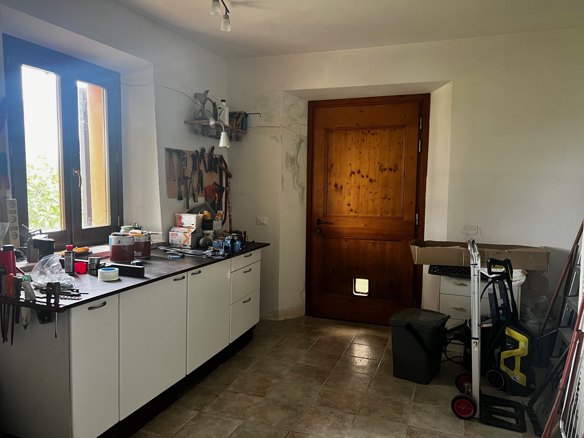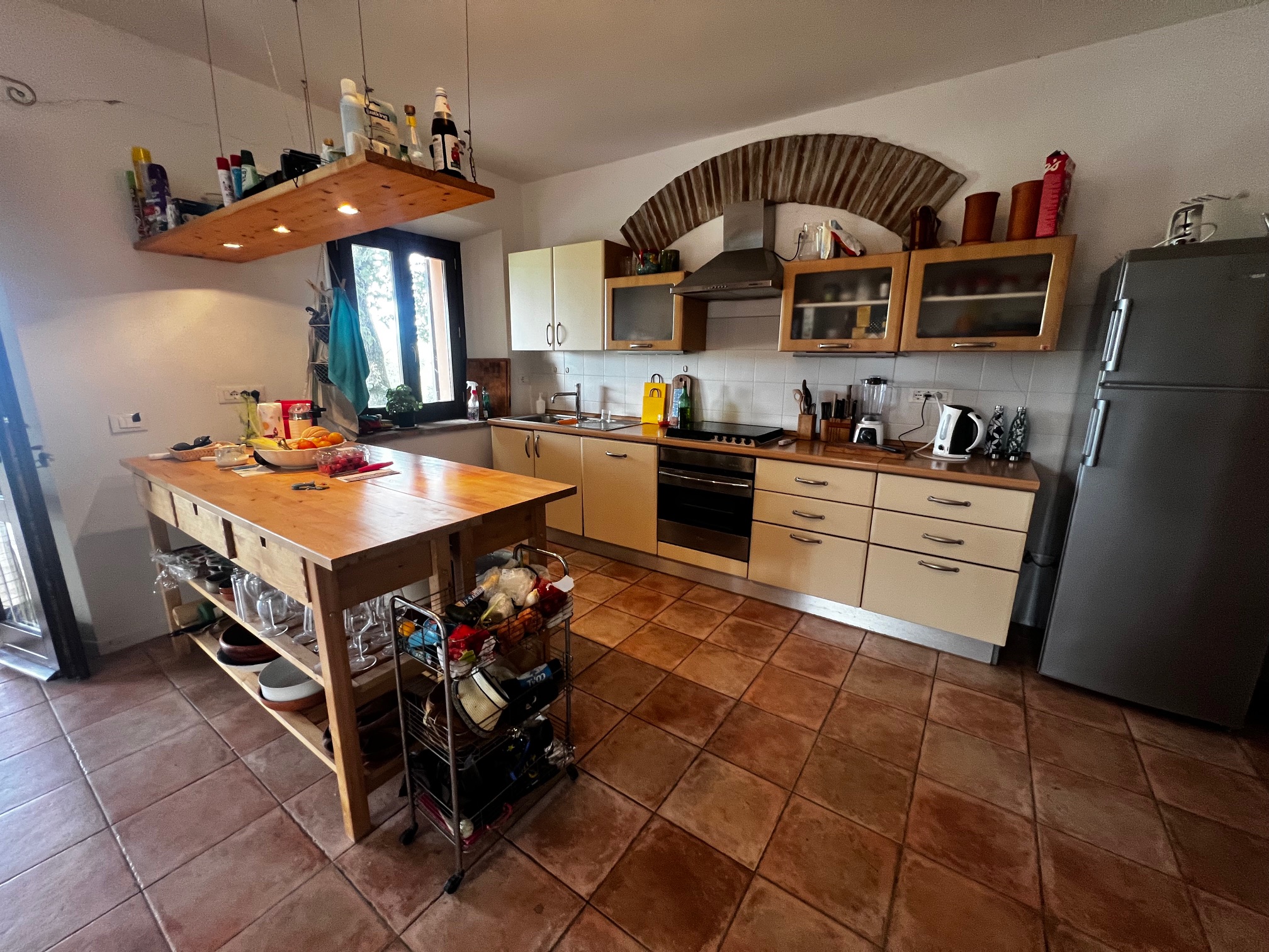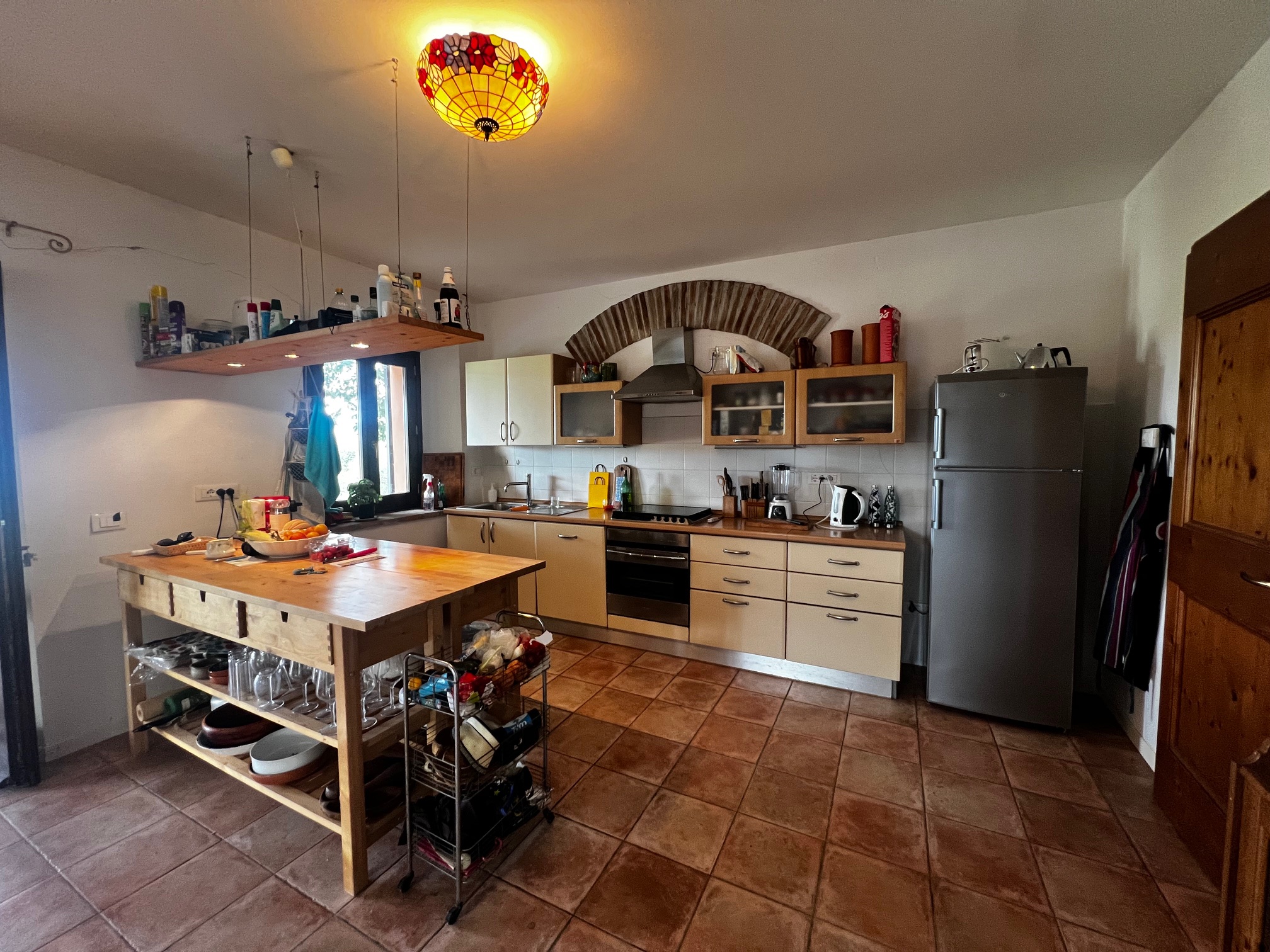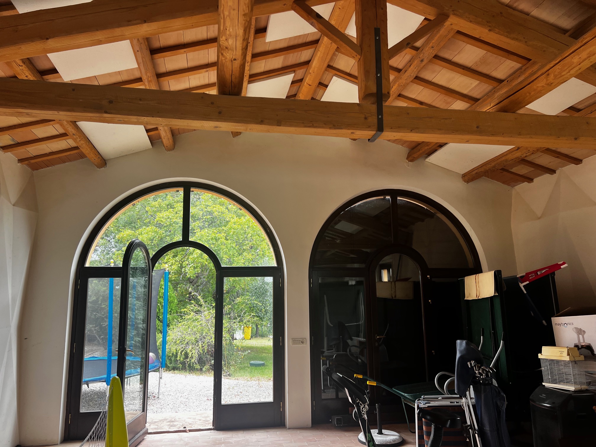 Aménagement : grand hall d'entrée avec accès à une salle de bain, plusieurs pièces de rangement, buanderie, bureau et local technique pour le chauffage central (la chaudière a besoin d'être remplacée). Le couloir mène également à la zone de vie avec une cuisine ouverte, une salle à manger et un salon avec un poêle à bois. Des portes-fenêtres mènent aux terrasses qui entourent la maison : à côté se trouve une belle véranda de 34 m² qui offre une vue magnifique sur la piscine et la campagne environnante.