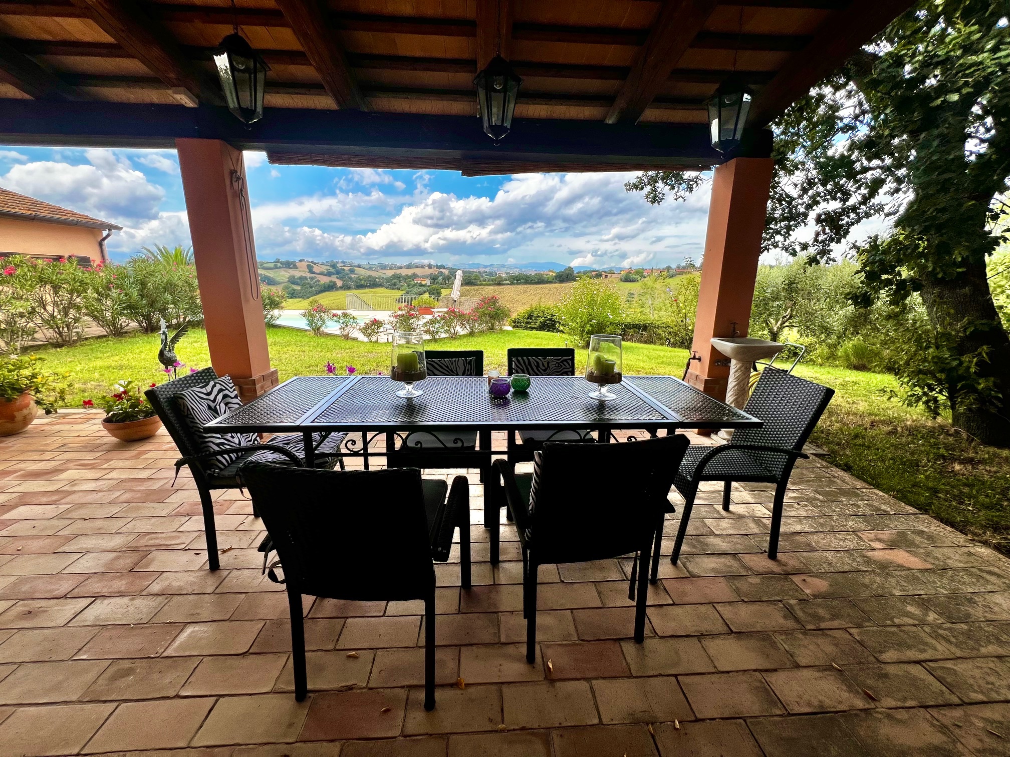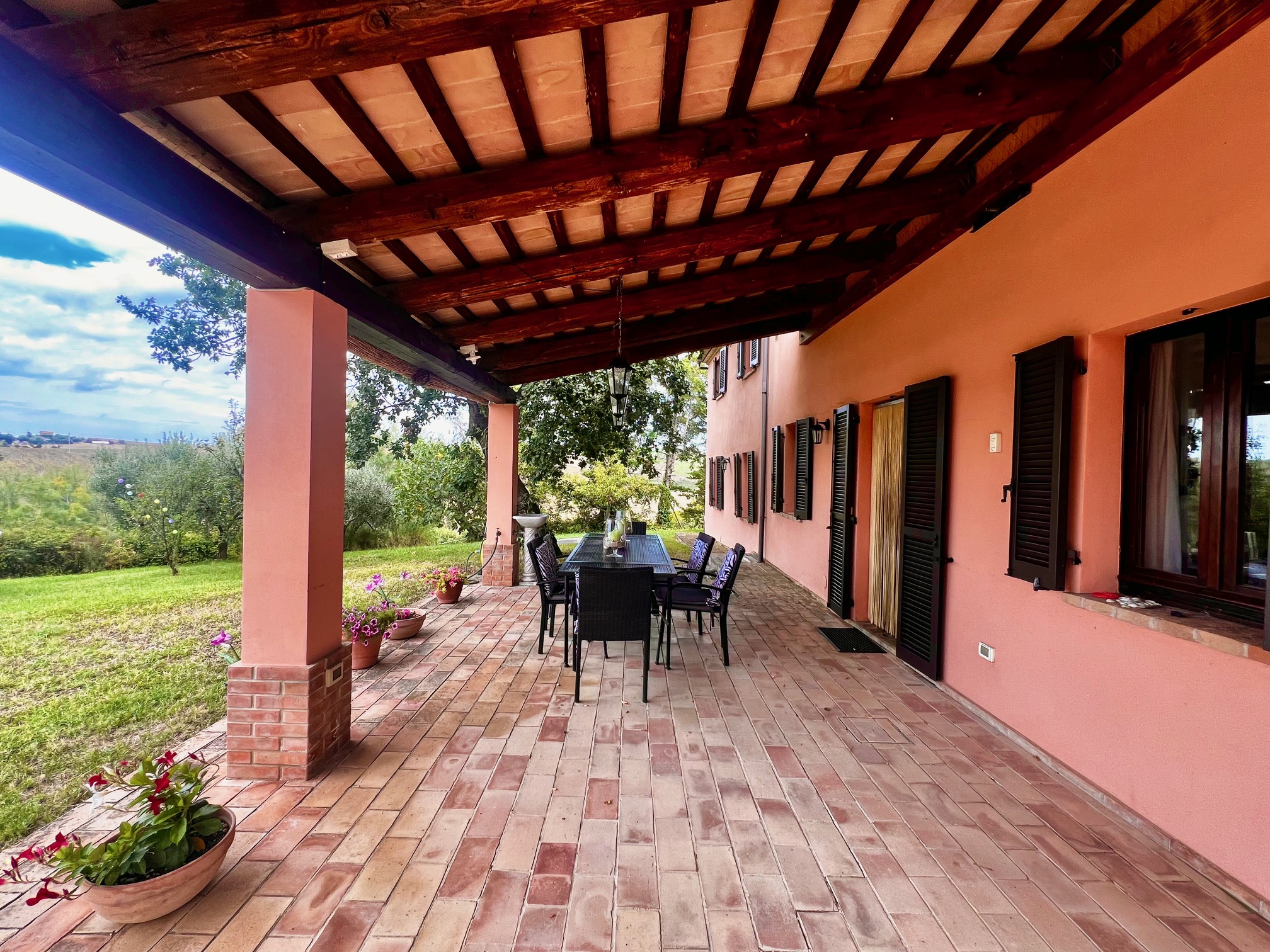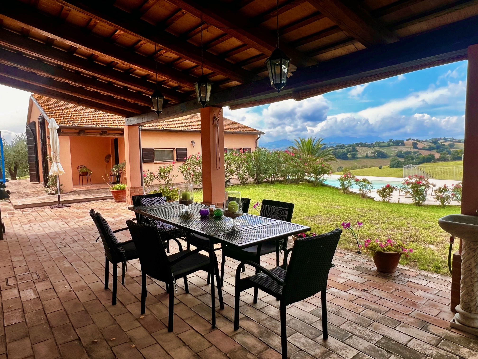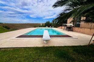 Cette belle maison de campagne avec annexe et piscine est située sur une colline près de Castelleone di Suasa, avec une vue magnifique sur cette ville médiévale, Ostra Vetere et Barbara de l'aube au crépuscule.