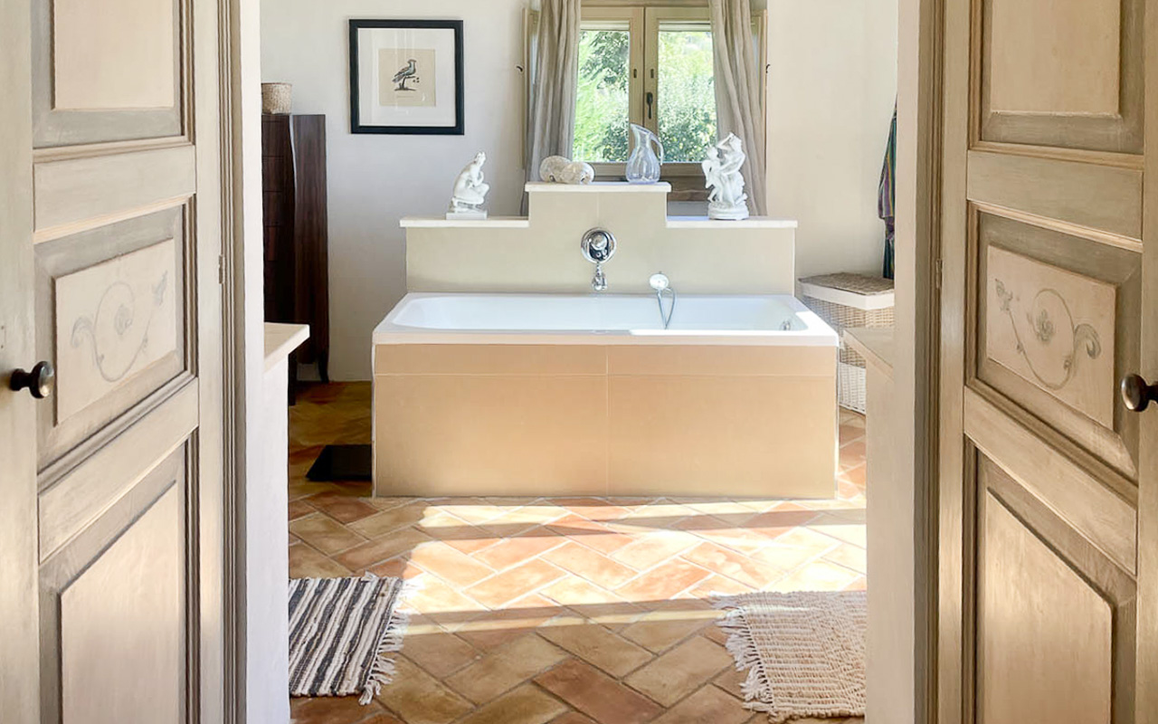 Spanning 303 sqm over two floors, plus a 40 sqm portico and a 33 sqm panoramic terrace, the villa exudes warmth and character. A stone staircase leads to the main entrance, sheltered by a wrought-iron and glass canopy. The perimeter of the villa is fully paved in traditional terracotta.
