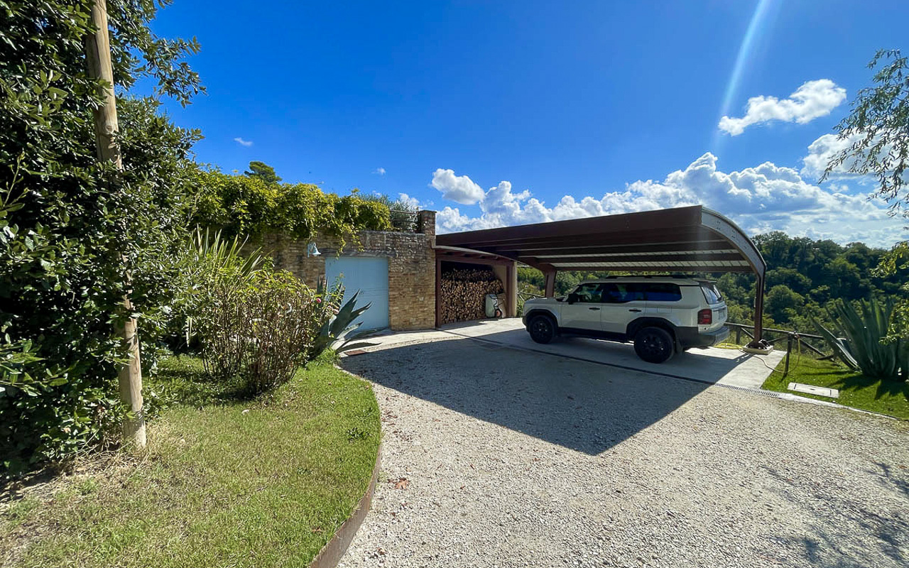 Next to the parking area, there is a 25 sqm cellar/garage, a carport with photovoltaic panels, and a large wood shed.