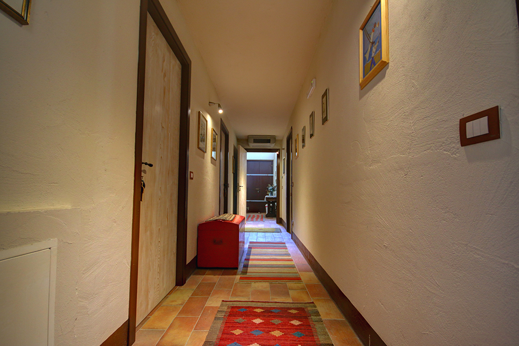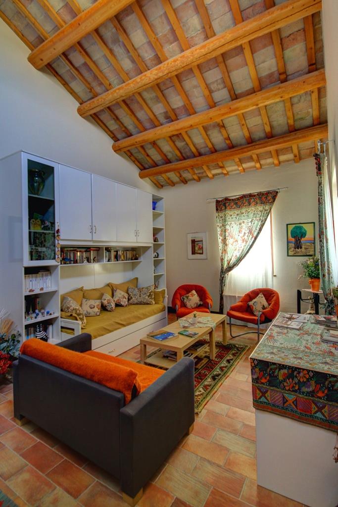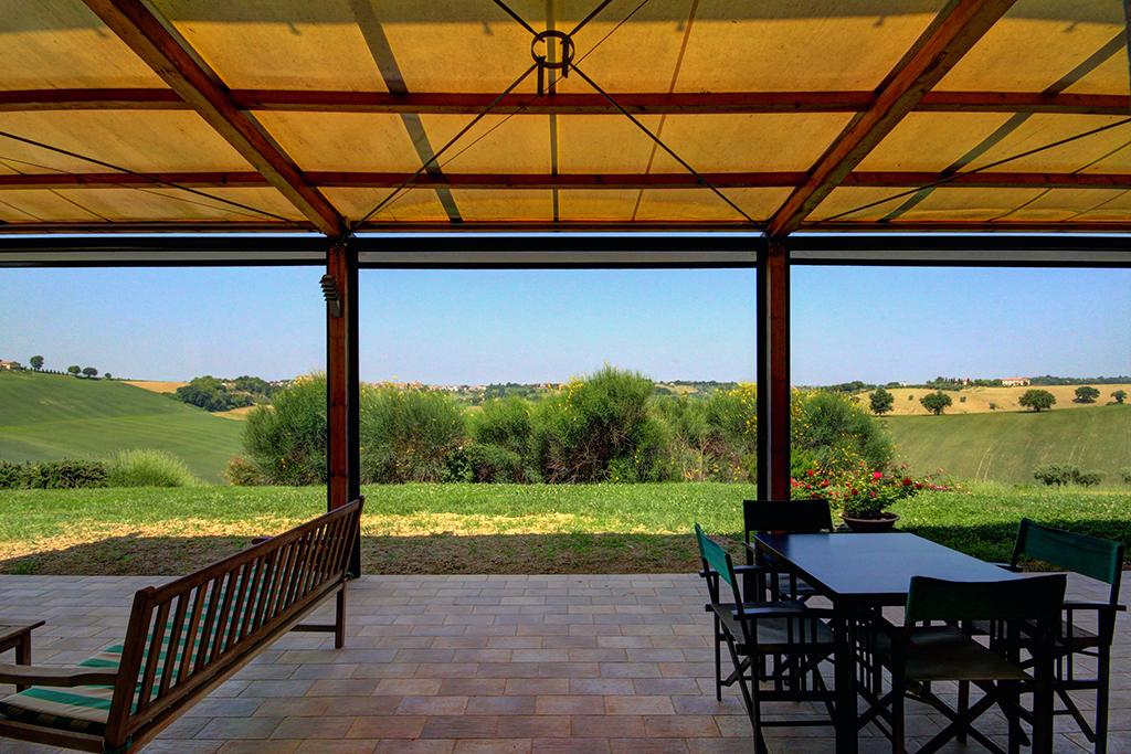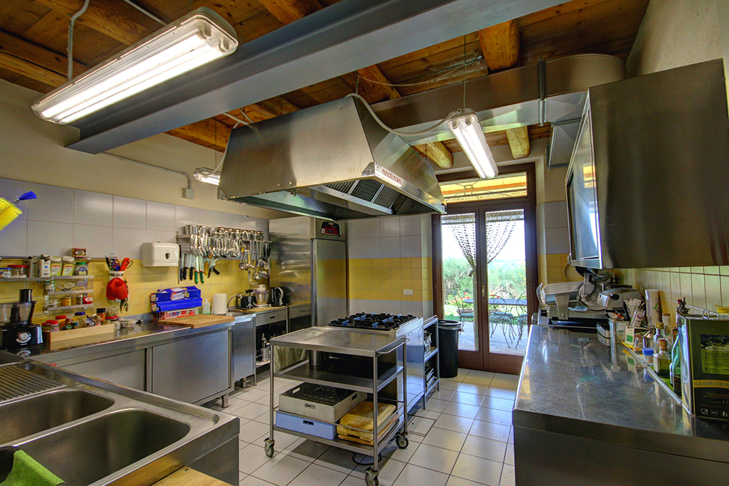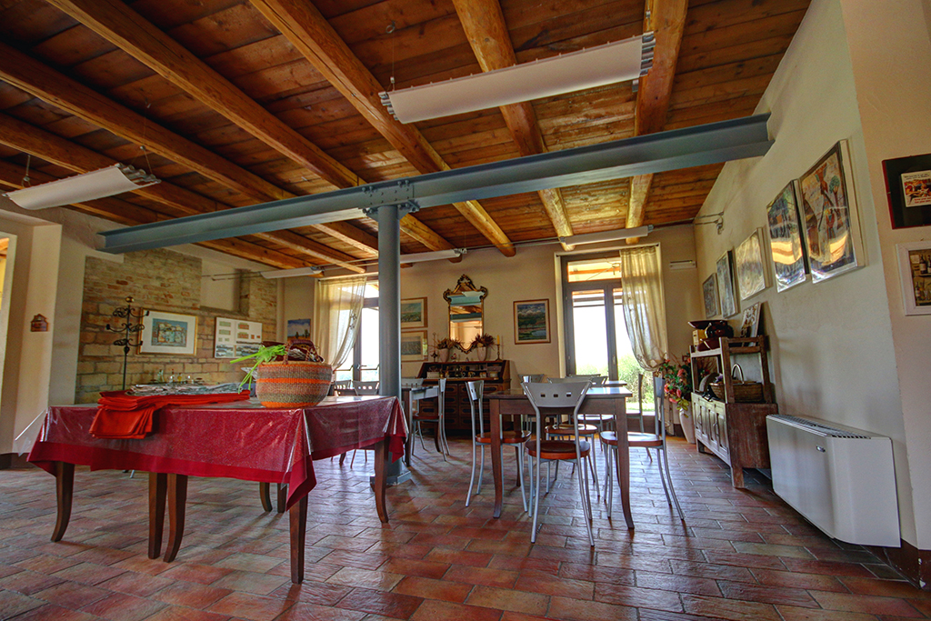 Côté panoramique, une véranda couverte (88 m²) permet de manger en plein air par beau temps ou de se détendre et d'admirer la vue, peut-être avec un bon verre de Verdicchio, typique de la région. Toujours au rez-de-chaussée se trouvent la cuisine professionnelle, plusieurs débarras, 2 salles de bain, trois mini-appartements avec entrée indépendante, chacun avec cuisine, salle de bain et chambre avec lit double - idéal pour deux personnes ou une petite famille avec un enfant, idéal pour ceux qui décident de développer une activité touristique, comme les B&B et les retraites (yoga) .