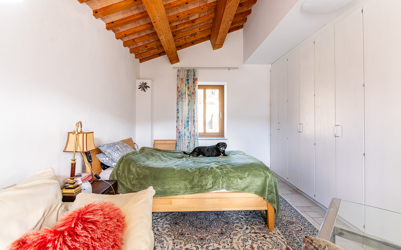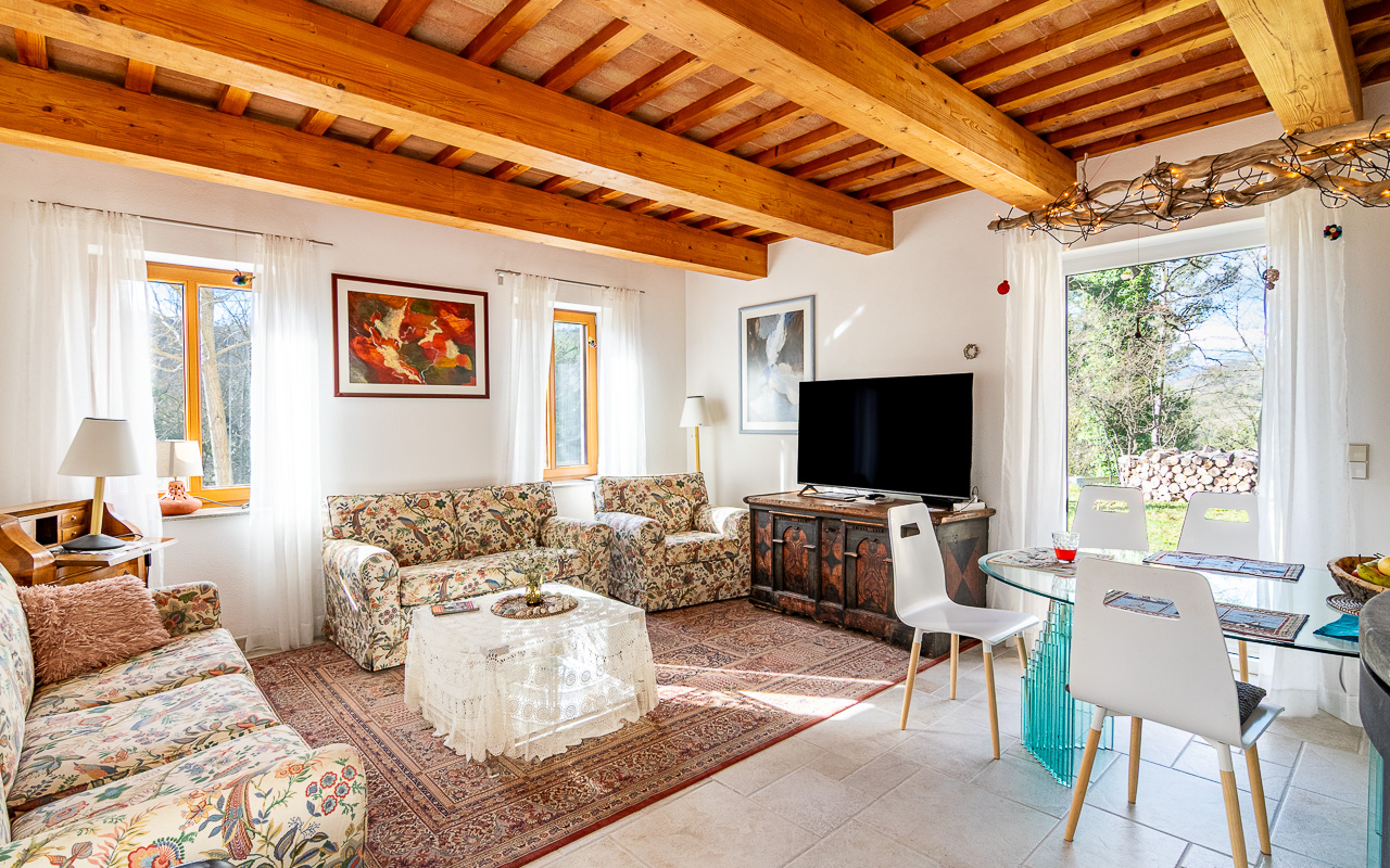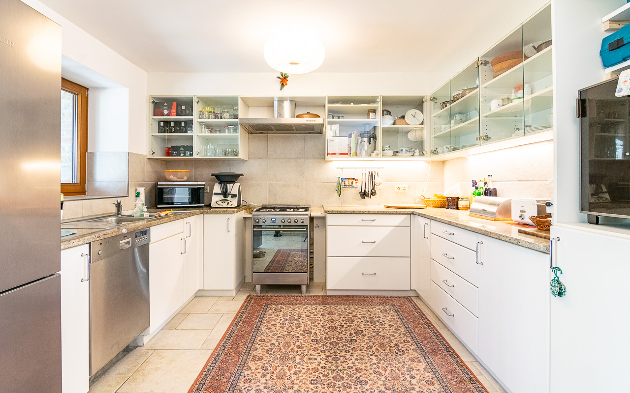 On the ground floor there is a very bright living room and a kitchen, creating a welcoming and practical living area. The interiors are finished with cream-coloured floor tiles laid in a Romanesque pattern throughout, creating a harmonious and elegant feel.