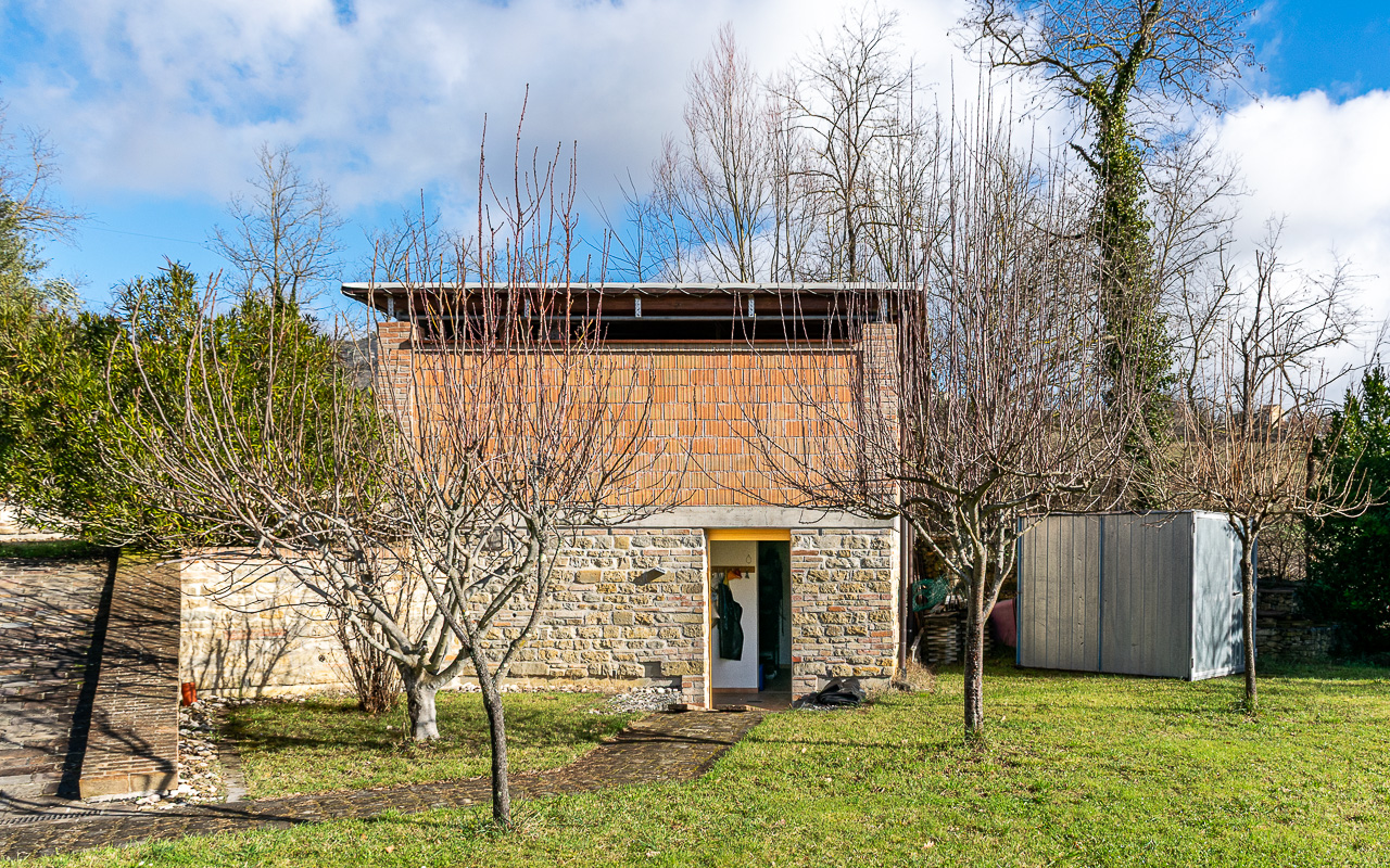 The exterior walls, with a total thickness of 70 cm, are constructed of perforated brick, rock wool insulation, a ventilated air cavity, and natural stone.