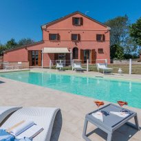 Cette maison de campagne entièrement rénovée en 1998, avec piscine et vue sur la mer, est située dans le magnifique paysage des Marches, dans la commune de San Constanzo, à 12 km de Fano et de la côte adriatique.