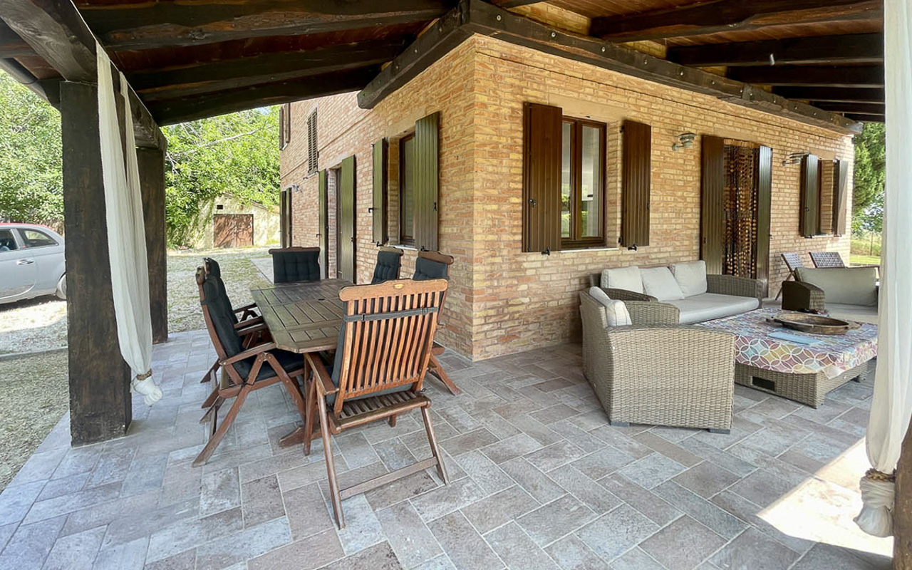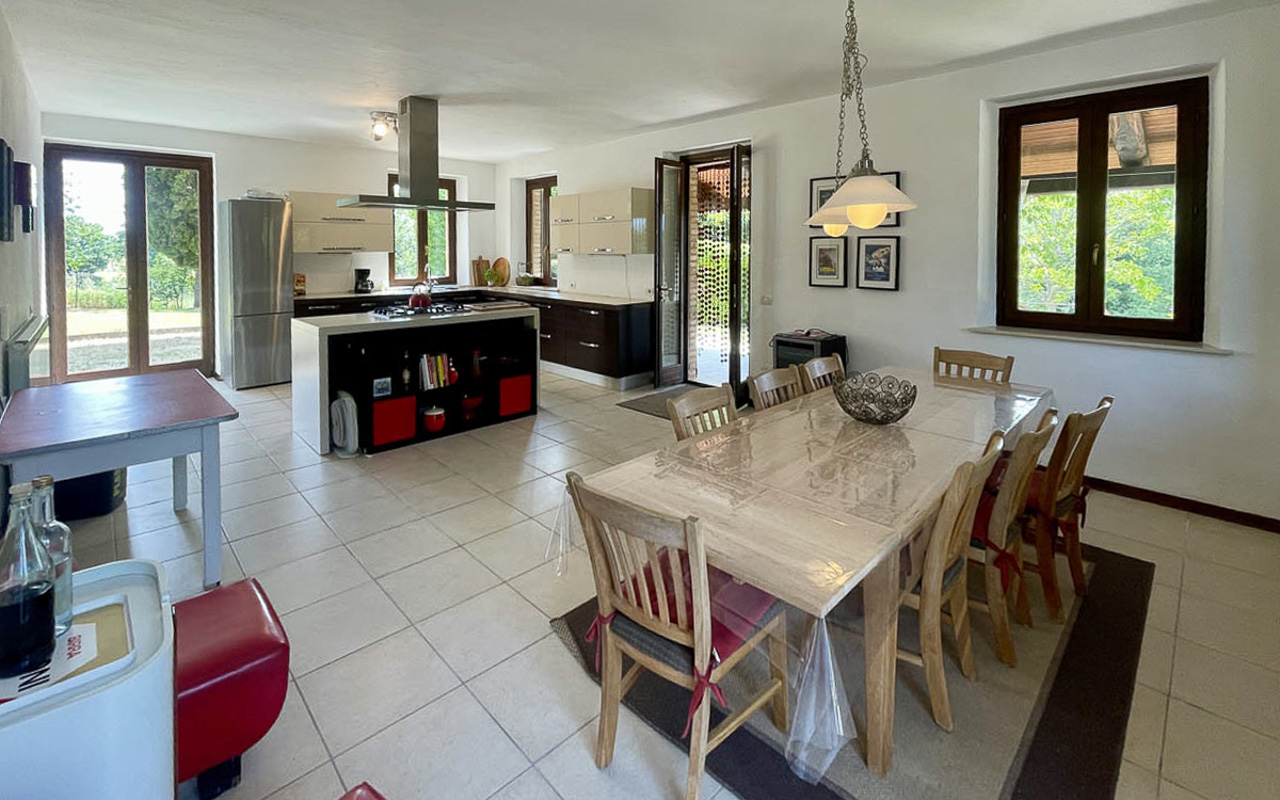 The main house is arranged over three levels, including the attic. On the ground floor there is a covered porch of approx. 28 sqm, ideal as a summer living and dining area. From here you enter the spacious and bright kitchen-dining room, the heart of the home. The floor also comprises a living room, entrance hallway and a guest bathroom located under the staircase.