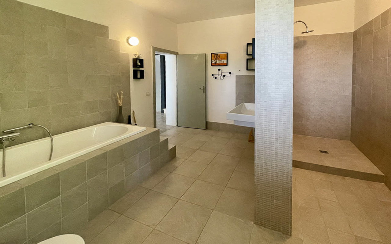 The internal staircase leads to the first floor, where a large hallway with access to a panoramic balcony distributes the sleeping area. Here there are three double bedrooms, including a master bedroom with en-suite bathroom with shower, as well as a second bathroom equipped with both a large shower and a bathtub.