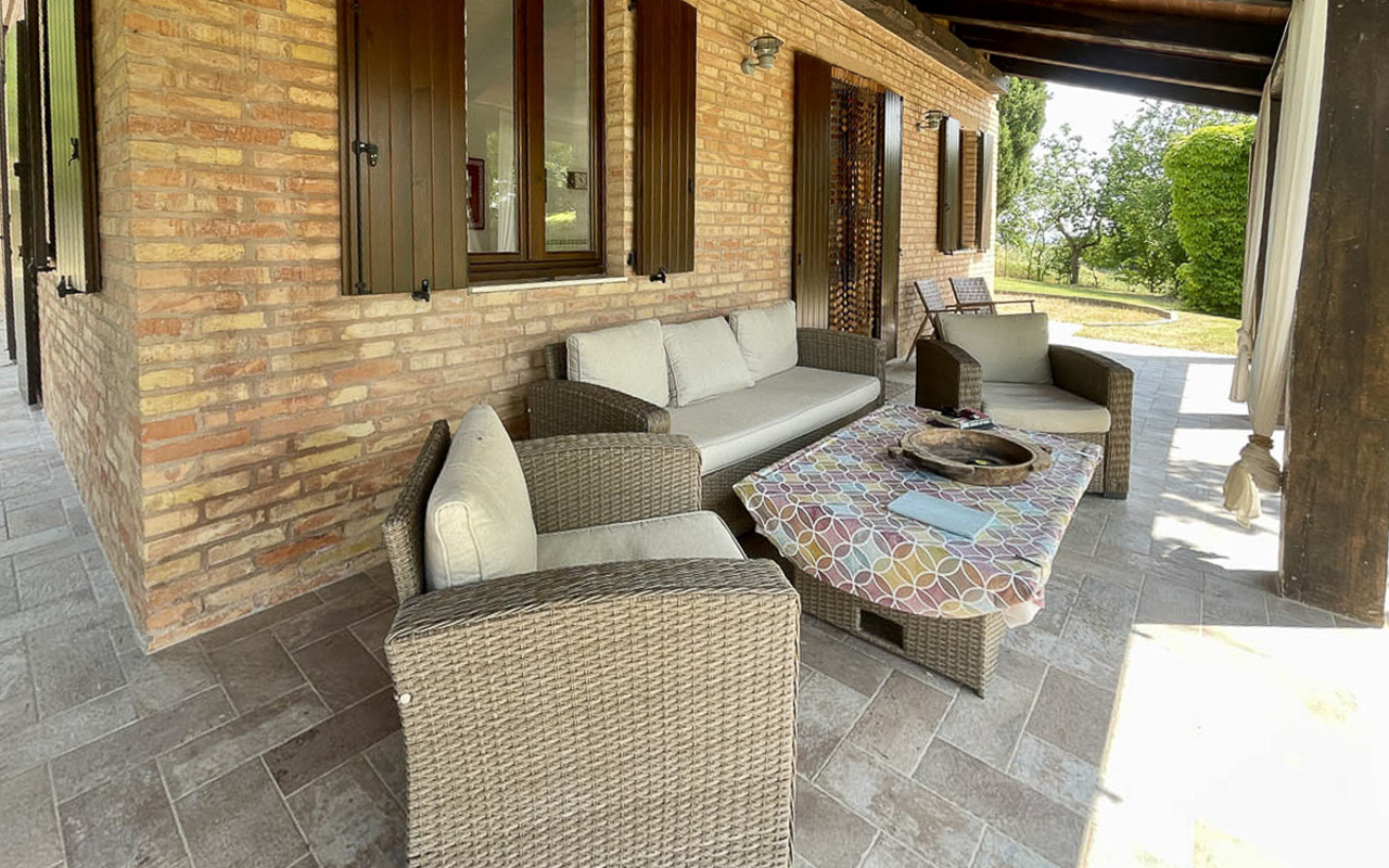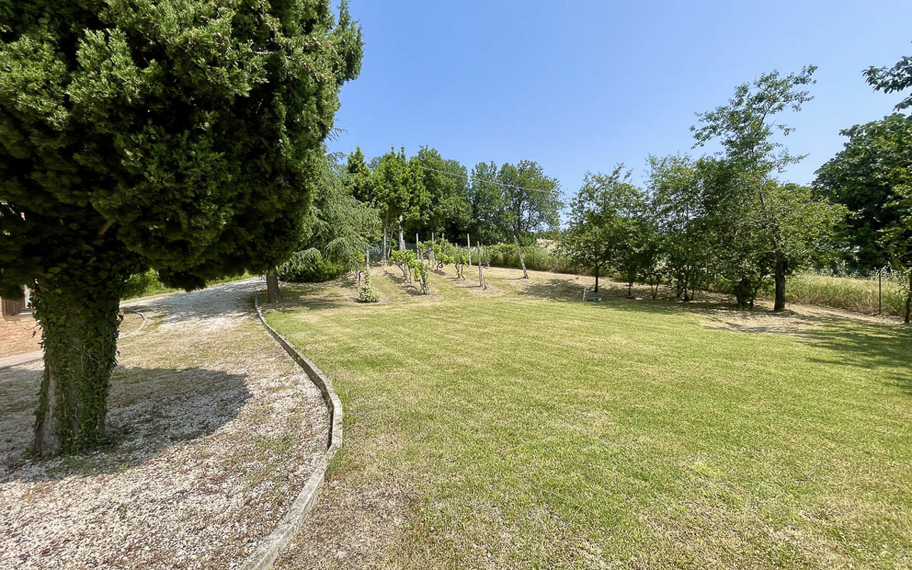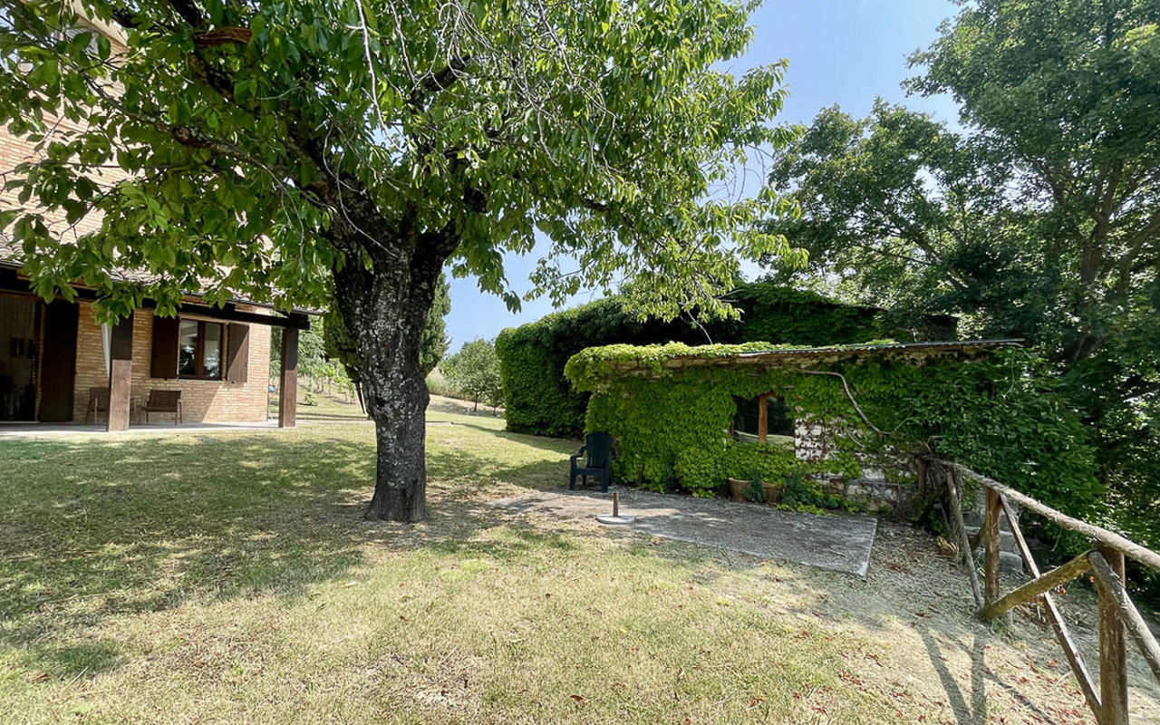 The garden completely surrounds the buildings and is entirely fenced. Passing through the entrance gate, you reach the parking area and then the well-kept green spaces, with the villa positioned at the centre of the plot.