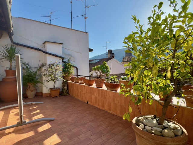 La terrasse sur le toit, largement couverte et d'une superficie d'environ 52 m², constitue un atout particulier. Vous pouvez vous y détendre, profiter du soleil et admirer la vue imprenable sur les toits de la vieille ville et les collines environnantes. La cuisine d'été avec cheminée fait de la terrasse l'endroit idéal pour des barbecues agréables.
