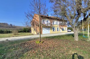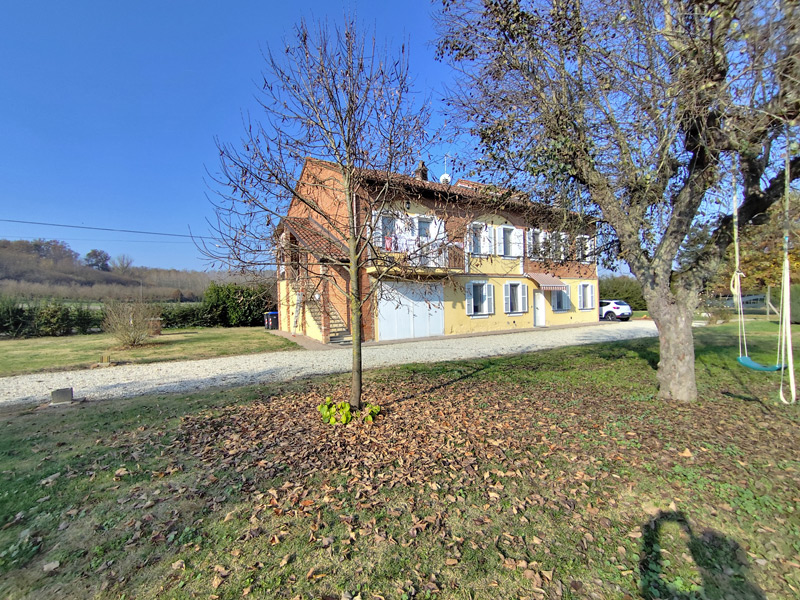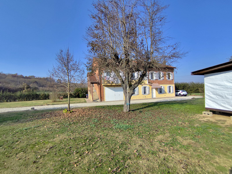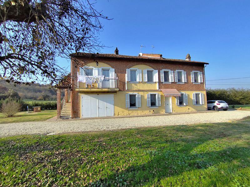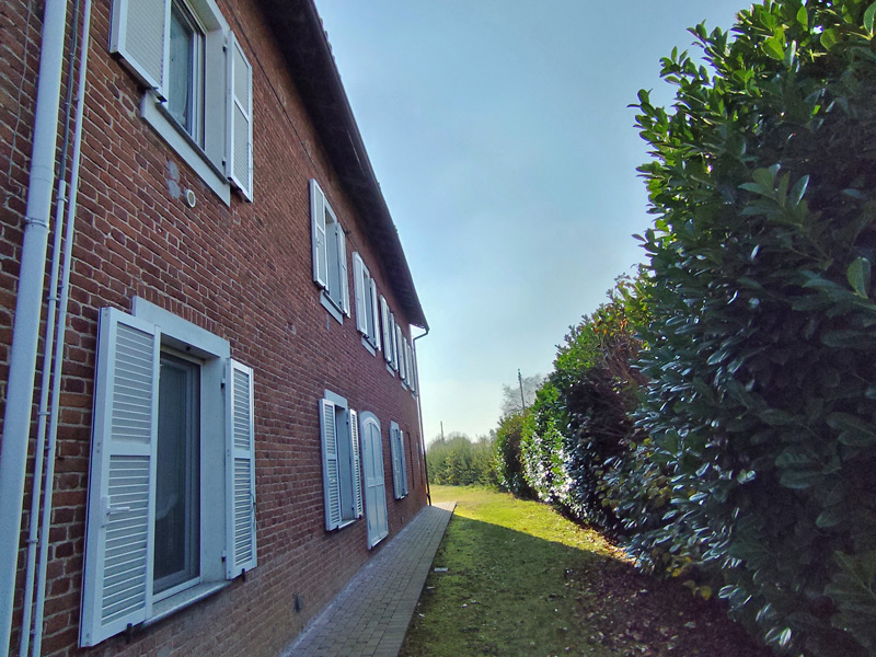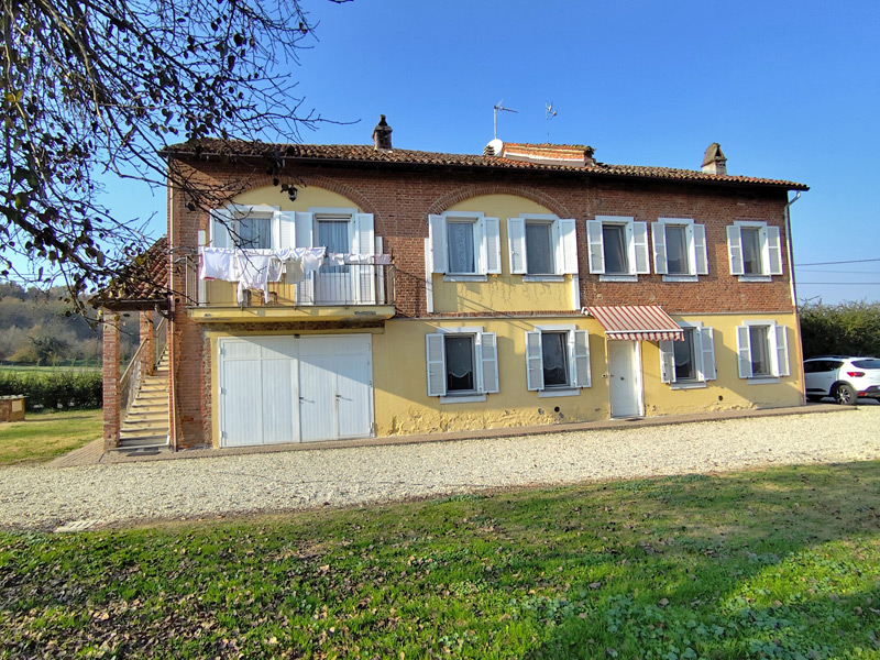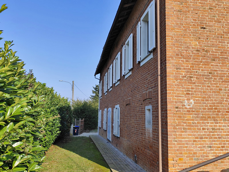 Cette grande ferme piémontaise rénovée est située dans un cadre tranquille et verdoyant de la commune de Masio, entourée d'un hectare de terrain entièrement clôturé. Dès le premier instant, le bâtiment dégage le charme authentique des maisons rurales du Monferrato, avec ses briques apparentes, ses volets blancs et la luminosité typique des maisons exposées au soleil.