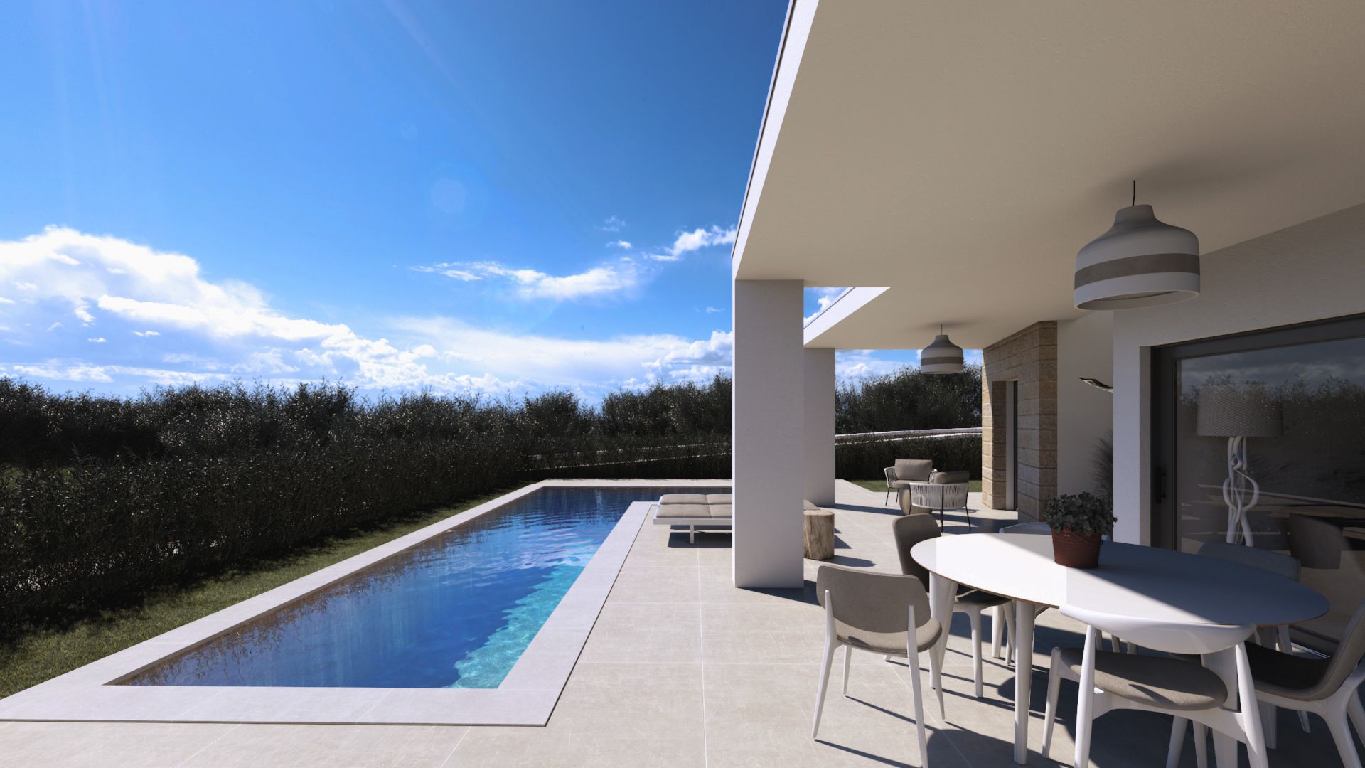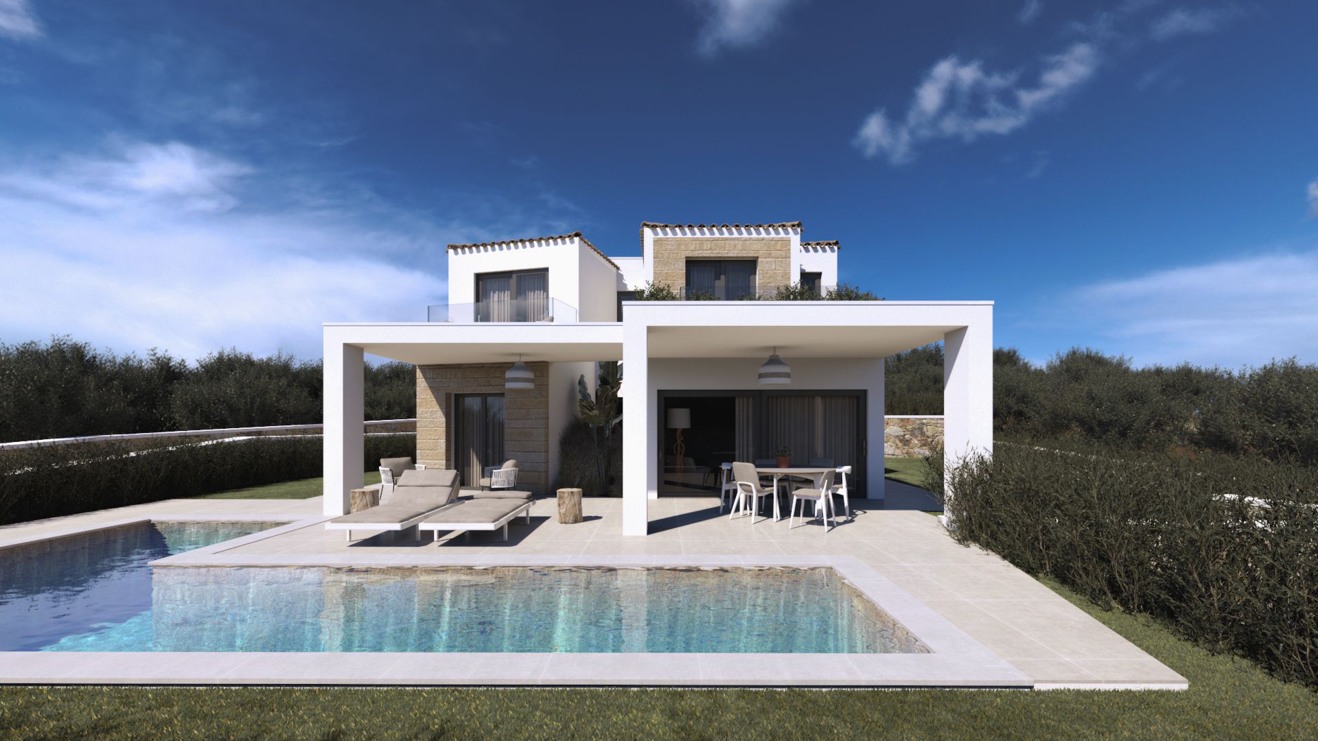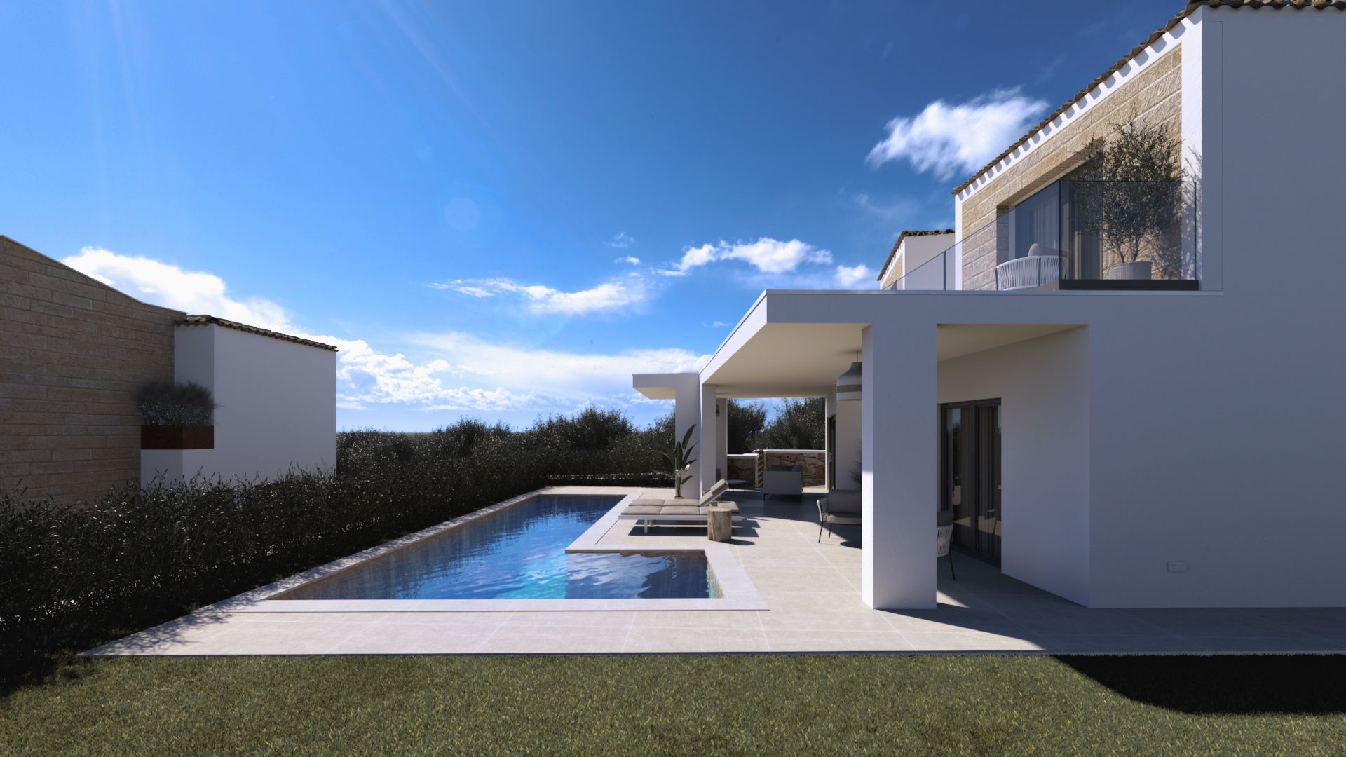 À l'intérieur, de grandes fenêtres coulissantes en aluminium à double vitrage apportent une lumière merveilleuse et une transition transparente entre l'intérieur et l'extérieur. Cela crée une sensation d'ouverture et d'aération parfaitement adaptée à la vie méditerranéenne. Grâce aux panneaux solaires intégrés, vous bénéficiez également d'une efficacité énergétique et d'une réduction des coûts, un investissement rentable pour l'avenir.