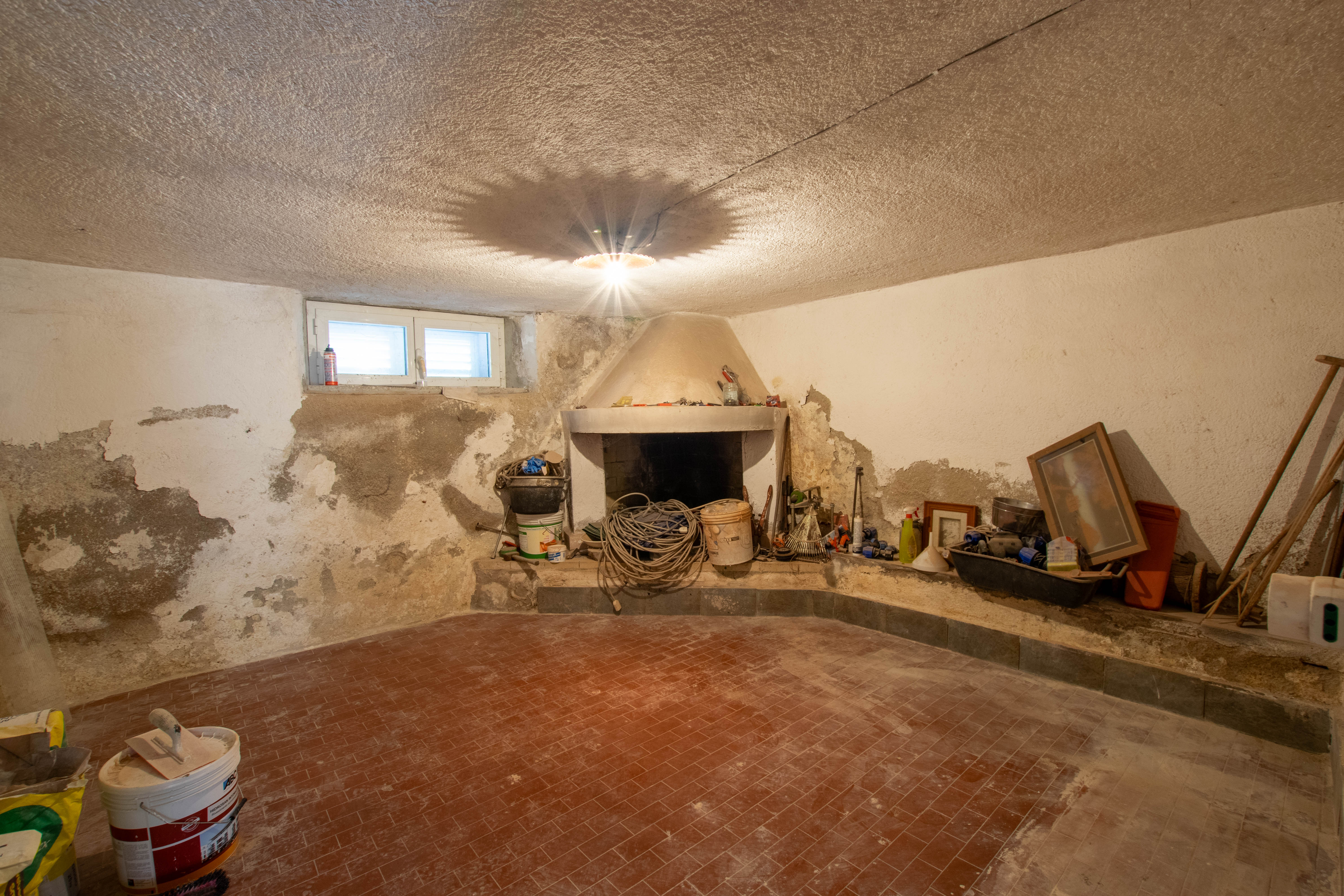 Pièce au sous-sol avec cheminée, idéale comme taverne ou salle de loisirs